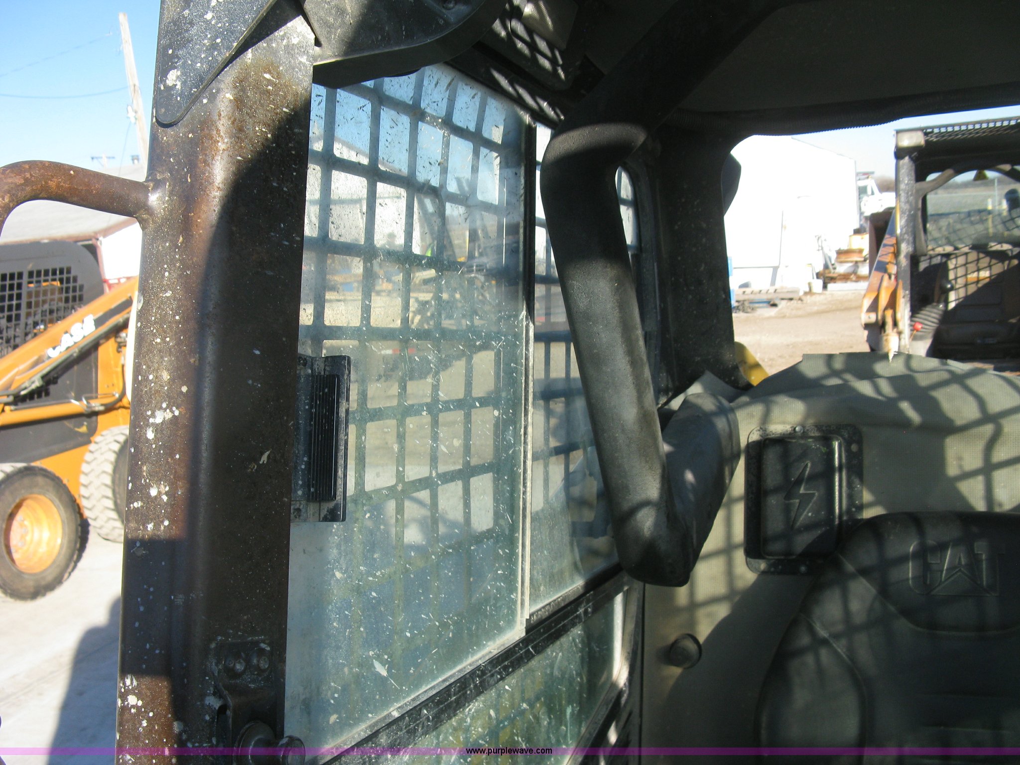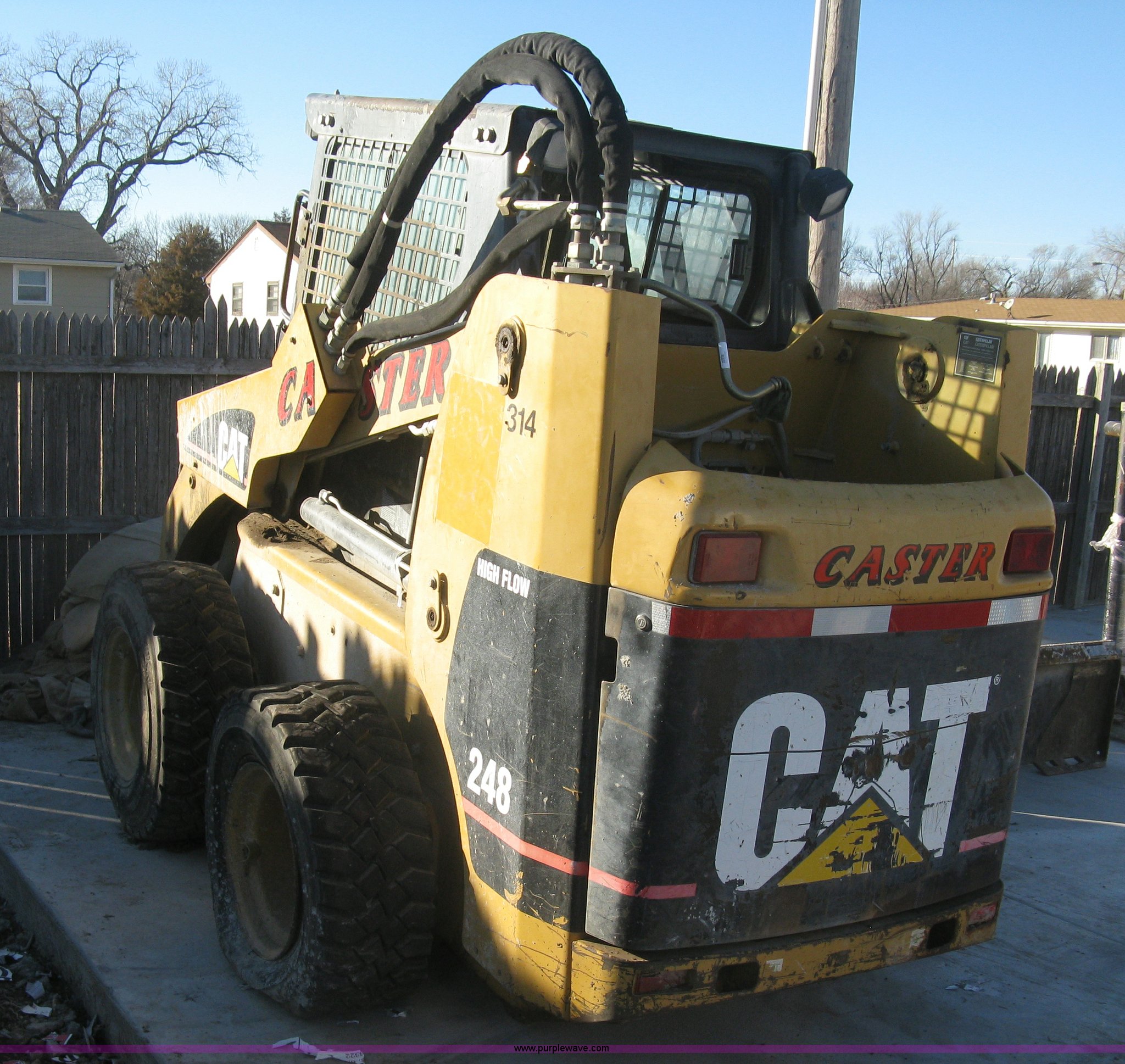 Purple Wave is selling a used Skid Steer Loader in Kansas. This item is a 2002 Caterpillar 248 skid steer with the following: 4,582 hours on meter, Perkins 2.9L four cylinder turbo diesel engine, Model PKXL03.0UC1, Hydrostatic transmission, Enclosed cab, Heat, Joystick controls, Spring suspension seat, Wipers, Front and rear work lights, Manual quick coupler, High Flow auxiliary hydraulics, 12-16.5 tires, 7,571 lbs. base operating weight, Non-operational engine, Holes in block, Engine removed, but included, Rear glass removed, but included, (2) tires off wheel, Serial CAT00248E6LZ01561, Unit# 314