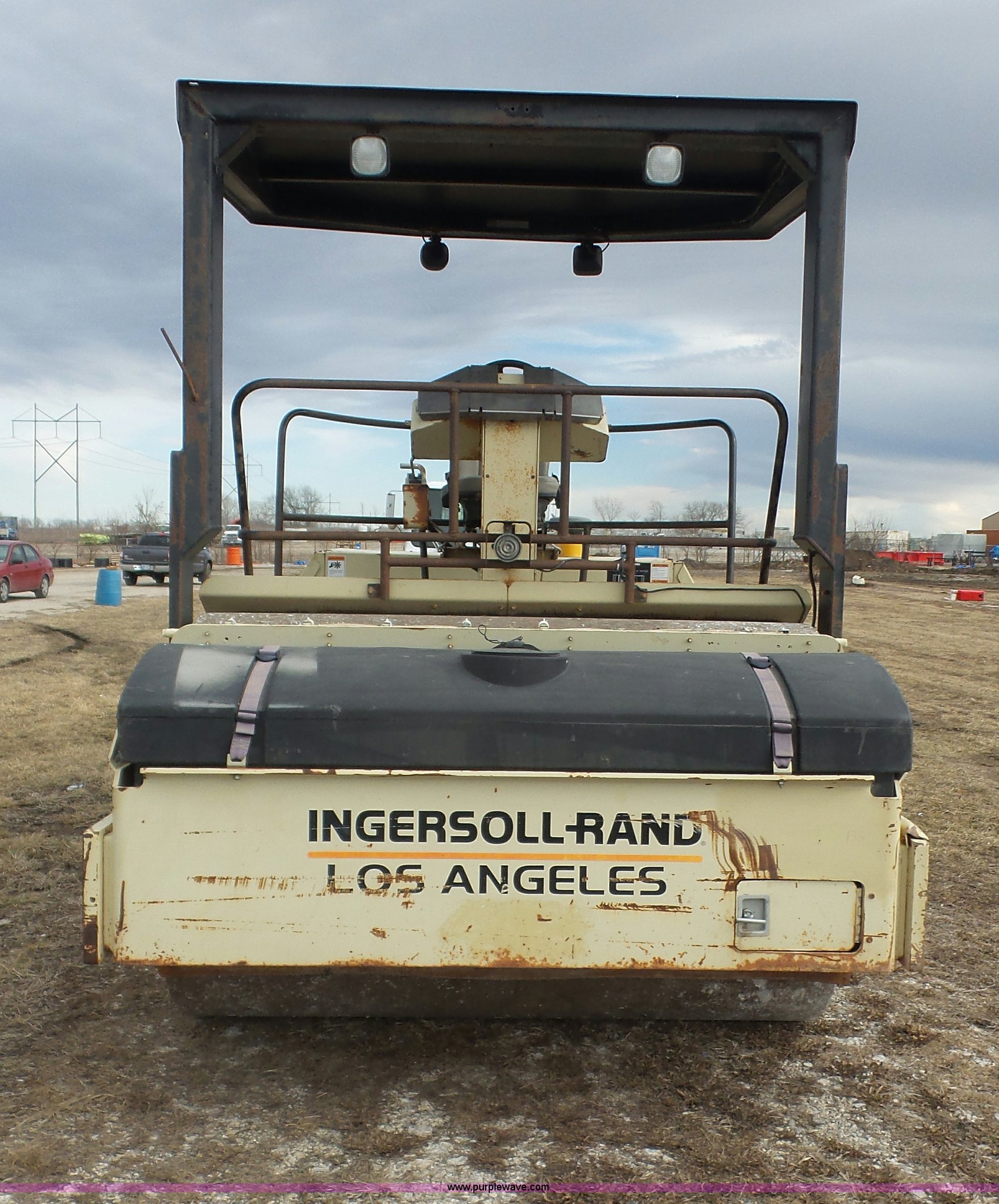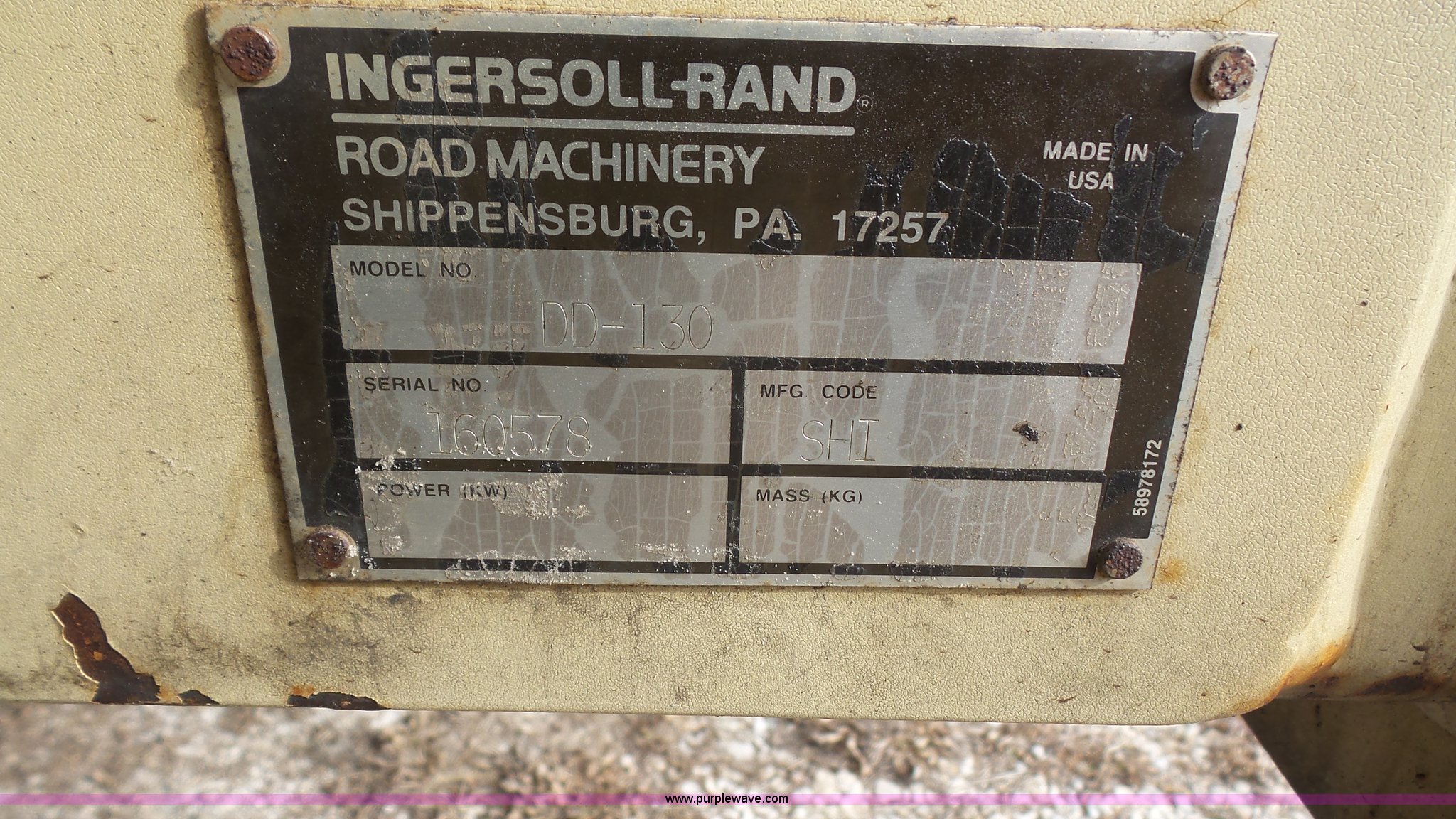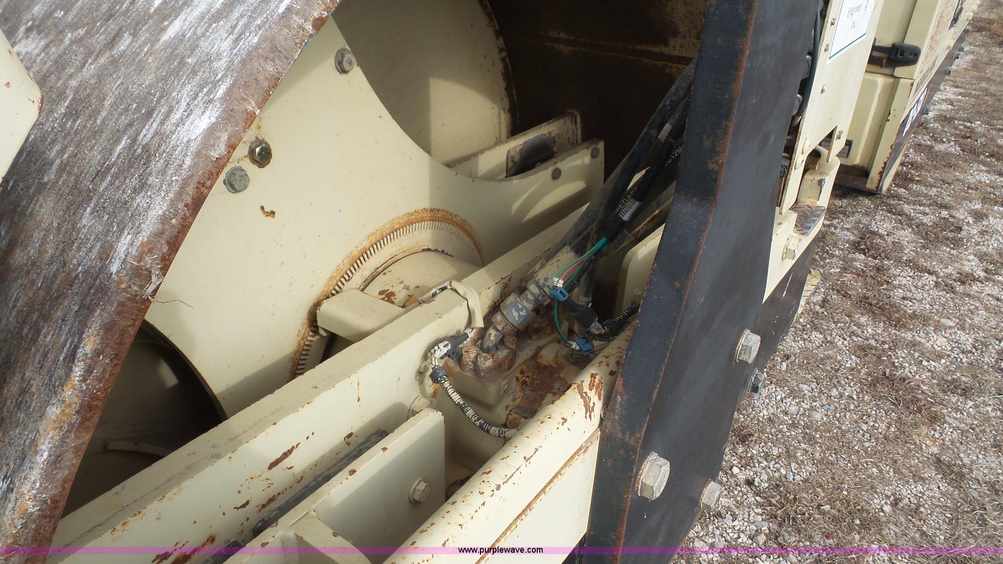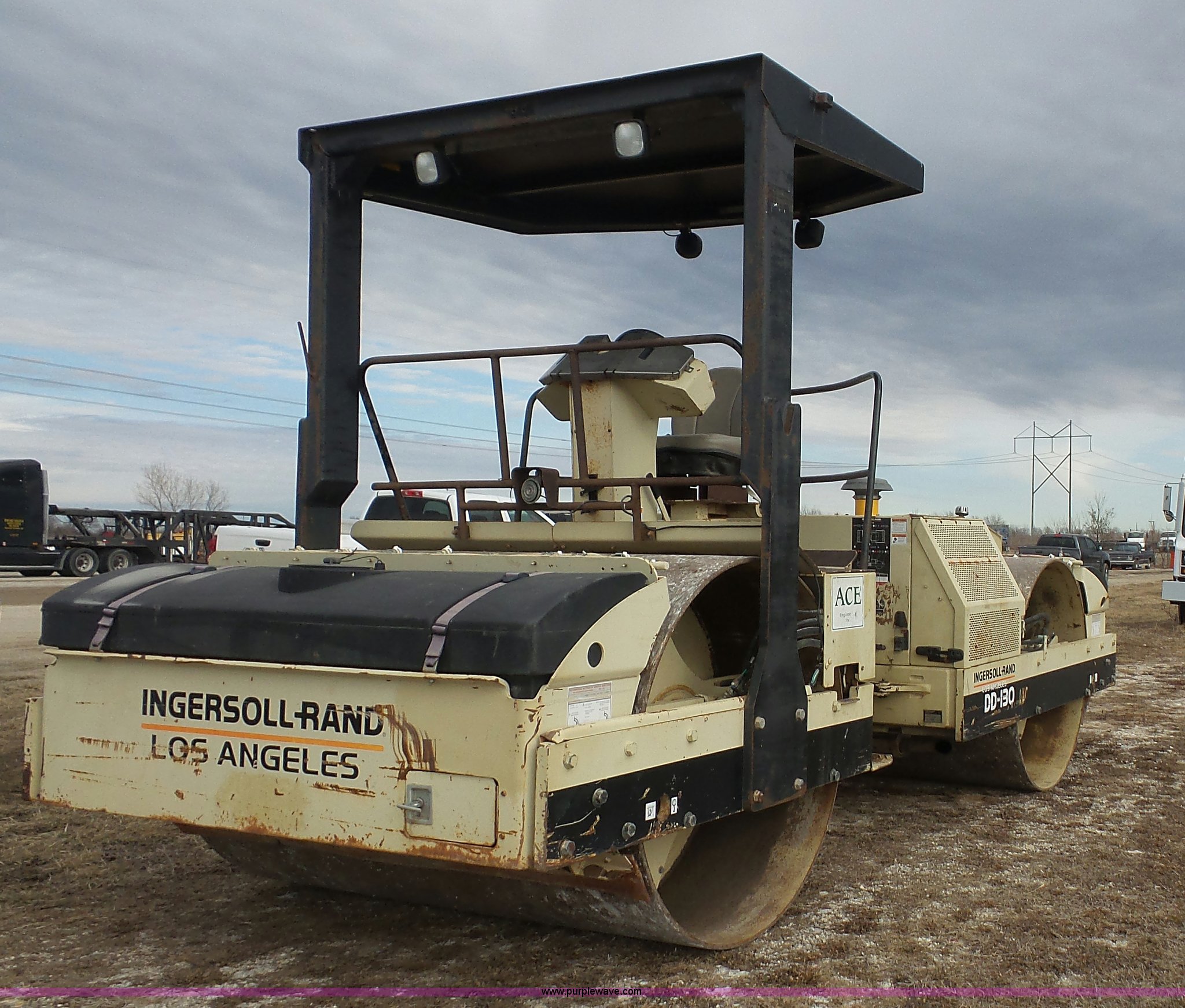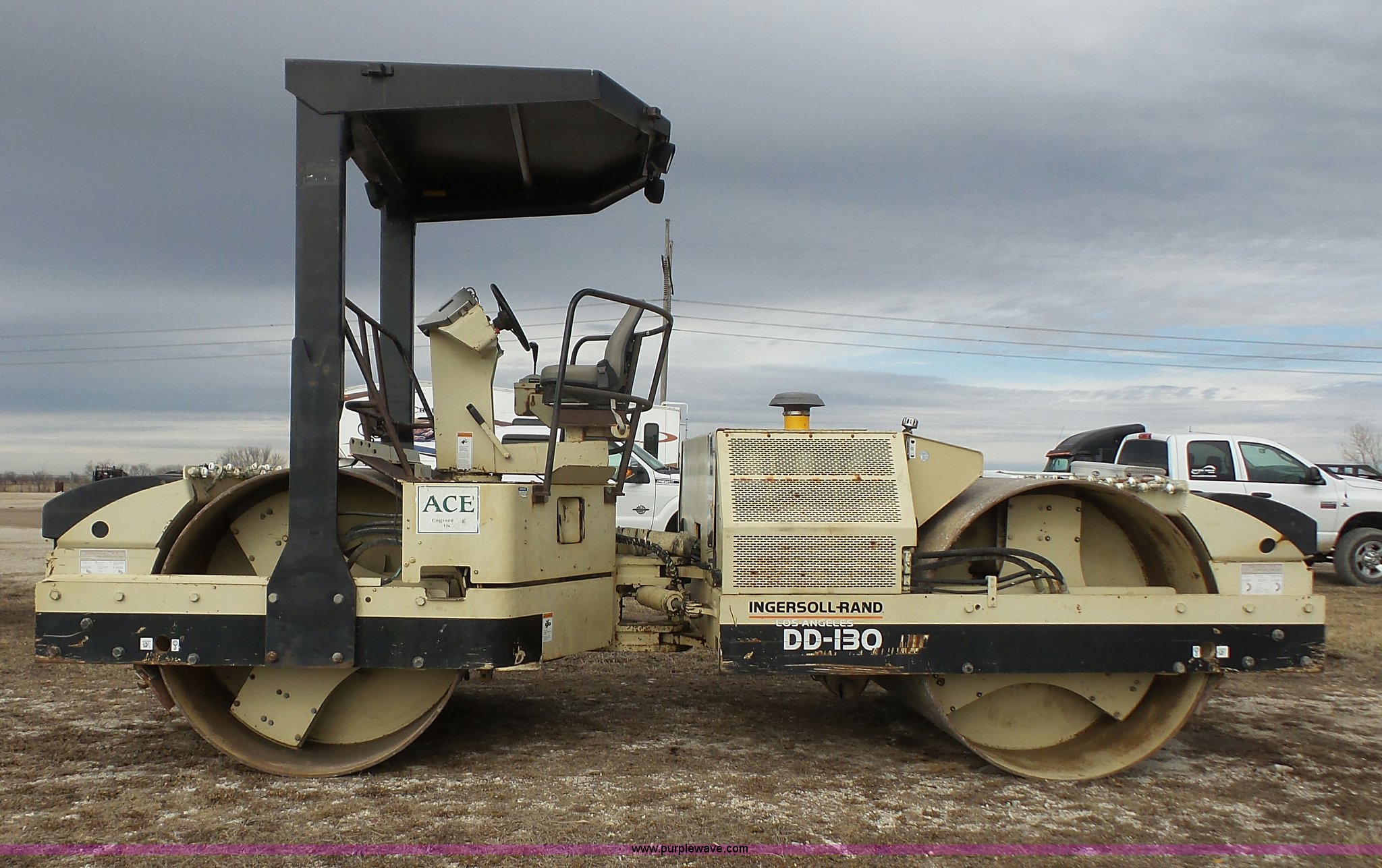 Purple Wave is selling a used Double Drum Roller Compactor in Kansas. This item is a 1999 Ingersoll Rand DD-130 vibratory double drum roller with the following: 3,009 hours on meter, Cummins 5.9L L6 diesel engine, 174 HP, Hydrostatic transmission, OROPS, Canopy, 84"W x 54" diameter smooth drums, Front and rear drum scrapers, Front and rear water application, Independent drum controls, Serial 160578