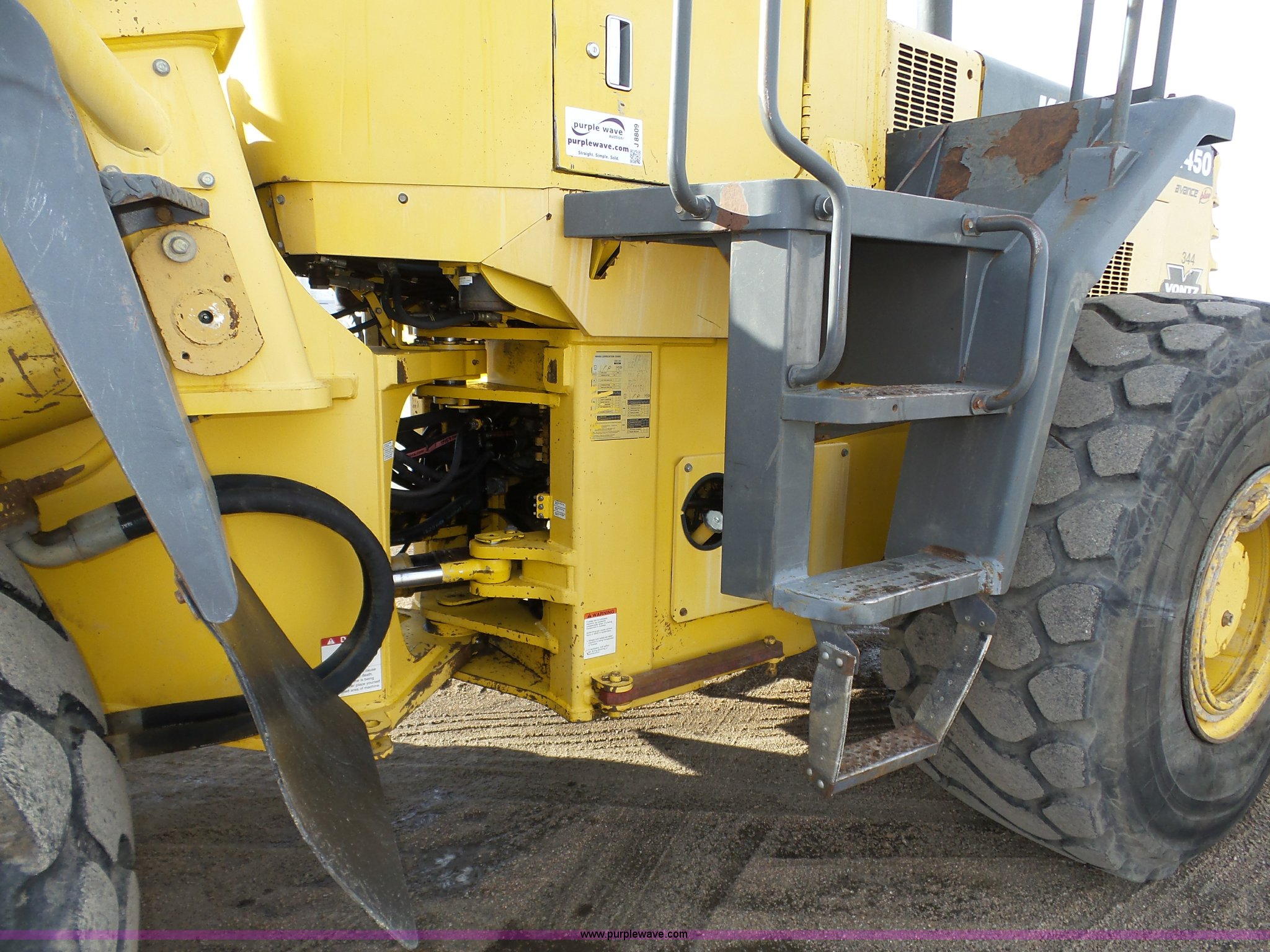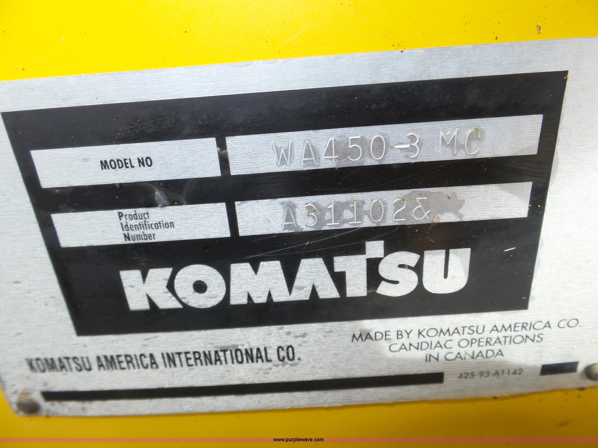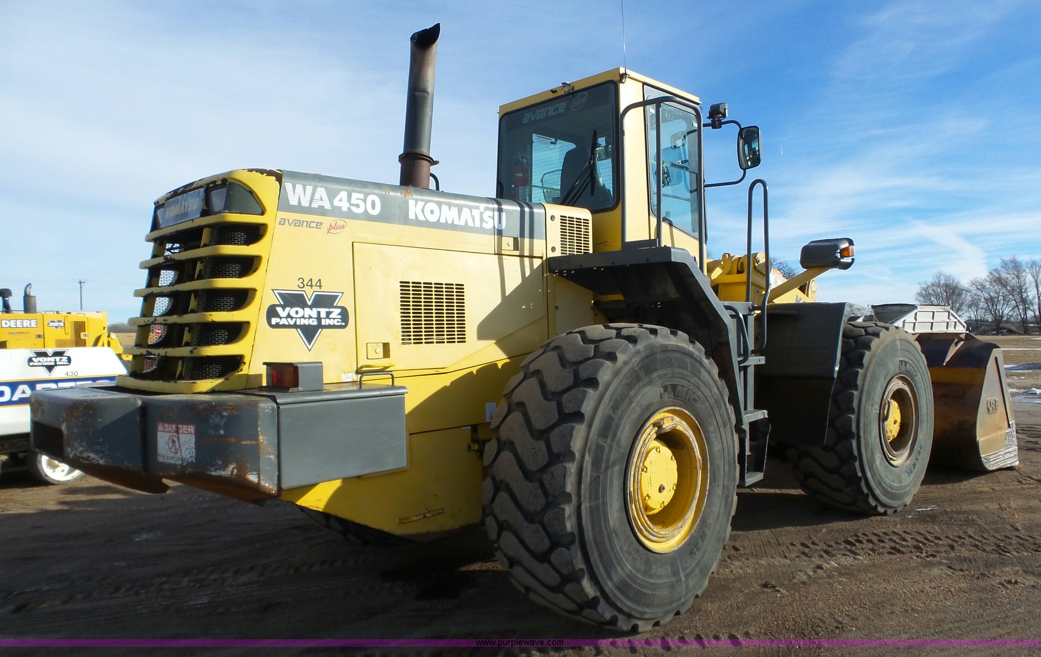 Purple Wave is selling a used Wheel Loader in Nebraska. This item is a 2000 Komatsu WA450-3MC wheel loader with the following: 21,304 hours on meter, Six cylinder turbo diesel engine, Powershift transmission, 4F-4R gears, Enclosed cab, AC and heat, AM/FM/cassette, Tilt steering wheel, Air suspension seat, Two-lever bucket controls, Wipers, Rear window defrost, Front and rear work lights, Backup alarm, 124"W general purpose bucket, 5.5 cu. yd. capacity, Bolt-on cutting edge, 26.5R25 tires, 50,230 lbs. base operating weight, Transmission rebuilt by Komatsu 2014, Head gaskets replaced January 2016, Contents are not included, Serial A31102