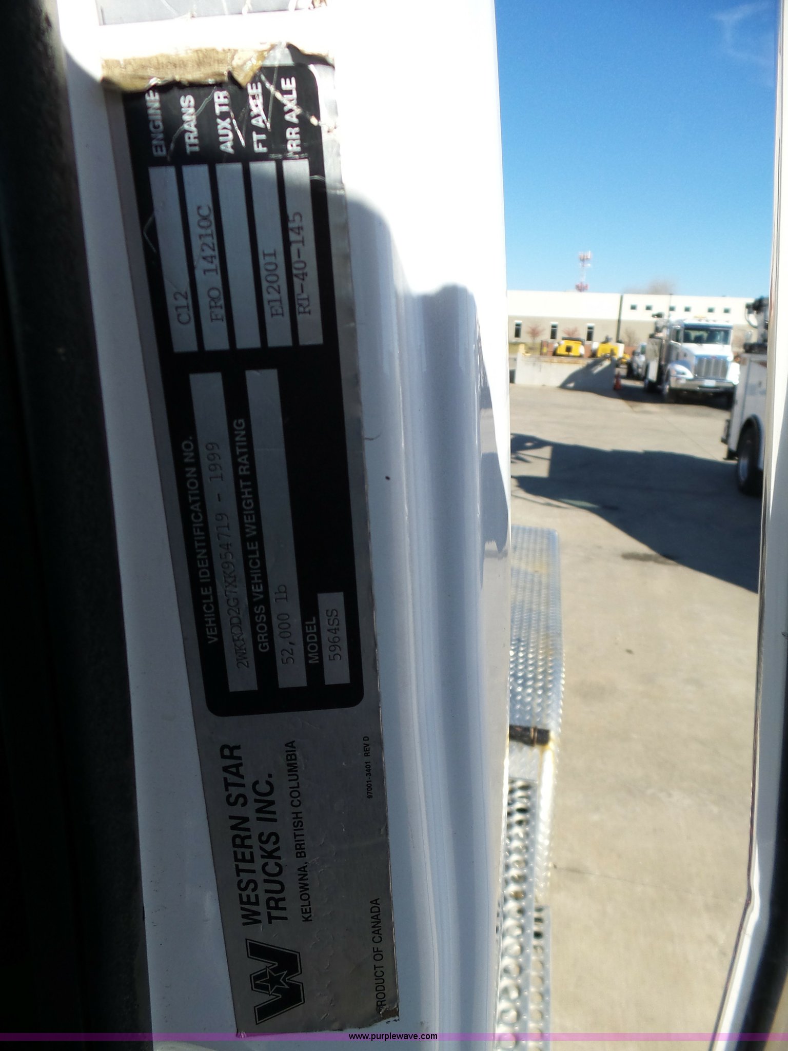 Purple Wave is selling a used Truck Tractor in Missouri. This item is a 1999 Western Star 5964SS semi truck with the following: 404,890 miles on odometer, 14,376 hours on meter, Caterpillar C12 12.0L L6 diesel engine, Serial 9N507202, Eaton Fuller 10 speed manual transmission, Tandem axle, Inter-axle differential lock, AC and heat, AM/FM, Power windows, Heated mirrors, Air suspension seat, PTO, Wet kit, Exterior visor, Auxiliary toolbox, Single rear exhaust stack, Aluminum deck plate, Air operated sliding fifth wheel plate, Single fuel tank, Aluminum full fenders, Air suspension, Air brakes, Aluminum outer wheels, 285/75R24.5 tires, GVWR 52,000 lbs, FAWR 12,000 lbs, IAWR 20,000 lbs, RAWR 20,000 lbs