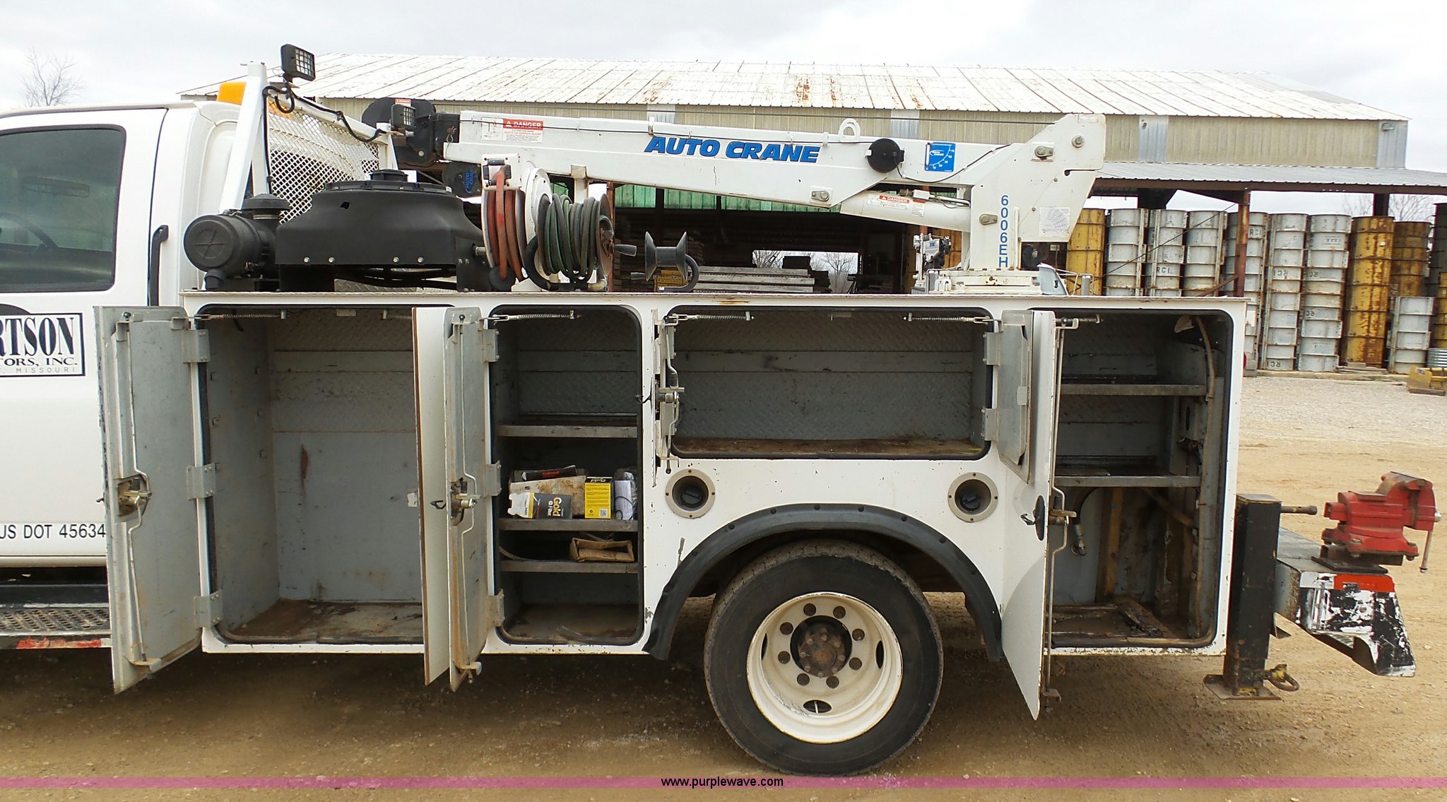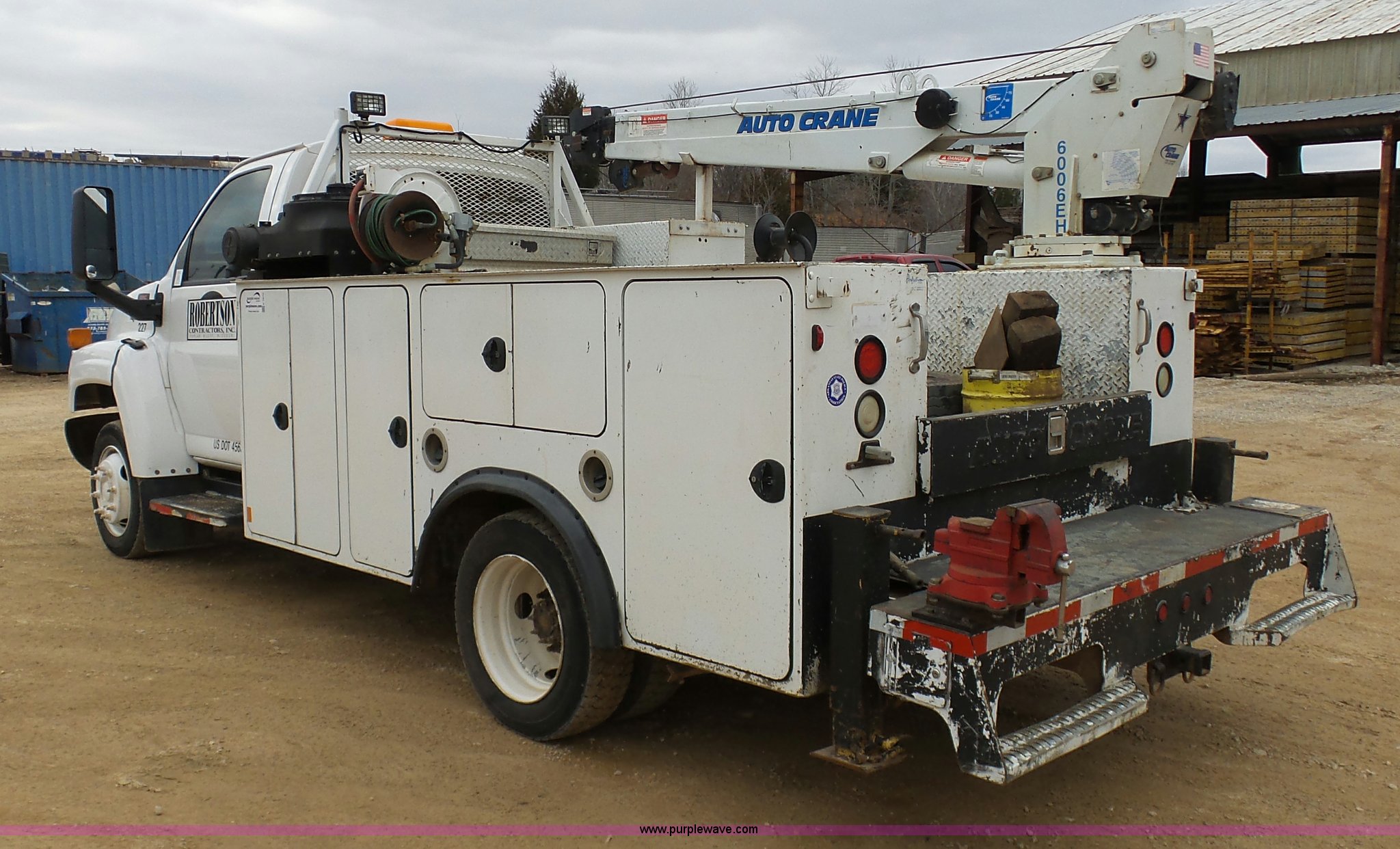 Purple Wave is selling a used Service Truck in Missouri. This item is a 2005 GMC C5500 service truck with crane with the following: 236,758 miles on odometer, 6.6L V8 turbo diesel engine, Engine replaced, Approximately 160,000 miles on engine,, Automatic transmission, AC and heat, Tilt, Cruise, AM/FM, Boss under mount PTO, Auto Crane service bed, 11'L, Air compressor, Rear vise, Auto Crane 6006EH crane, 6,000 lbs maximum lift capacity, Receiver hitch, Trailer wiring, 225/70R19.5 tires