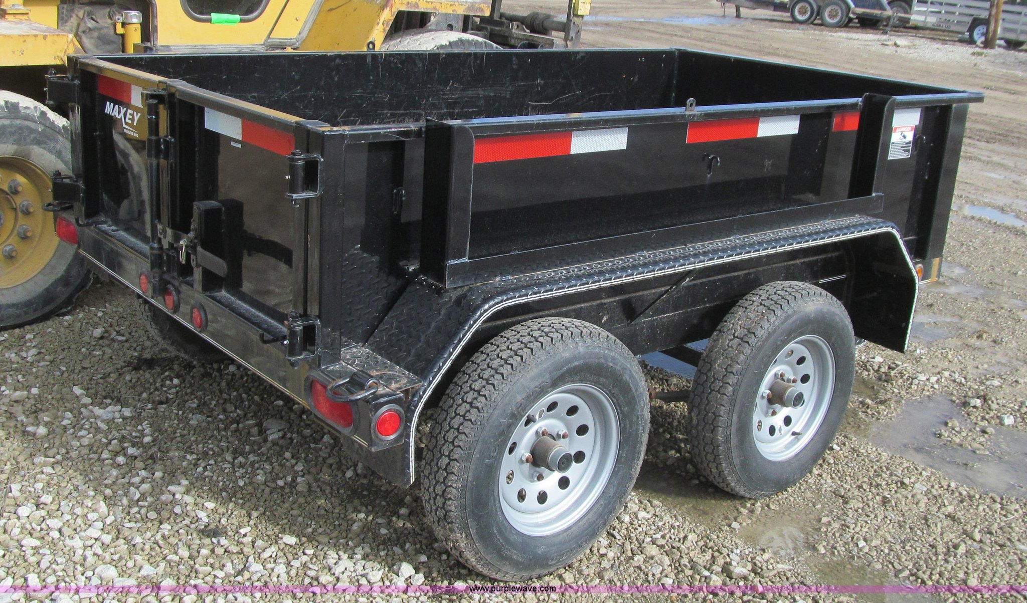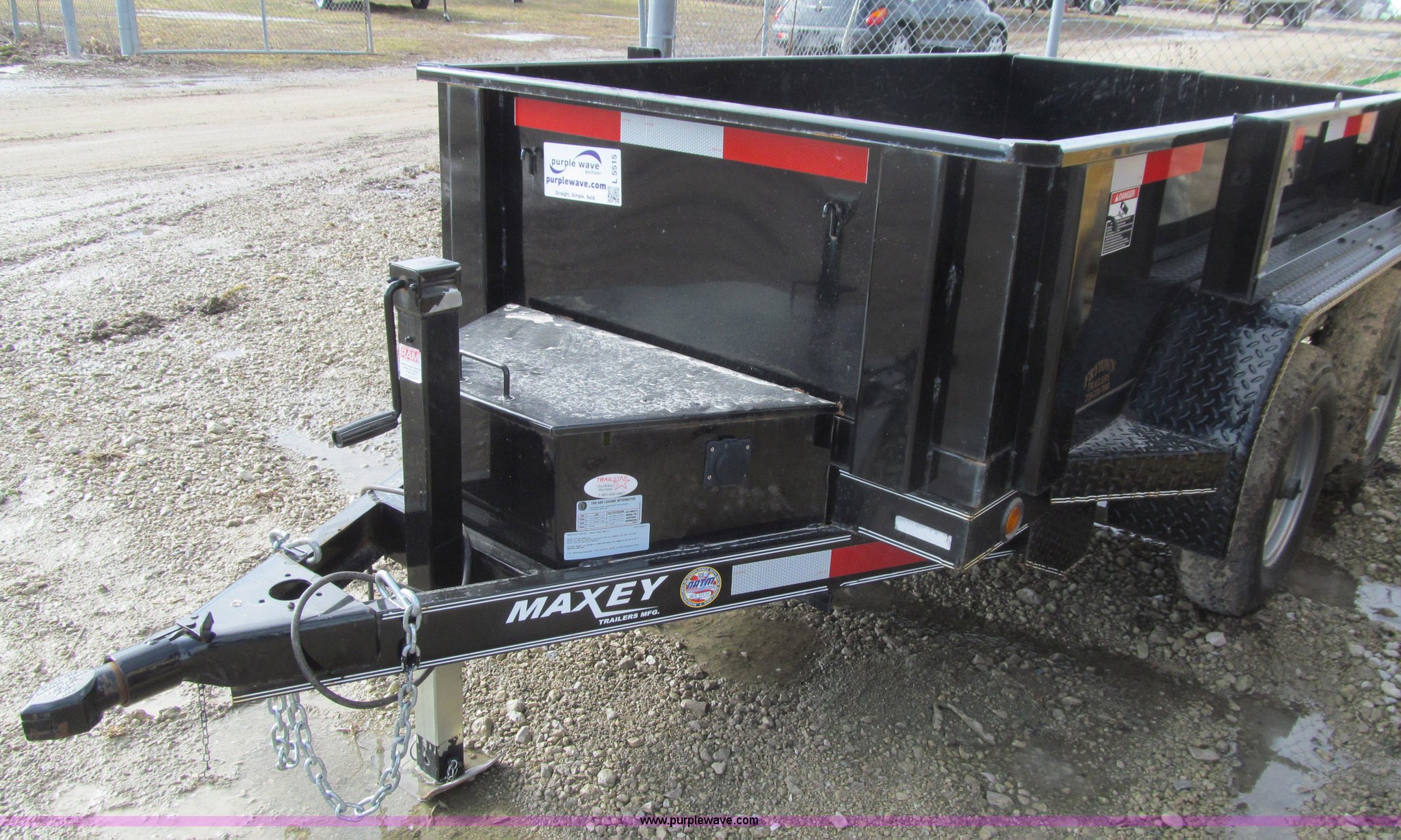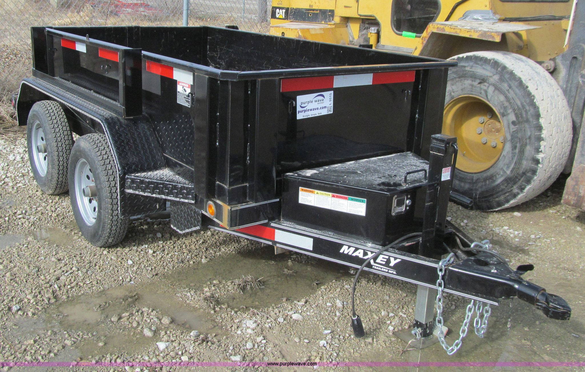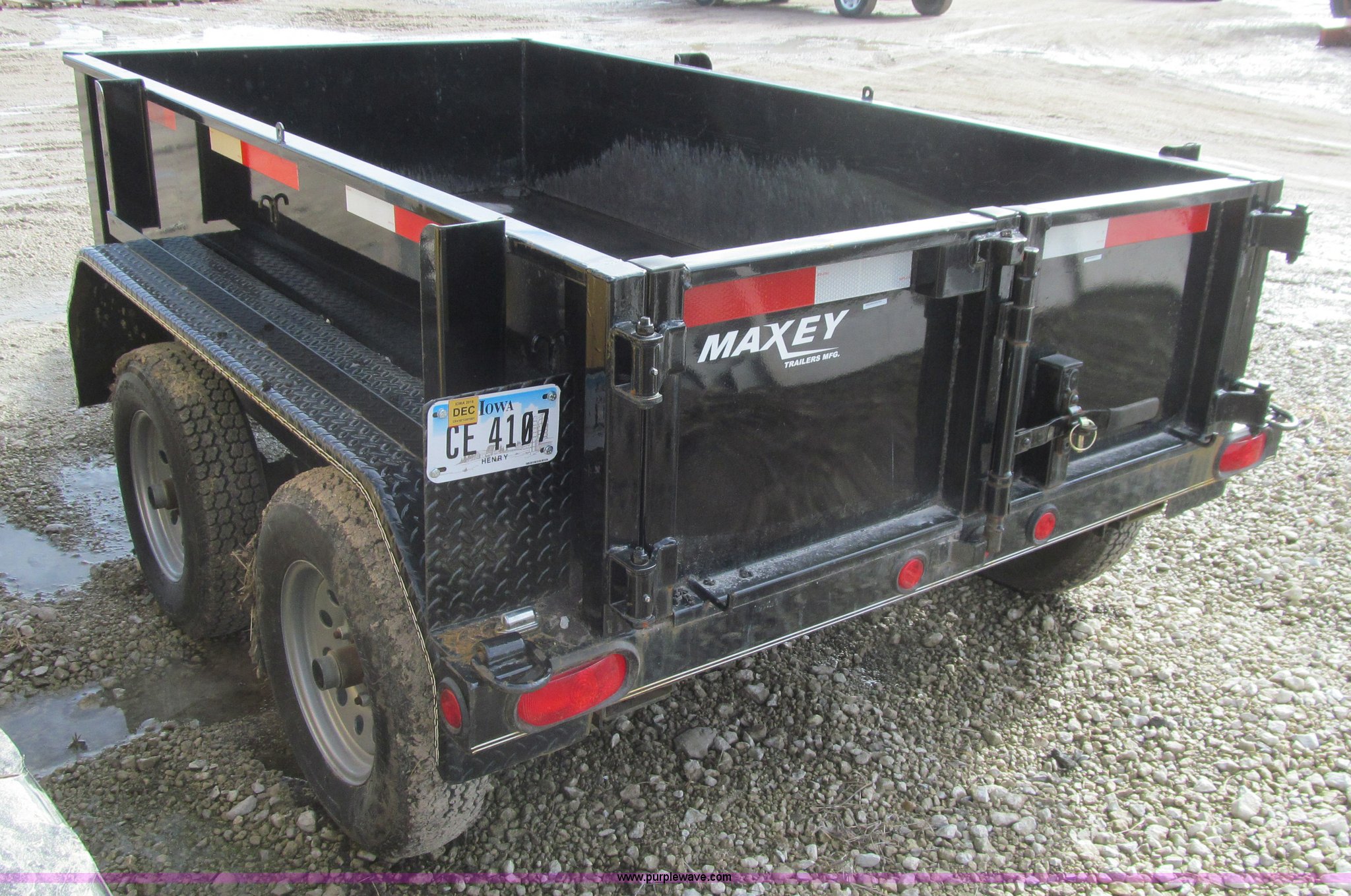 Purple Wave is selling a used End Dump Rock Trailer in Iowa. This item is a 2013 Maxey end dump trailer with the following: 96"L x 50"W dump bed, Internal lash rings, Rear bi-fold gate, Electric/hydraulic dump, Control cord, Battery charger, 2" ball hitch, Safety chains, Tongue jack, Spring suspension, Tandem axle, ST175/80D13 tires, GVWR 4,000 lbs, GAWR 2,000 lbs, Unused, Previously used as a demo unit