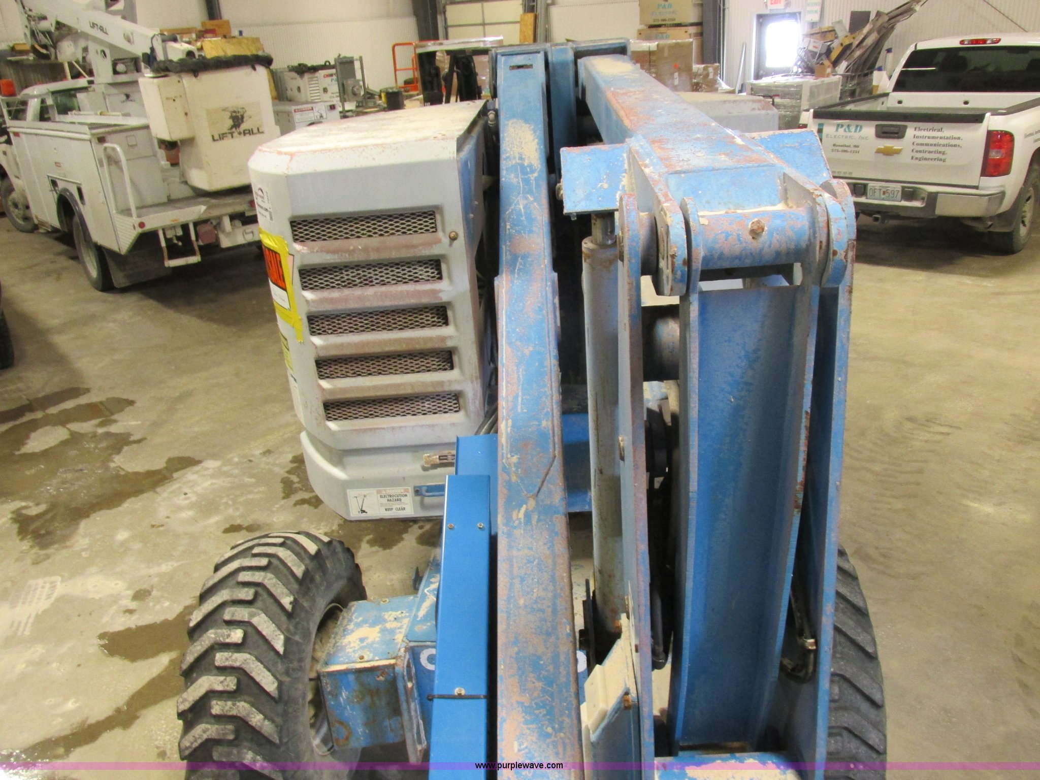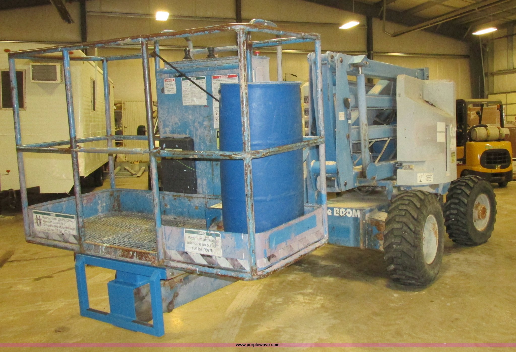 Genie Z45 boom lift. Four cylinder dual fuel engine Gas and propane capable, Serial 57652-1-09-98, 500 lbs maximum lift capacity, 22' maximum reach, 45' maximum lift height, Articulating boom, Platform and ground controls, AC power outlet, Platform rotation, 14-17.5 tires, Serial Z45008973. View equipment video. P & D Electric. 1401 CR 425. Hannibal, MO 63401