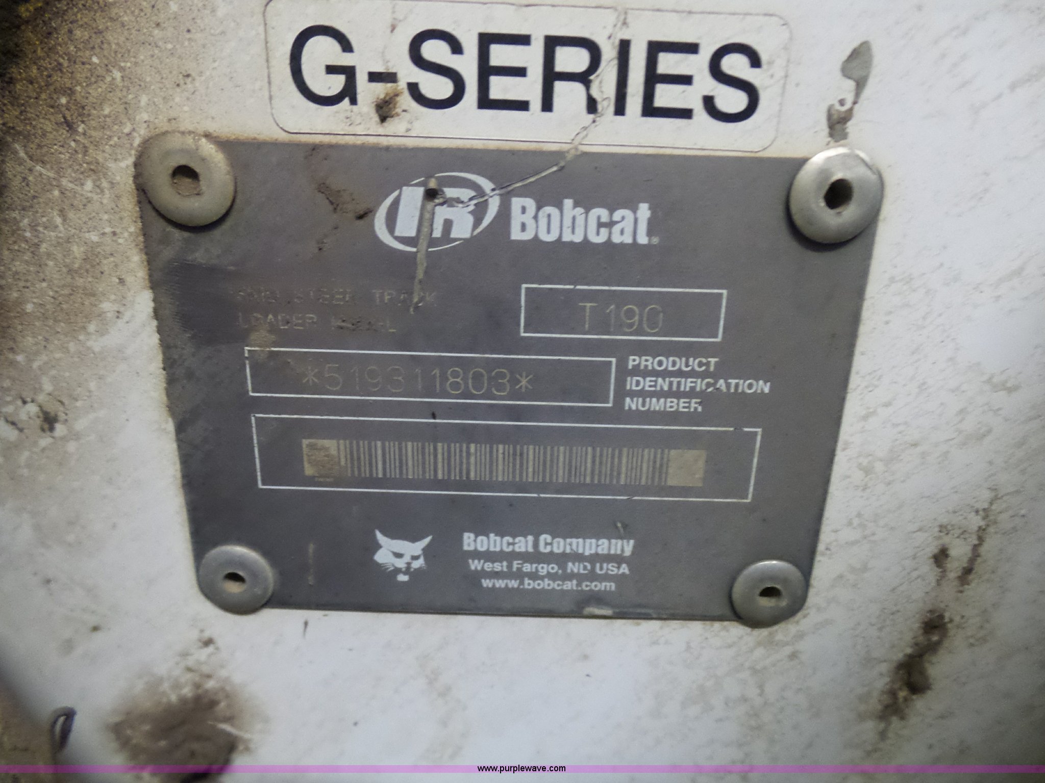 2001 Bobcat T190 skid steer. 2,811 hours on meter, Hours may vary, unit is still in use, Kubota V2003-TE 2.0L four cylinder turbo diesel engine Serial 01L1300, Glow plugs, Two speed hydrostatic transmission, Enclosed cab, AC and heat, Joystick controls, Caterpillar 68"W low profile bucket Bolt-on cutting edge, High flow auxiliary hydraulics, Front work lights, Three bottom rollers, 12"W tracks, 7,775 lbs. base operating weight, Recently replaced blower motor, Recently serviced, Service records available upon request, Serial 519311803. Kansas City Master Company. 13501 Arrington Road. Grandview, MO 64030