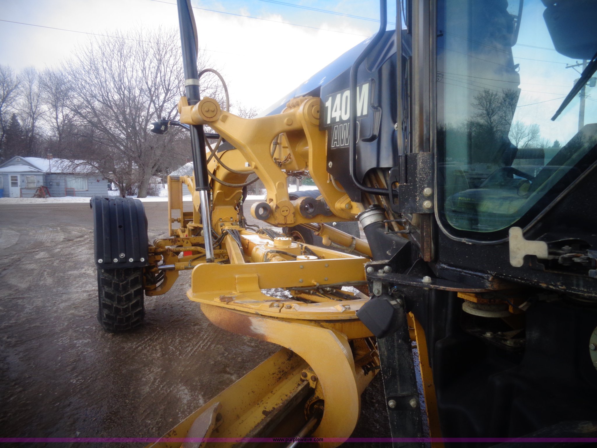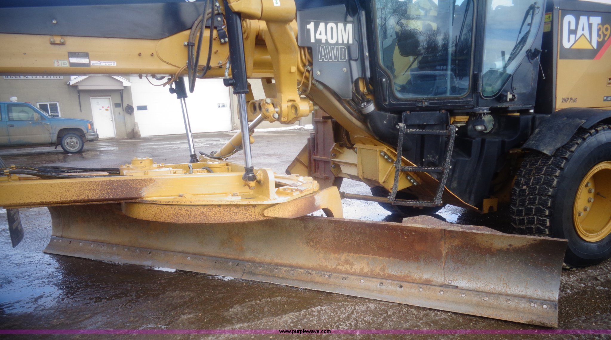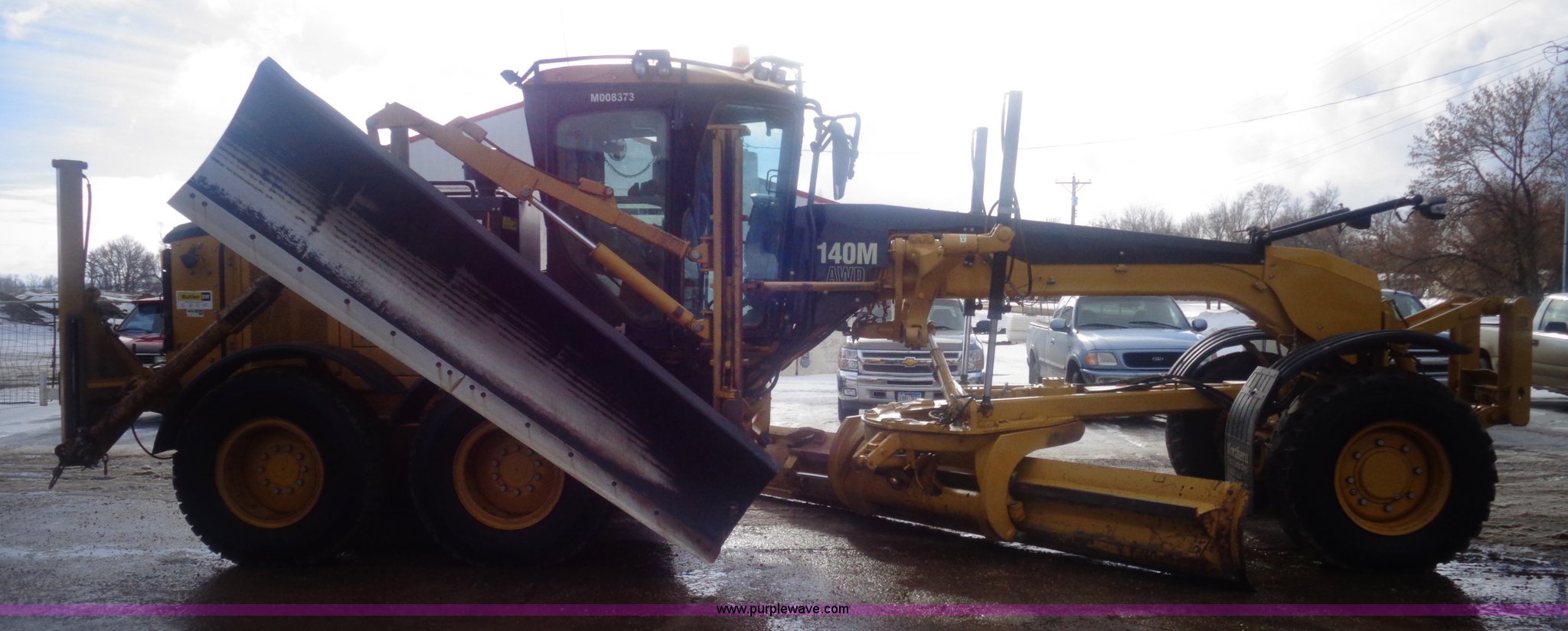 Purple Wave is selling a used Motor Grader in South Dakota. This item is a 2009 Caterpillar 140M motor grader with the following: 9,009 hours on meter, Caterpillar C7 six cylinder diesel engine, Serial KHX14747, Powershift direct drive transmission, 8F gears, All wheel drive, Differential lock, AC and heat, AM/FM, 16' moldboard, Balderson 12' wing blade, Front mounted lift group, Michelin 17.5R25 tires, Serial CAT0140MHB9G00163