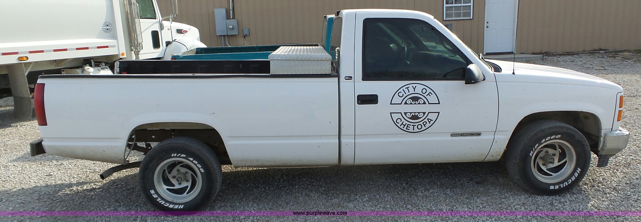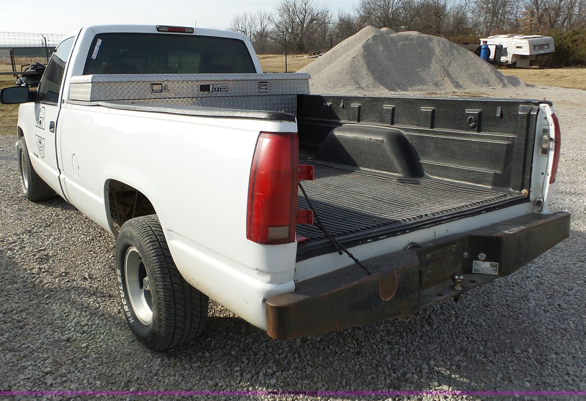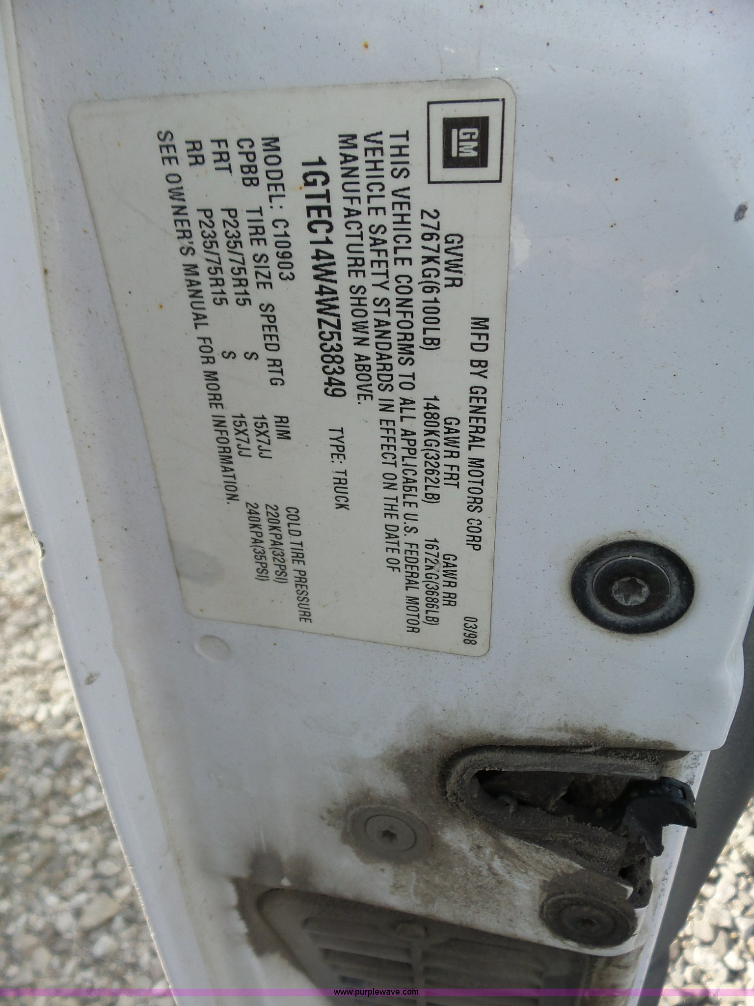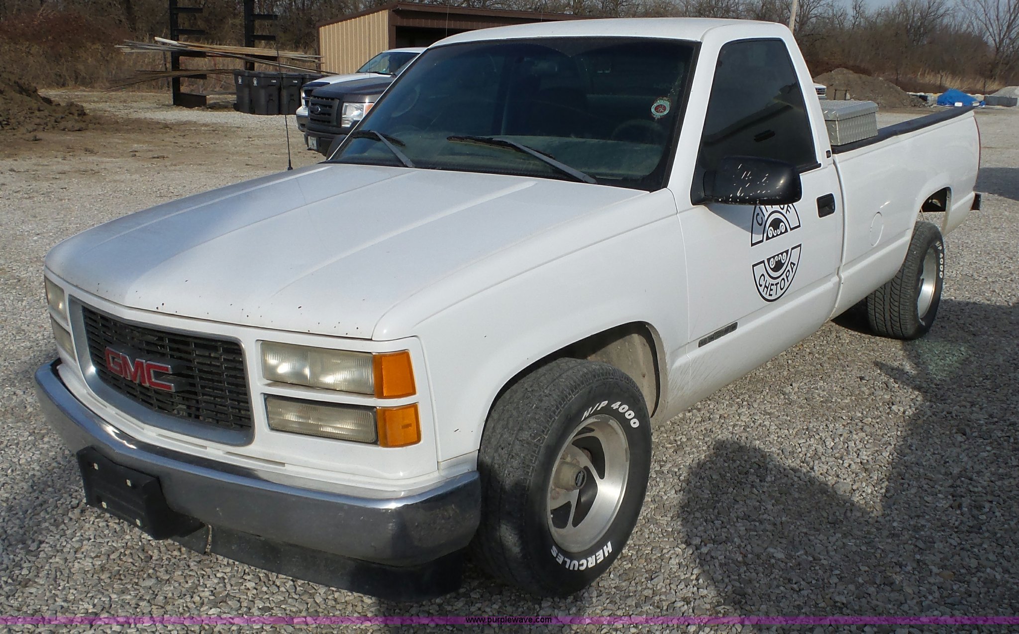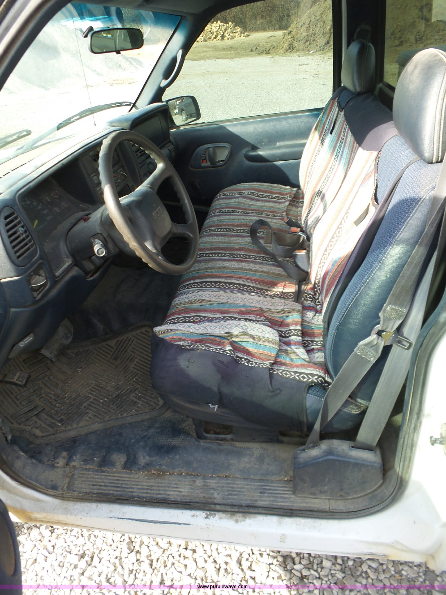 Purple Wave is selling a used 1/2 Ton Pickup or Van in Kansas. This item is a 1998 GMC Sierra 1500 pickup truck with the following: 313,077 miles on odometer, 4.3L V6 OHV 12V gas engine, Automatic transmission, AC and heat, Tilt, Cruise, AM/FM/cassette, Manual windows and locks, Cloth interior, P275/60R15 tires, Interior/exterior cosmetic damage, Cracked windshield