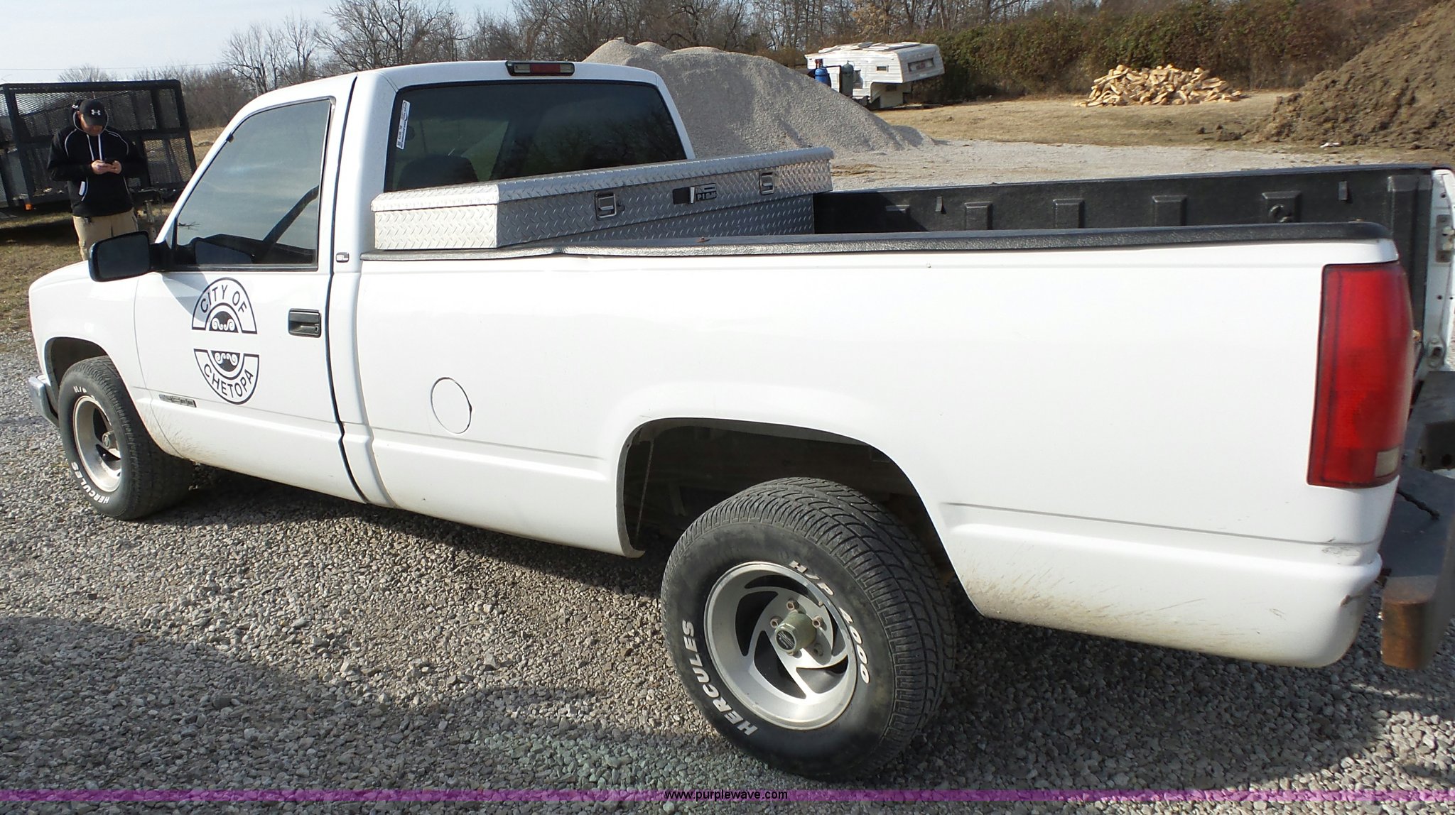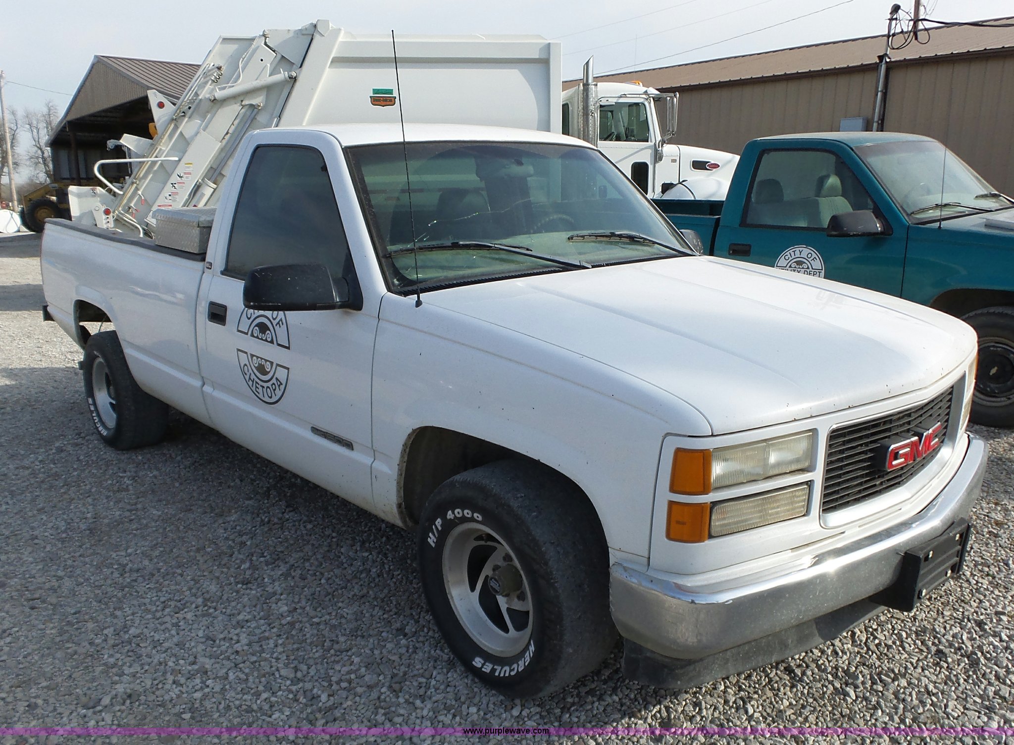 1998 GMC Sierra 1500 pickup truck. 313,077 miles on odometer, 4.3L V6 OHV 12V gas engine, Automatic transmission, AC and heat, Tilt, Cruise, AM/FM/cassette, Manual windows and locks, Cloth interior, P275/60R15 tires, Interior/exterior cosmetic damage, Cracked windshield. 1GTEC14W4WZ538349. City of Chetopa. 618 N 11th. Chetopa, KS 67336