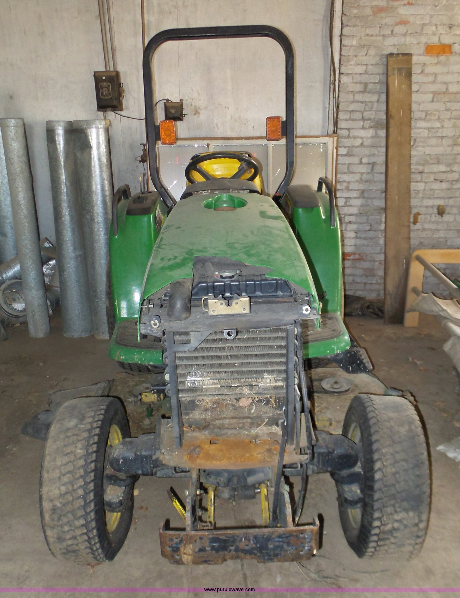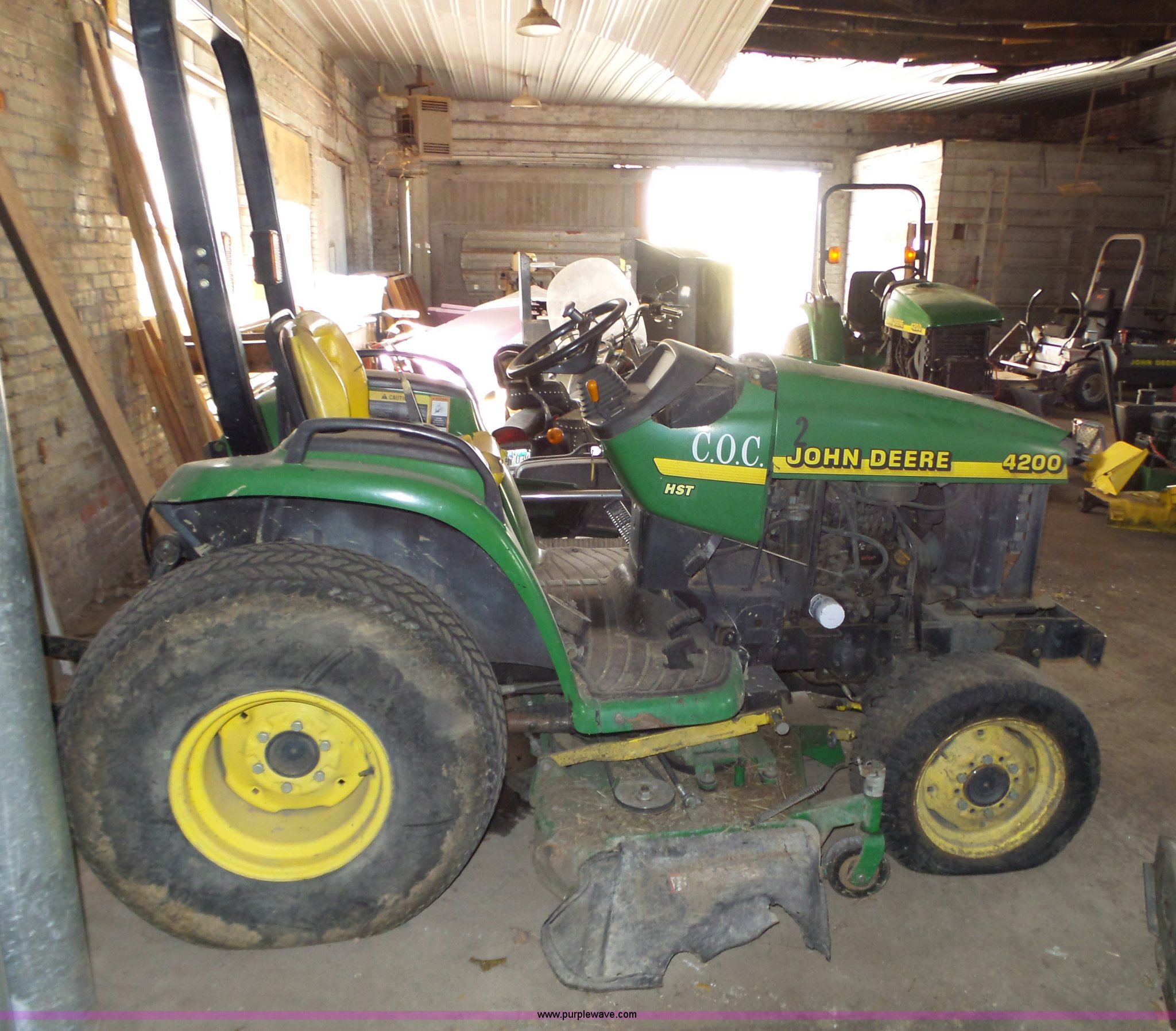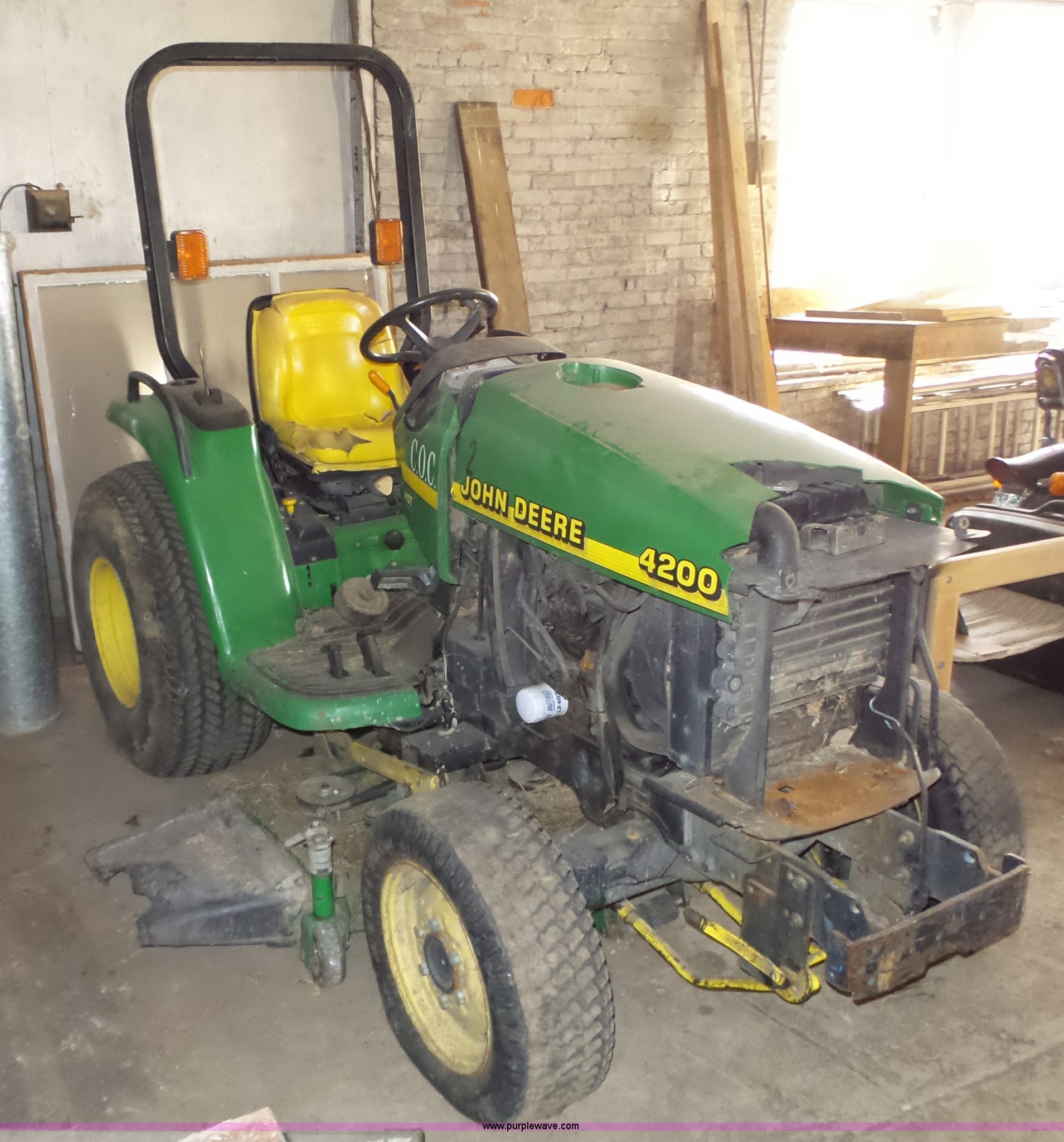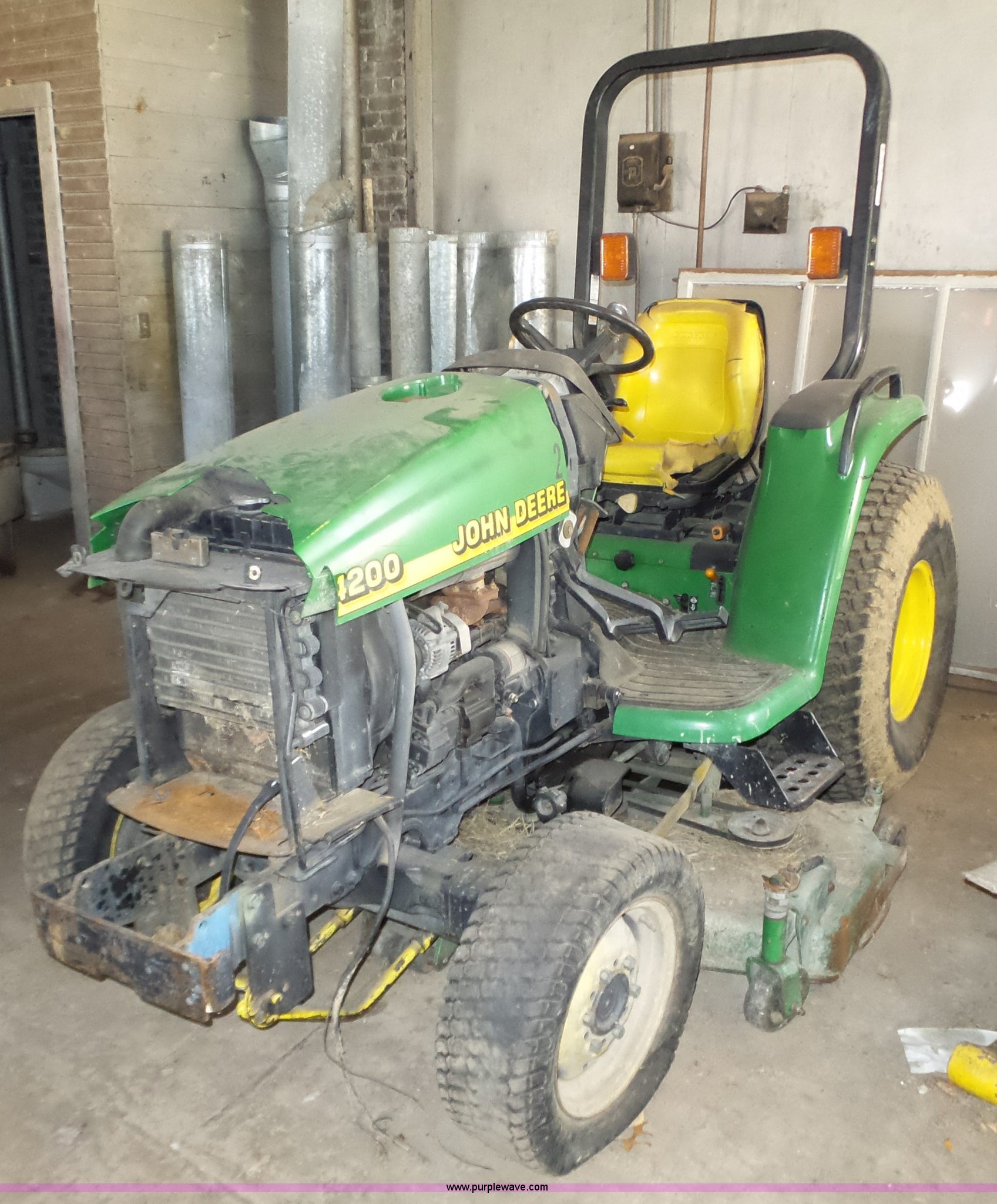 Purple Wave is selling a used Tractor in Kansas. This item is a John Deere 4200 tractor with the following: Three cylinder diesel engine, Hydrostatic transmission, 3F-3R gears, Non-operational, Three point, 540 PTO, 60" belly mower, 13.6-16 tires, Serial LV4200H320209
