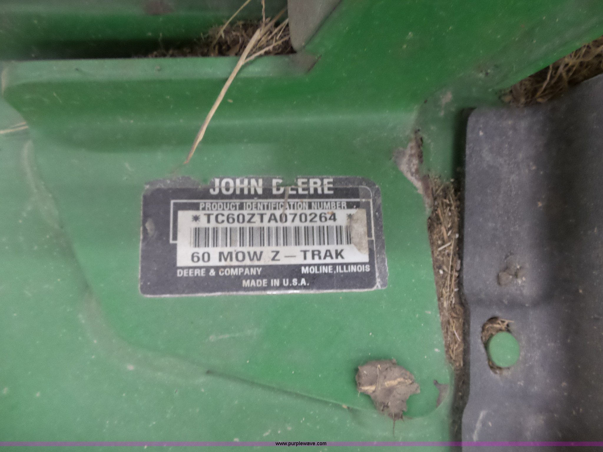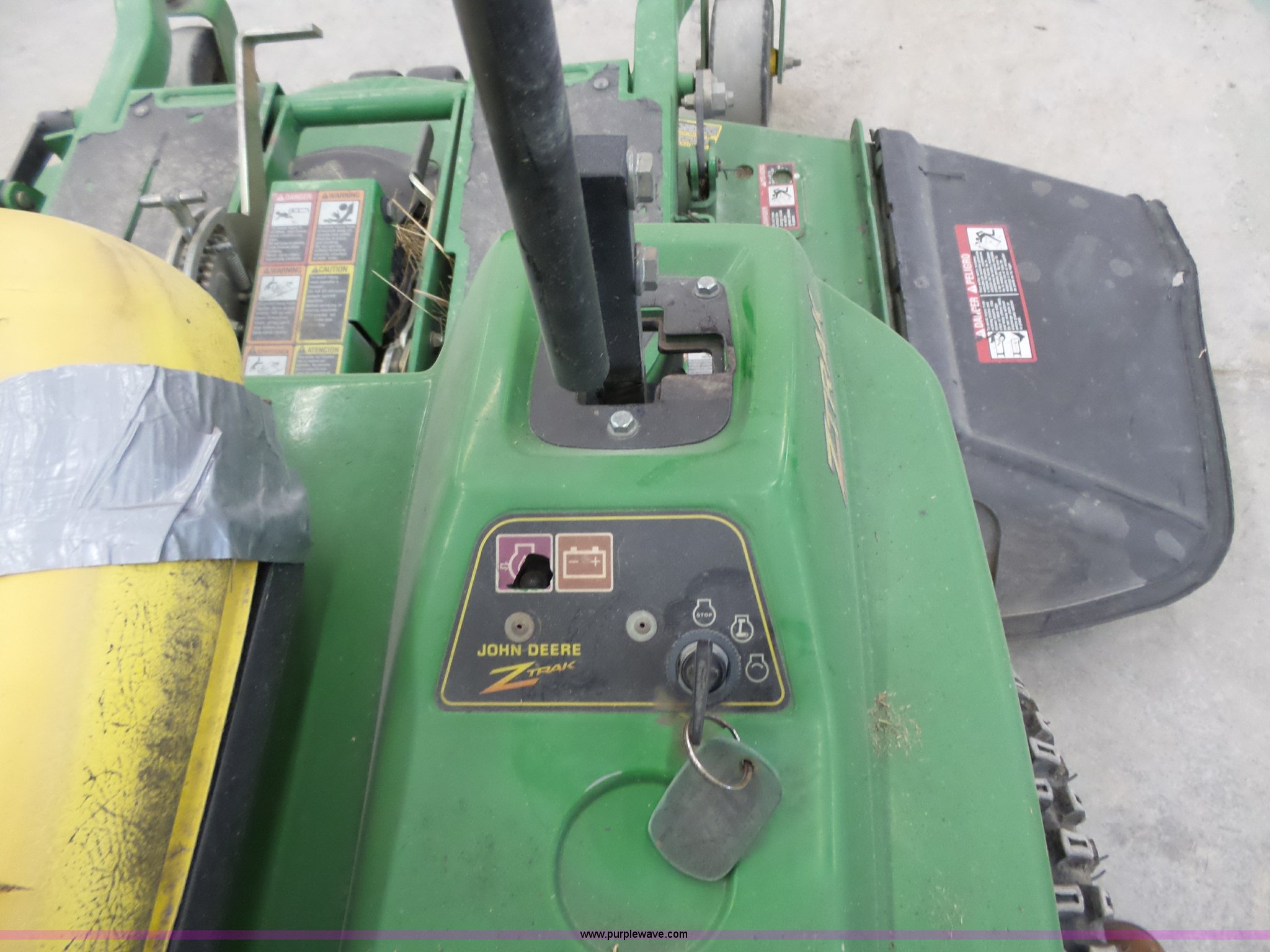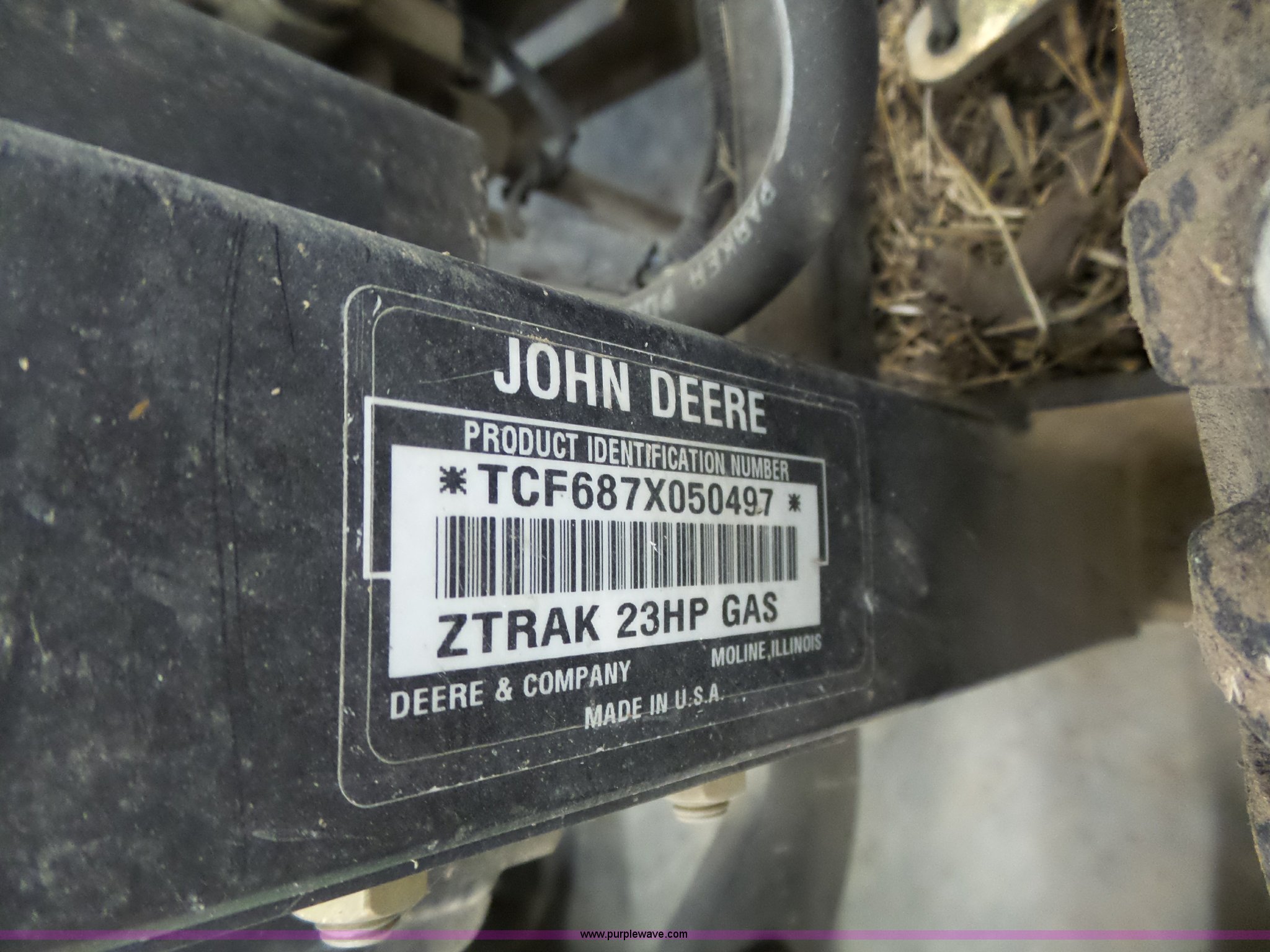 Purple Wave is selling a used Lawn Mower in Kansas. This item is a 2006 John Deere F687 Z-Trak lawn mower with the following: 924 hours on meter, 60"W cutting capacity, Kohler gas engine, 23 HP, Vinyl seat, Foam filled deck and rear tires, Air filled drive tires, Serial TCF687X050497