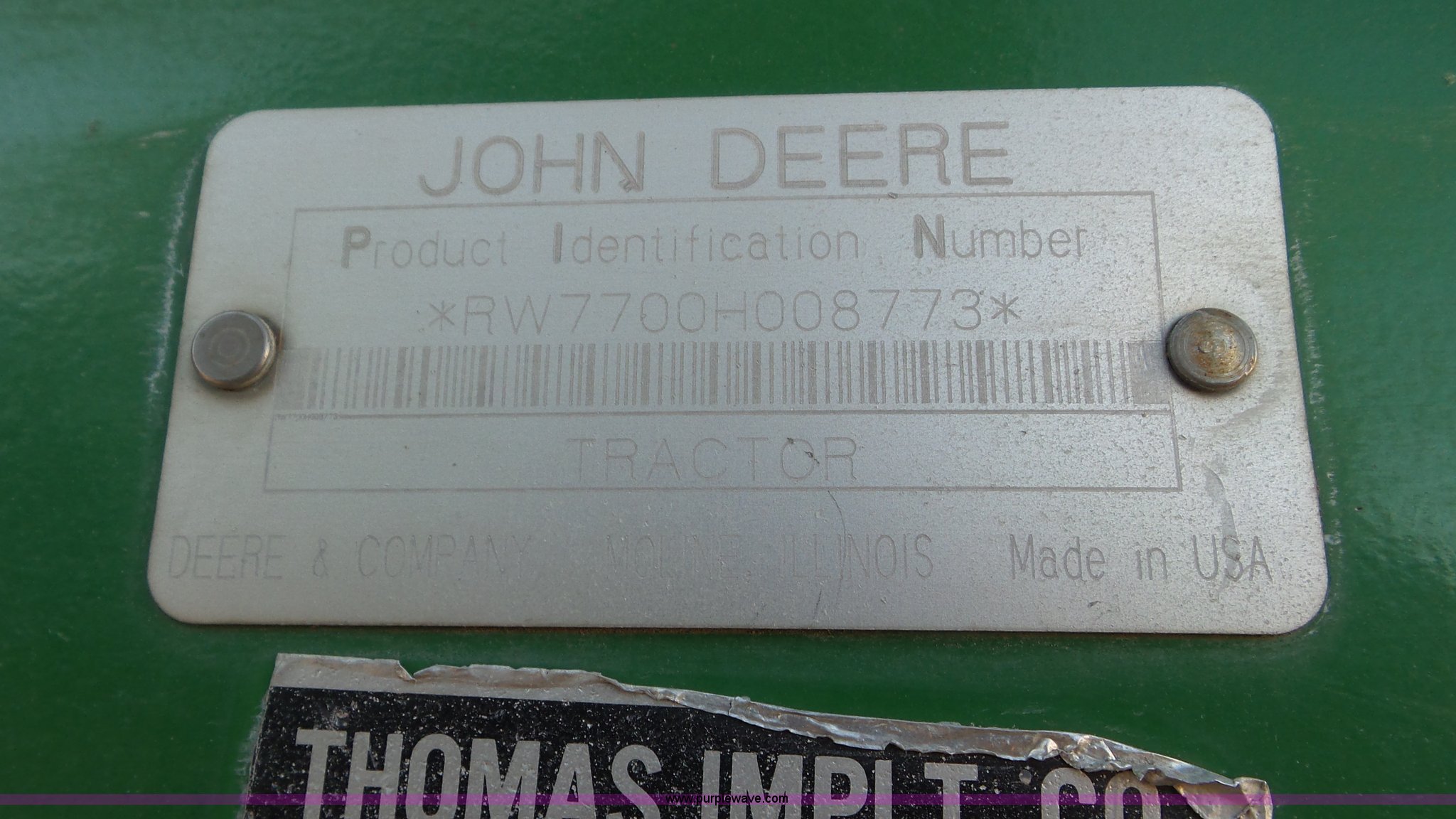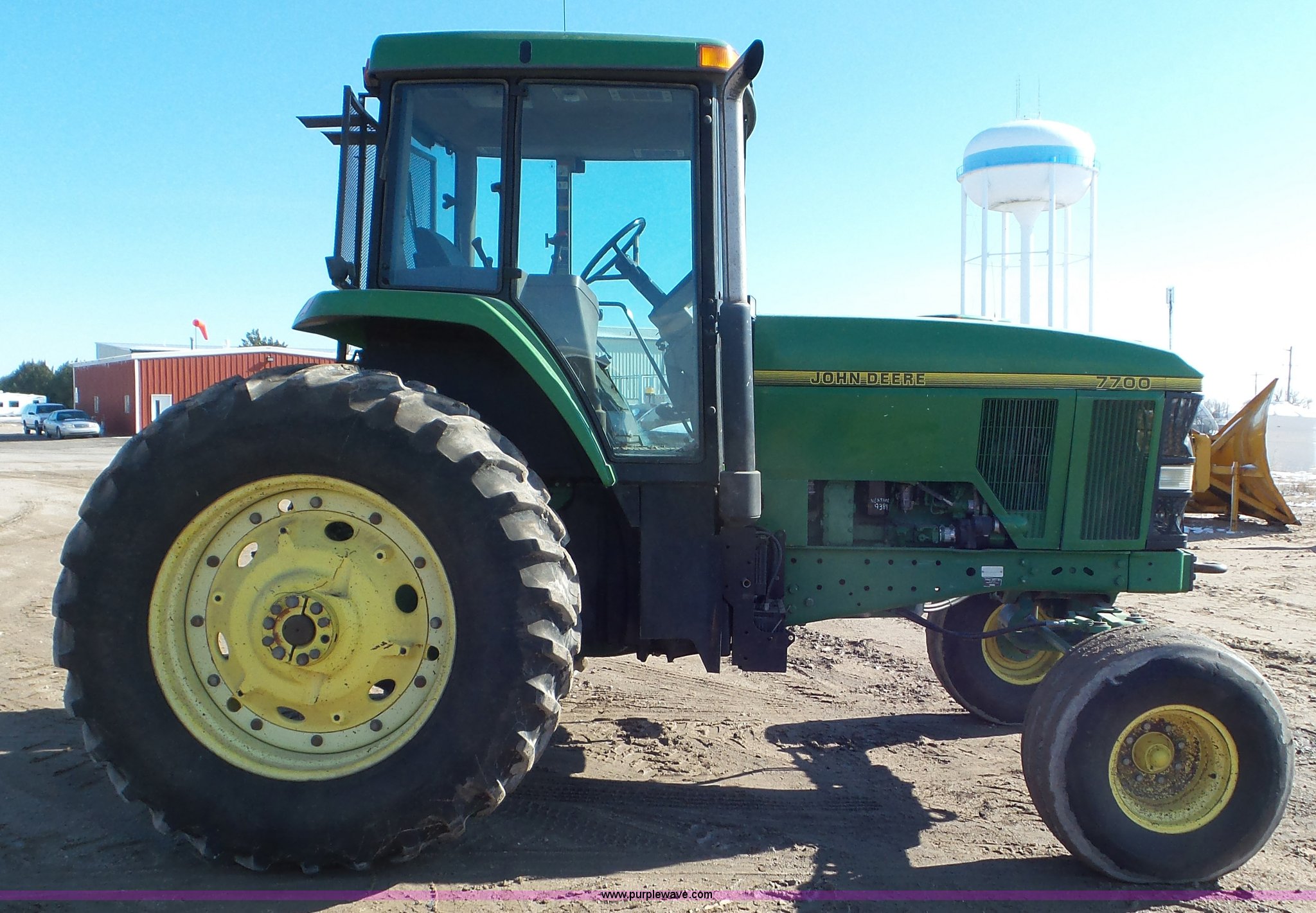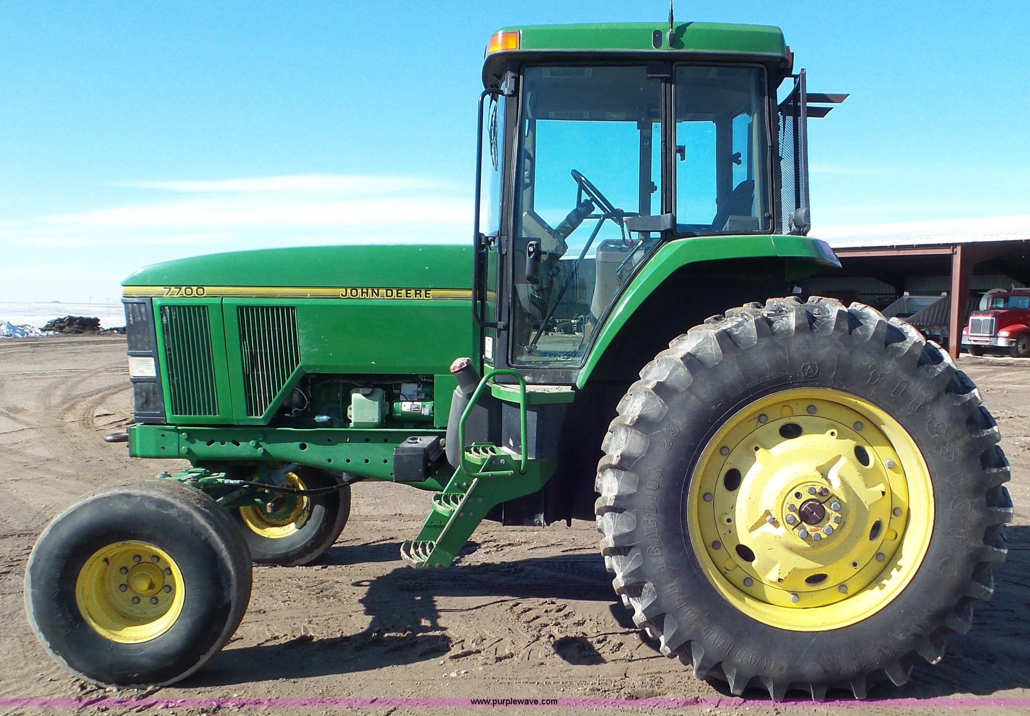 Purple Wave is selling a used Tractor in Kansas. This item is a 1995 John Deere 7700 tractor with the following: 9,134 hours on meter, John Deere 6076TRW31 7.6L six cylinder diesel engine, Quad-Range transmission, 16F-12R gears, AC and heat, AM/FM, Air suspension seat, Seven pin outlet, 1000 PTO, (3) rear hydraulic remote sets, Goodyear 14-16.1 front tires, Goodyear 480/80R38 rear tires, Serial RW7700H008773