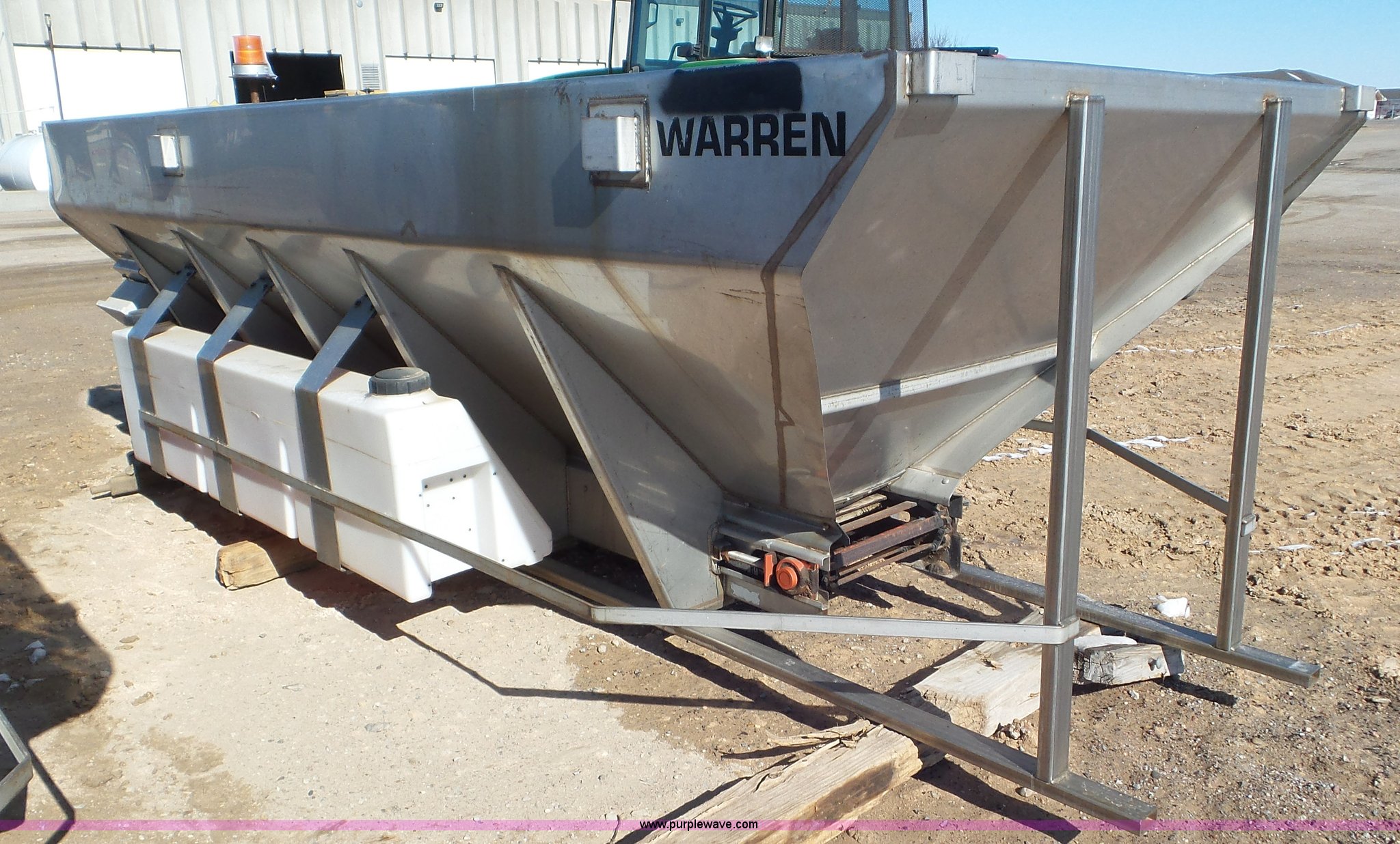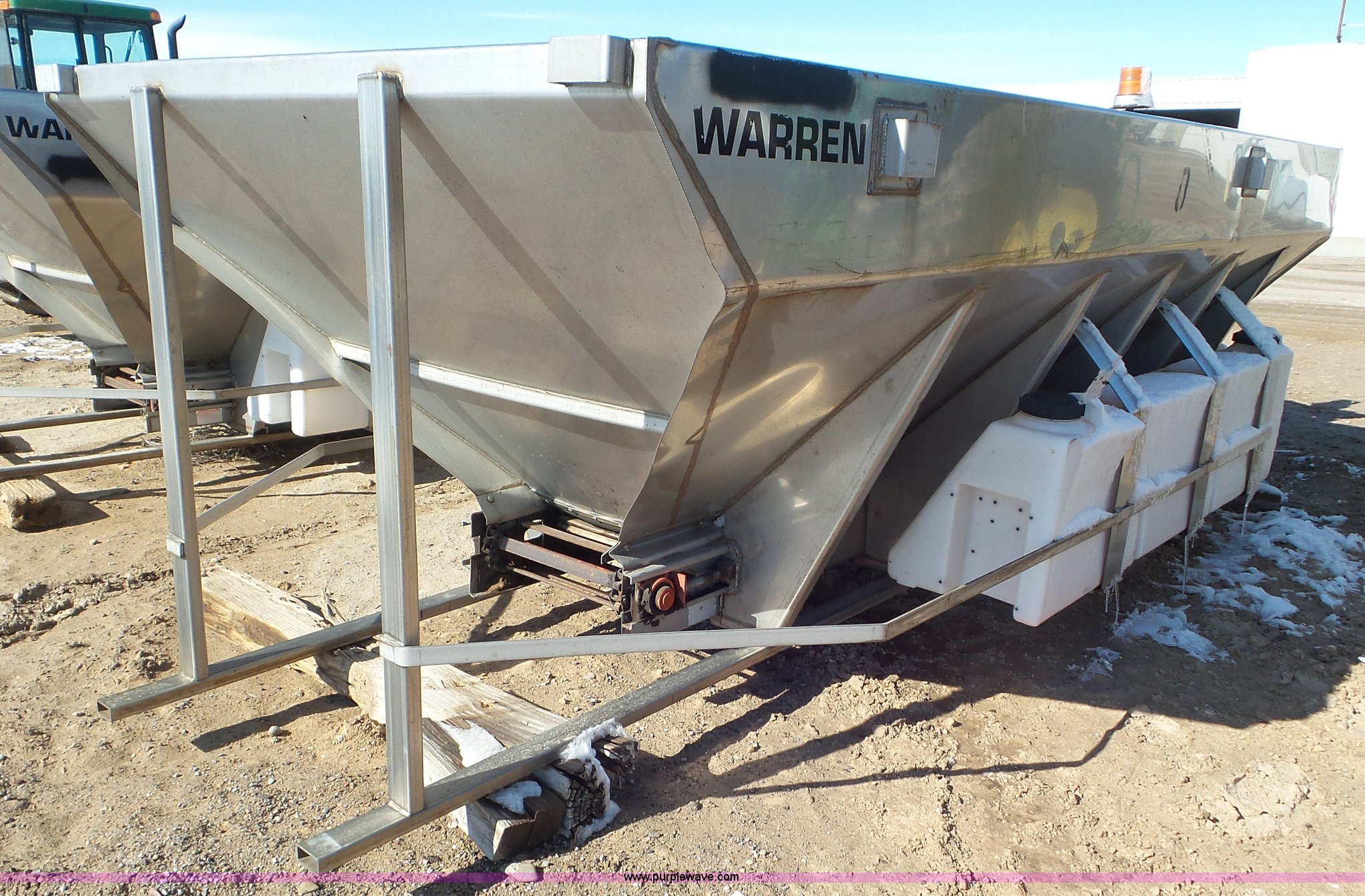 Purple Wave is selling a used Truck Part and Attach. in Kansas. This item is a Warren stainless steel salt/sand spreader with the following: Model AC-2420A-15-KDOT, 15'L, 18"W chain conveyor, Single rubber spreader, (2) poly liquid tanks, Hydraulic operation, Serial SC13313