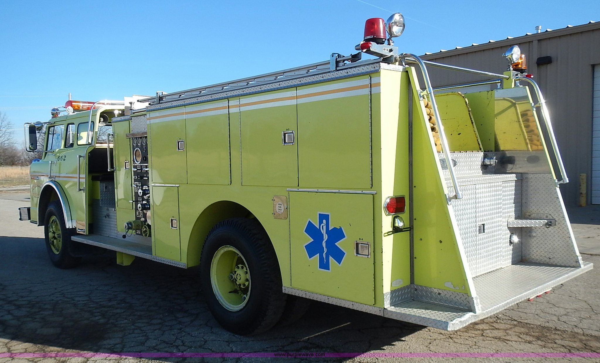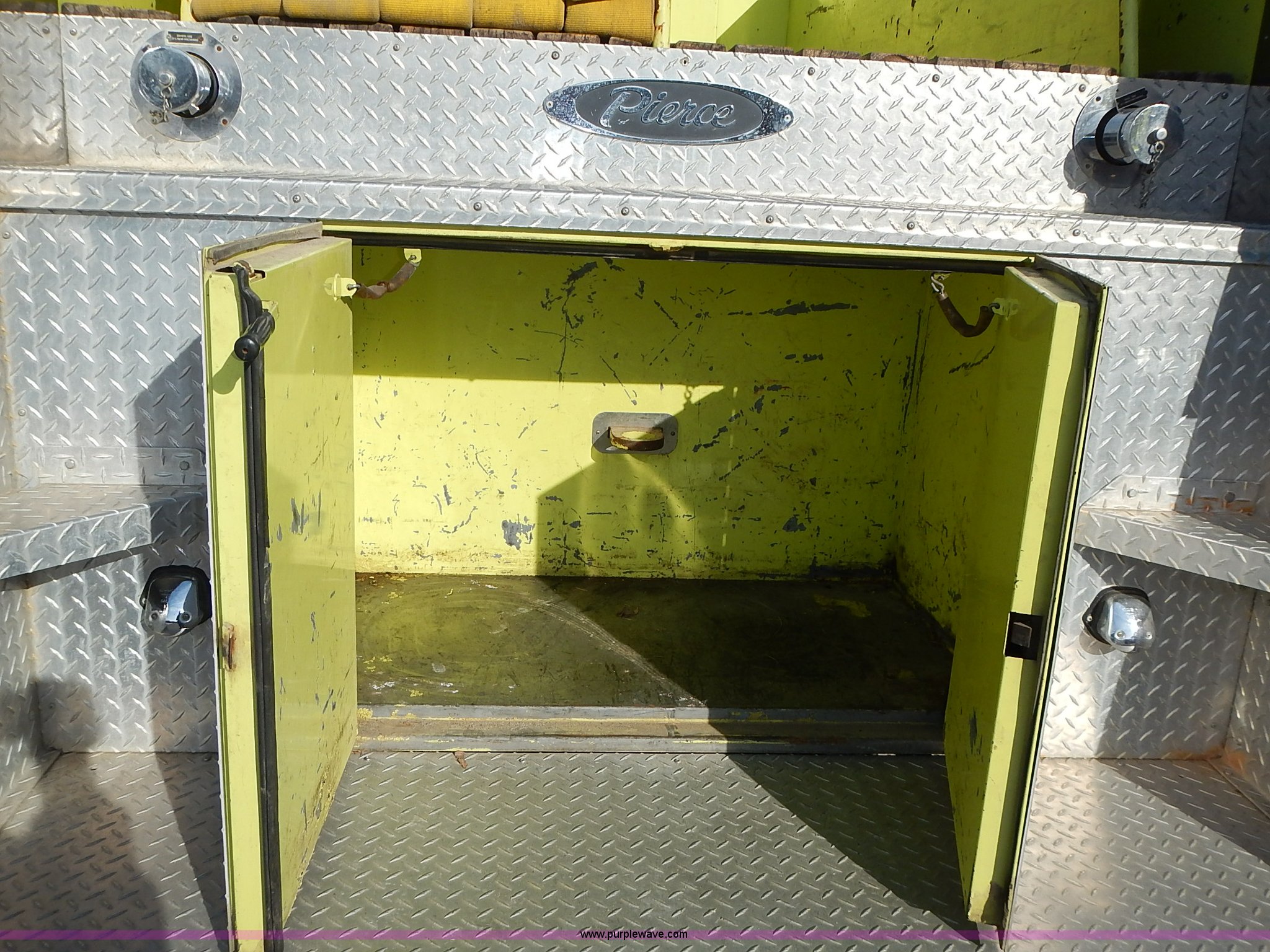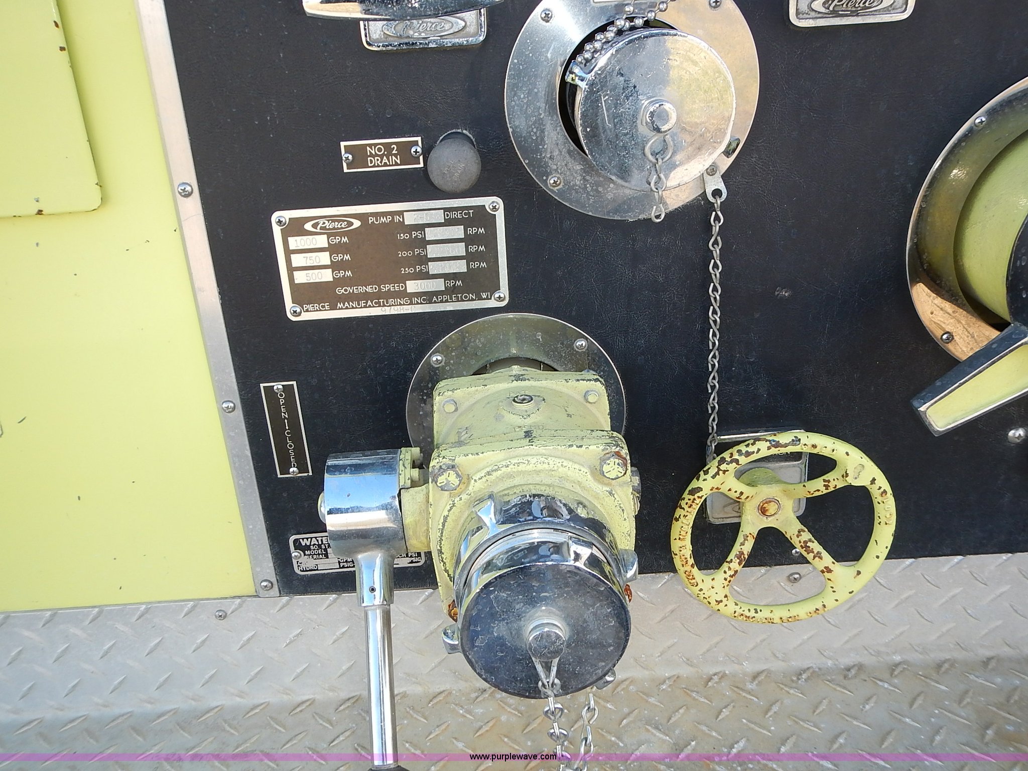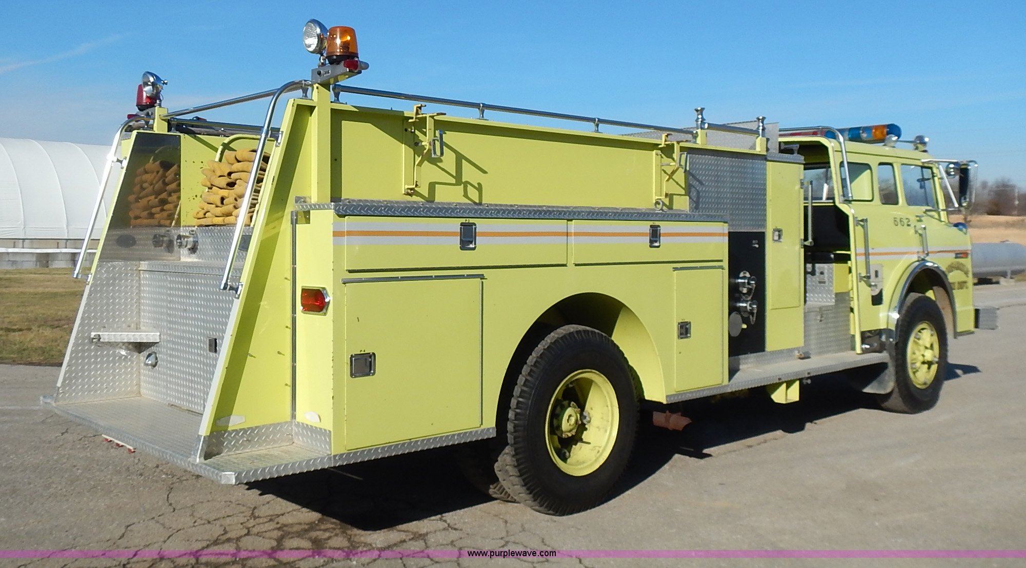 Purple Wave is selling a used Fire Truck or Emergency Vehicle in Kansas. This item is a 1978 Pierce Ford 8000 pumper truck with the following: 14,646 miles on odometer, Caterpillar 3208 diesel engine, Allison automatic transmission, Single axle, Heat, Five passenger capacity, (11) exterior compartments, Tower lights, 1,000 gallon per minute pump, Model CMYB, Serial 53519, 6" front outlet, Two stage waterous pump, Electric pump shift, 500 gallon water tank, Approximately 600'L water hose, Federal siren system, Work lights, Electro governor, 175" wheelbase, Air brakes, 11.00-20 tires, Batteries weak, Decals will be removed or painted over prior to auction
