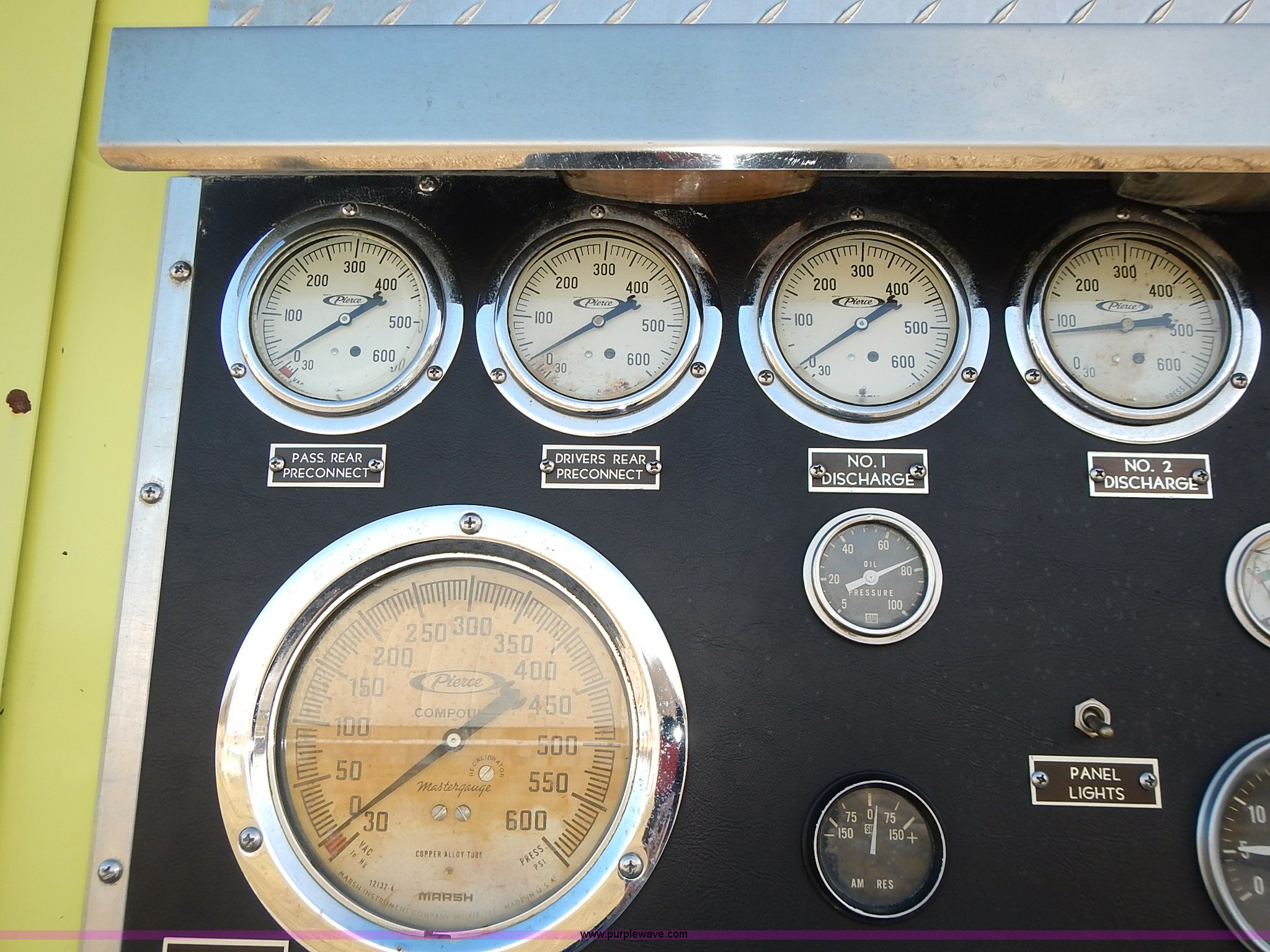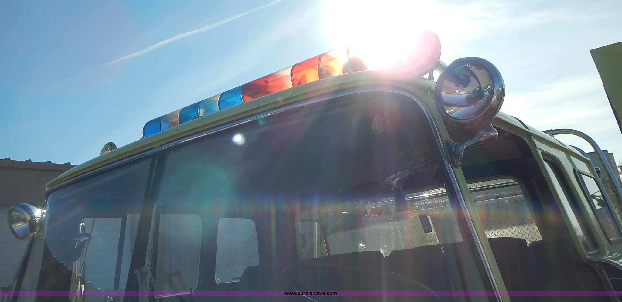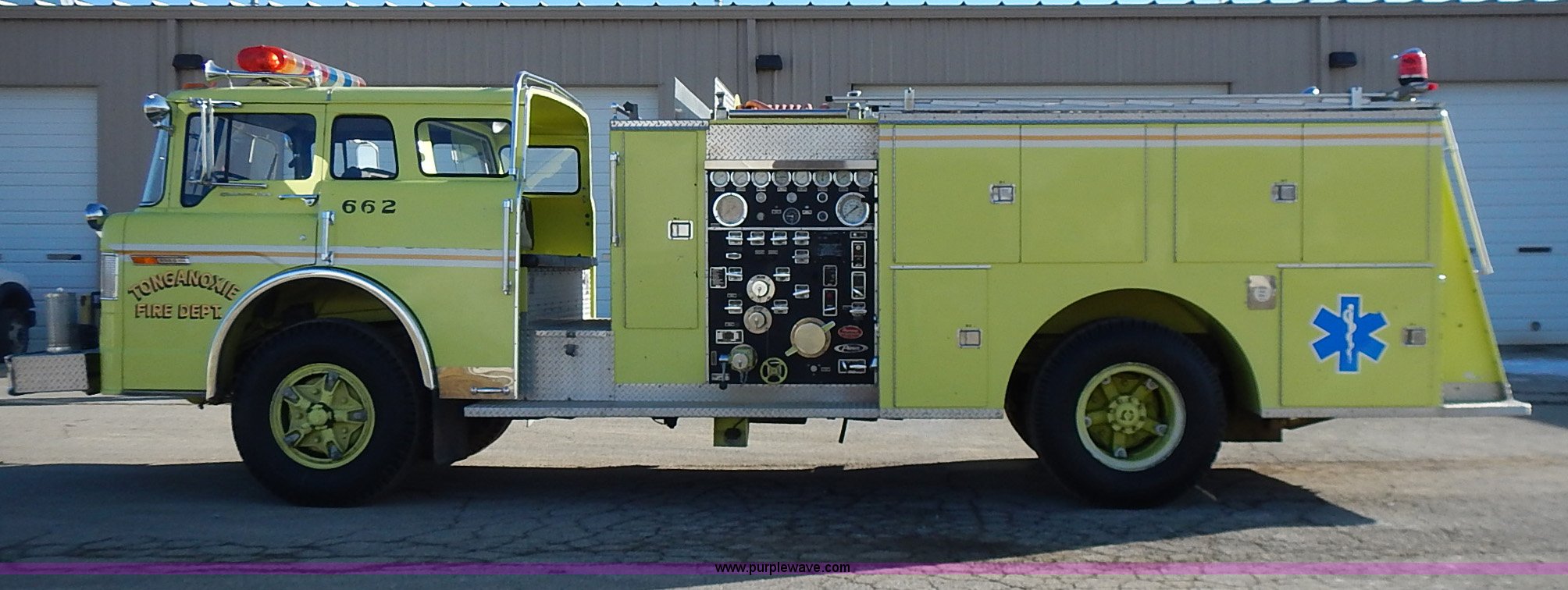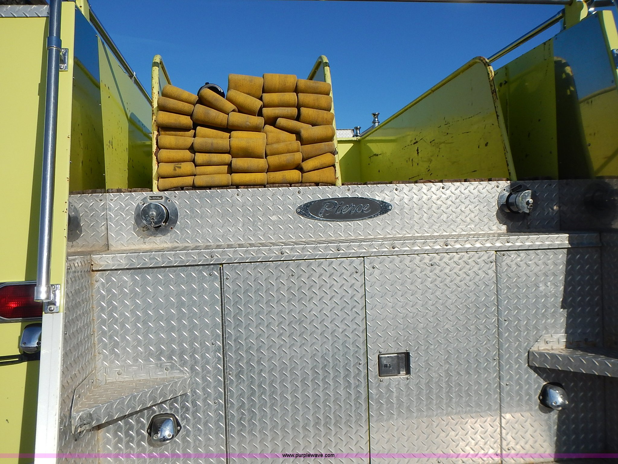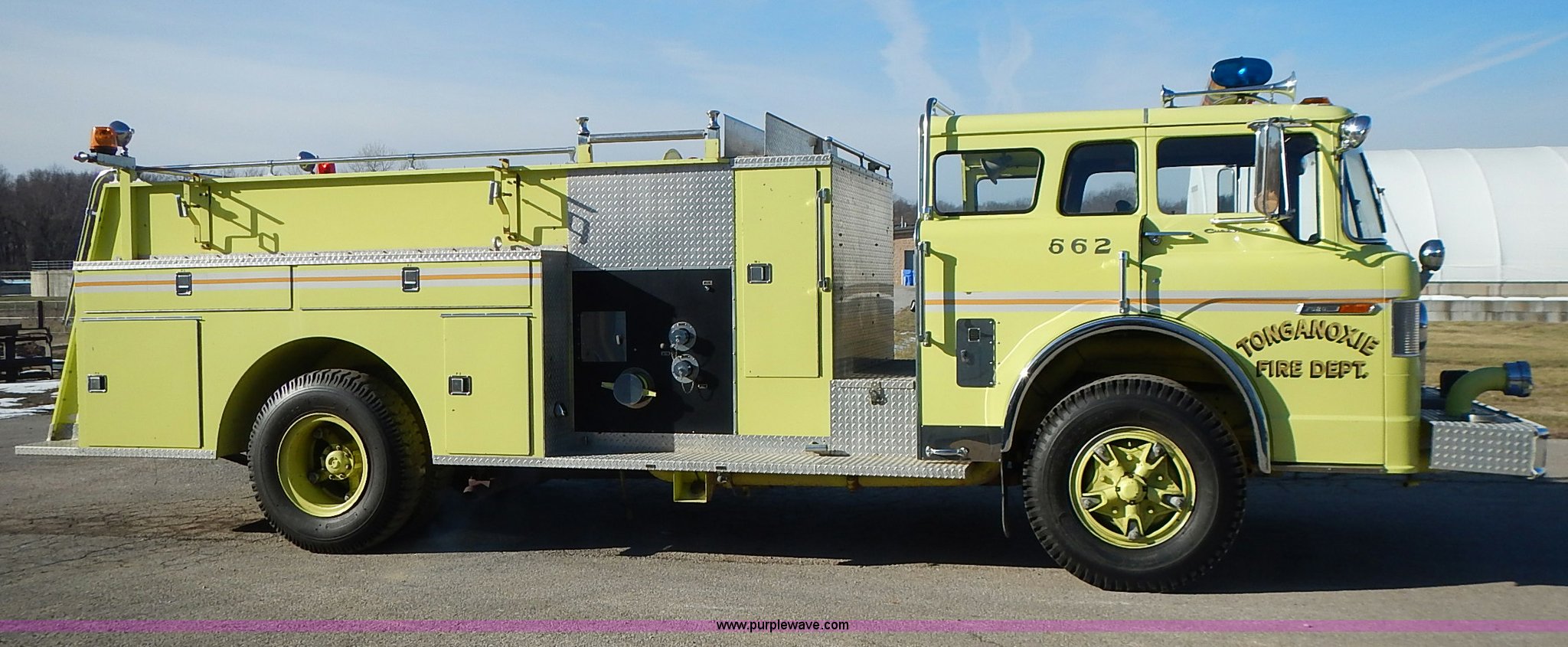 Purple Wave is selling a used Fire Truck or Emergency Vehicle in Kansas. This item is a 1978 Pierce Ford 8000 pumper truck with the following: 14,646 miles on odometer, Caterpillar 3208 diesel engine, Allison automatic transmission, Single axle, Heat, Five passenger capacity, (11) exterior compartments, Tower lights, 1,000 gallon per minute pump, Model CMYB, Serial 53519, 6" front outlet, Two stage waterous pump, Electric pump shift, 500 gallon water tank, Approximately 600'L water hose, Federal siren system, Work lights, Electro governor, 175" wheelbase, Air brakes, 11.00-20 tires, Batteries weak, Decals will be removed or painted over prior to auction