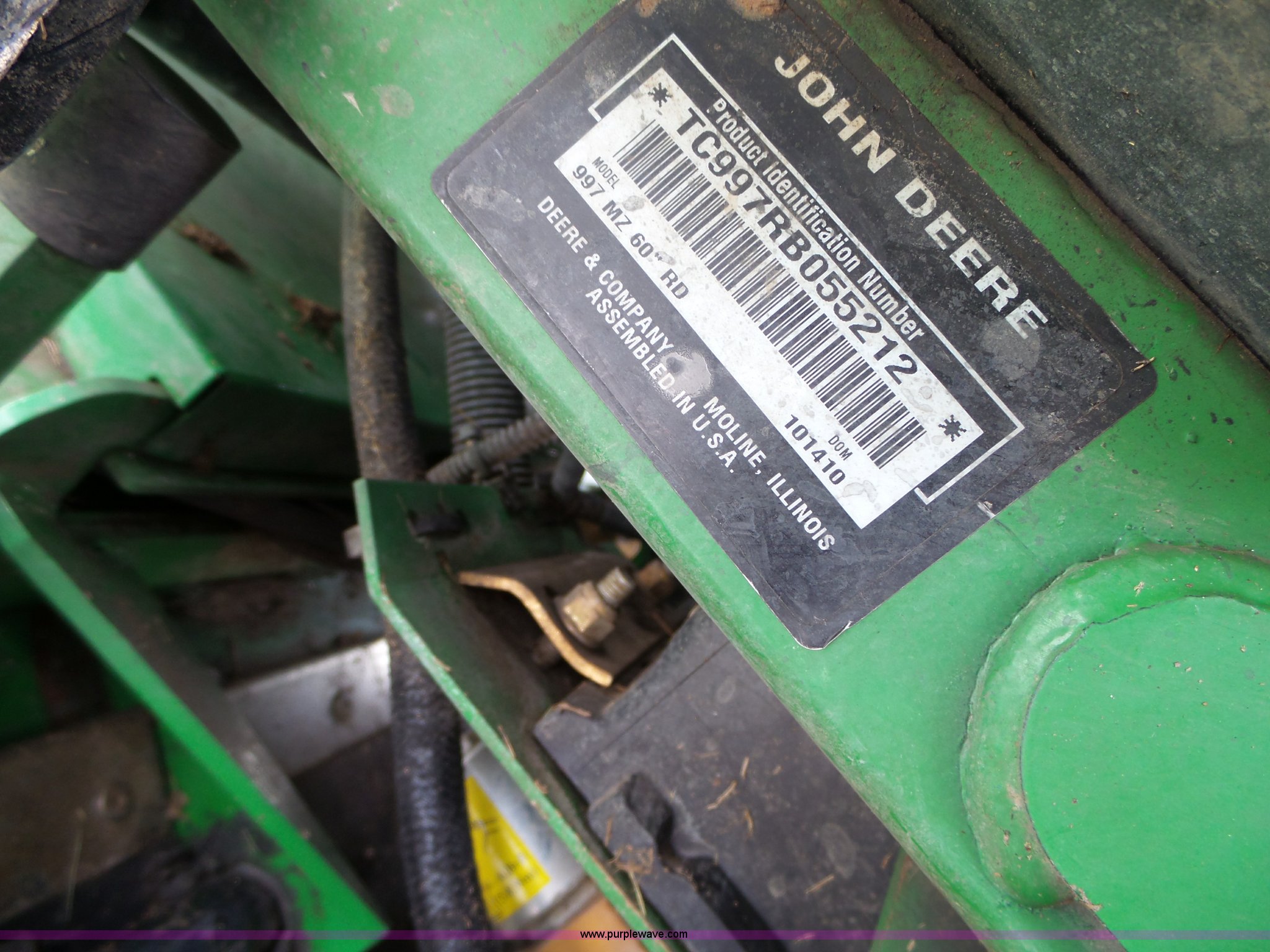 Purple Wave is selling a used Lawn Mower in Iowa. This item is a 2010 John Deere 997 Z-Trak lawn mower with the following: 1,601 hours on meter, 60"W cutting capacity, Yanmar 1.33L three cylinder diesel engine, 21.2 kW, Hydrostatic transmission, Folding ROPS bar, Rear grill guard, 15 x 6.00-6 front tires, 26 x 12.00-12 NHS tires, Serial TC997RB055212