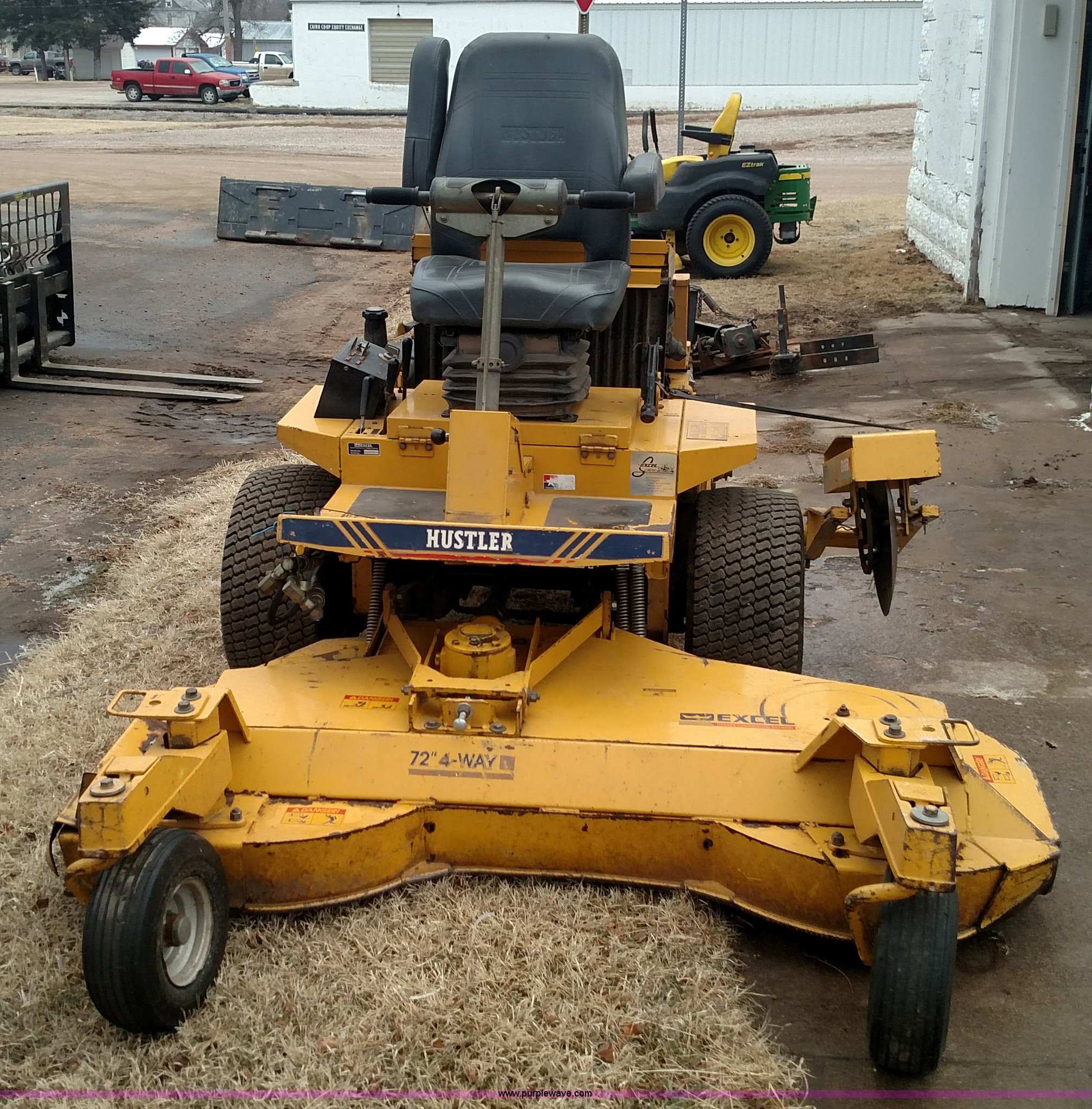 Hustler 3400 ZTR mower. 1,451 hours on meter, 72" cutting capacity, Three cylinder diesel engine, Hydrostatic transmission, Edger attachment, 60" Sweepster boom, 11 x 4.00-5 deck tires, 23 x 10.50-12 rear tires, Serial 99125S56. City of Cunningham. Cunningham, KS 67035