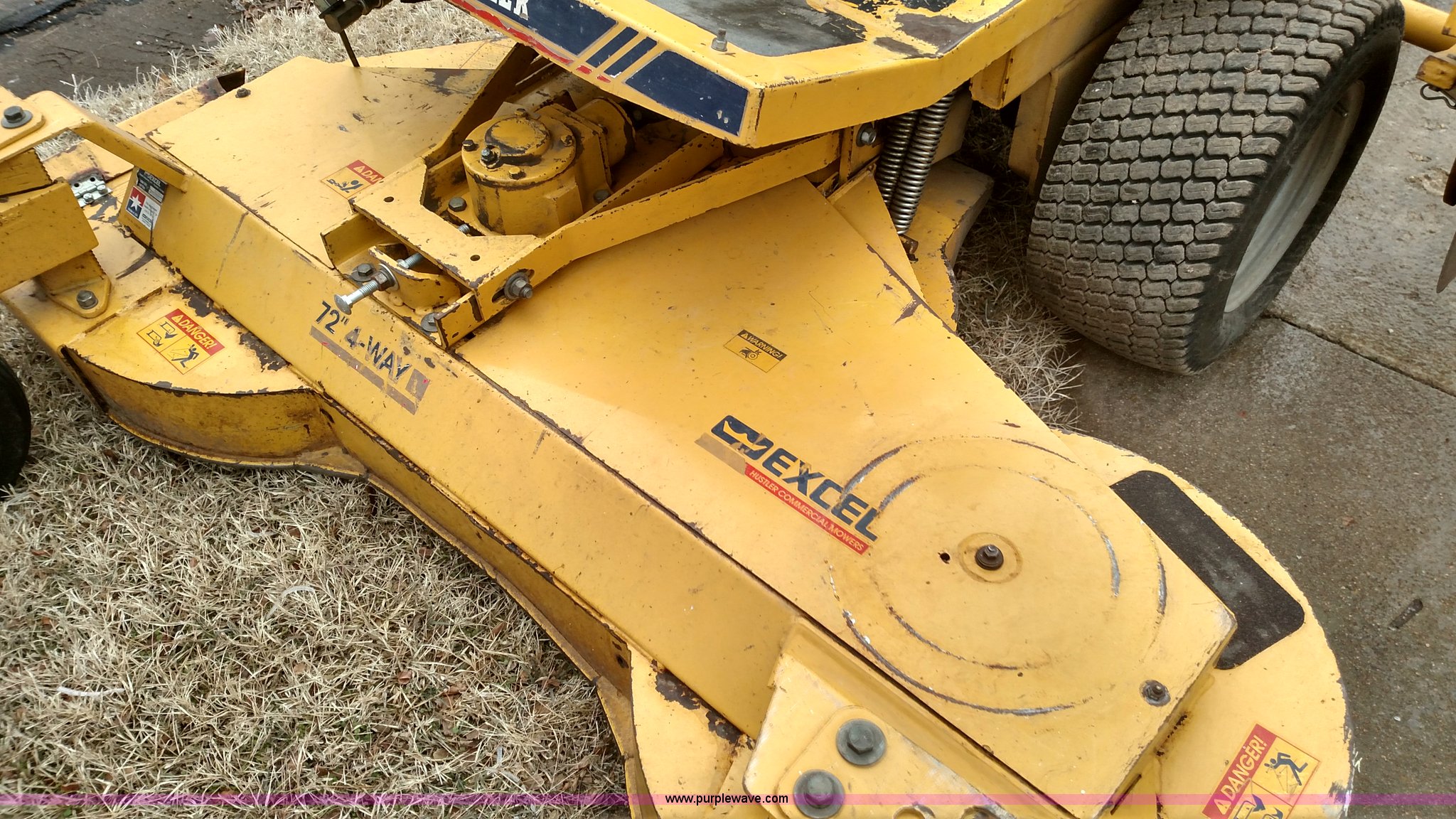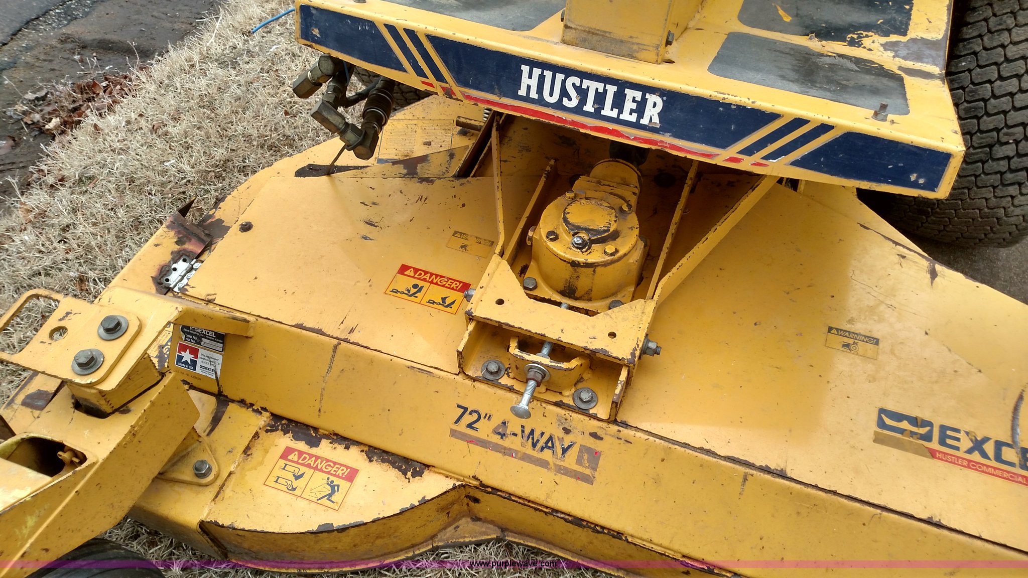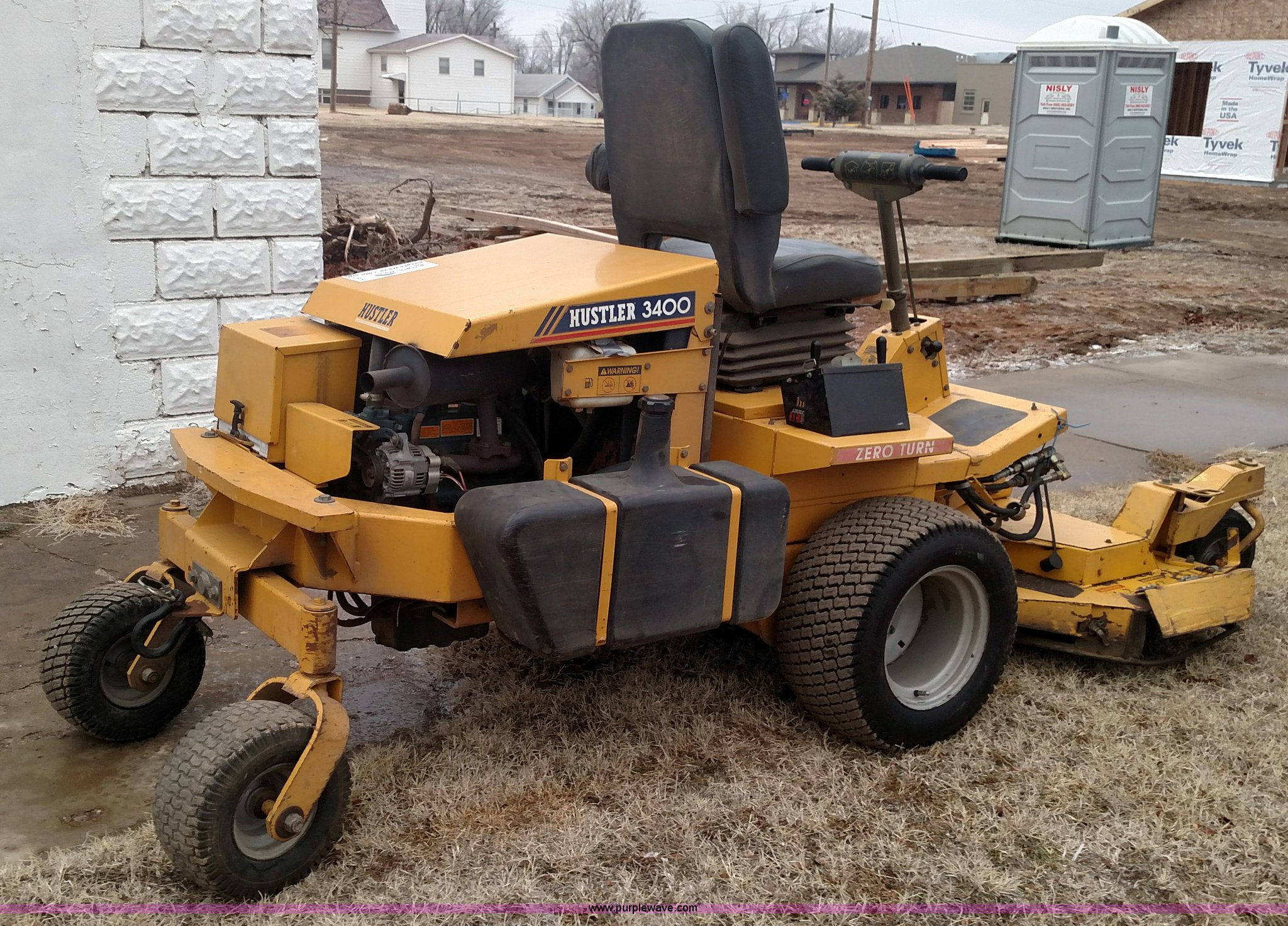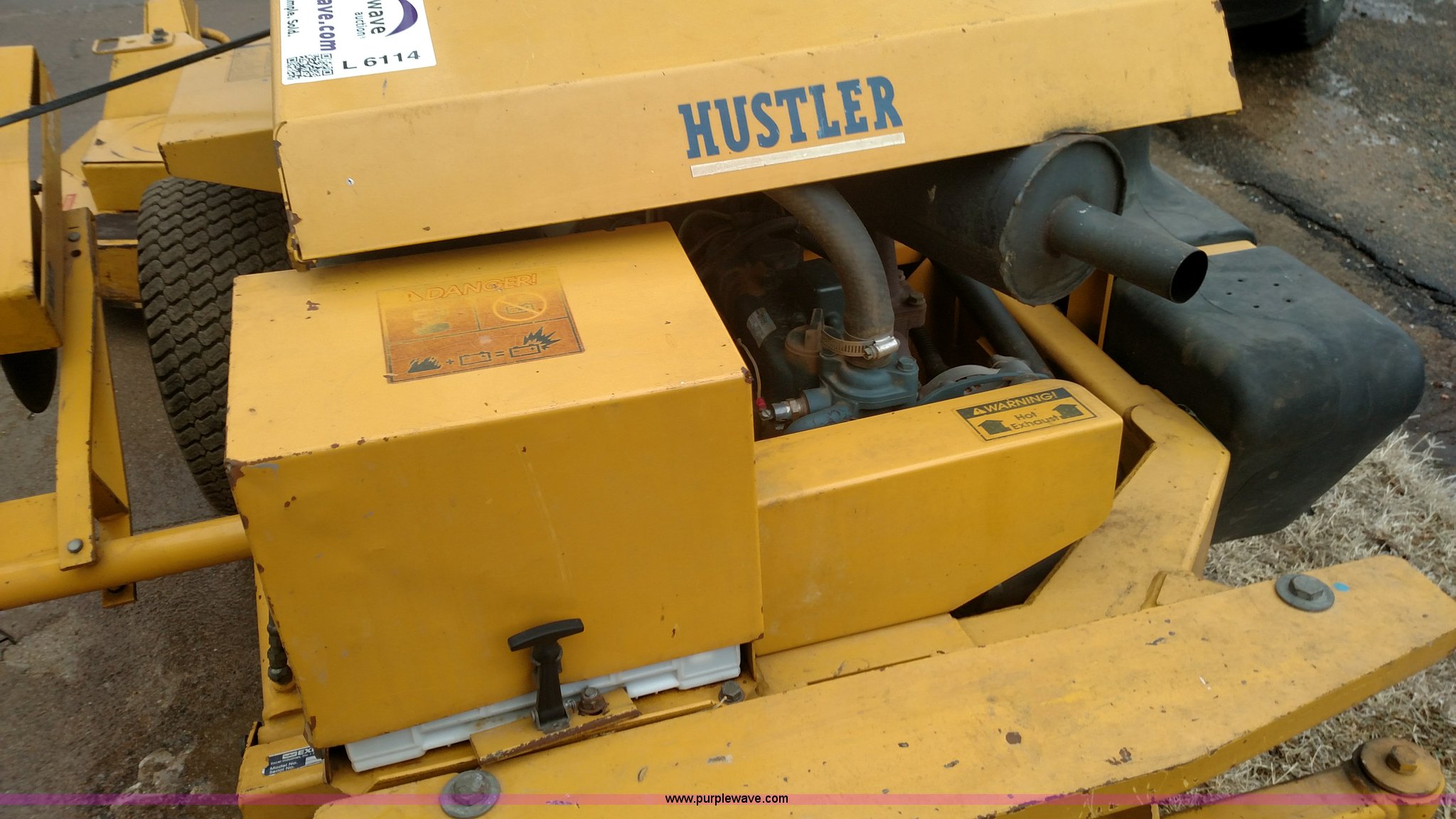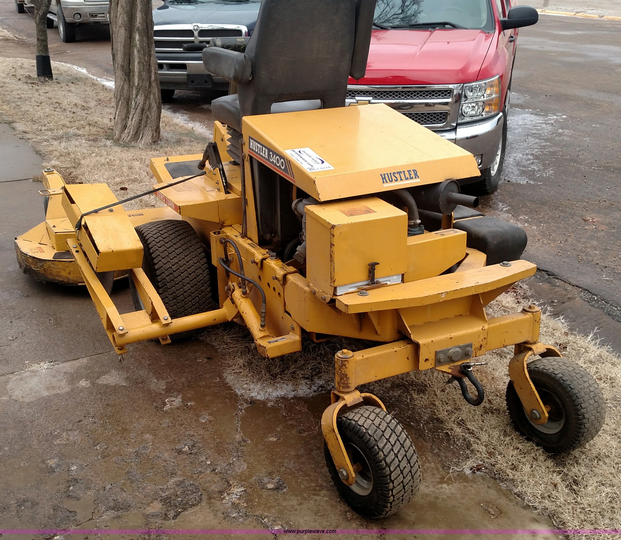 Purple Wave is selling a used Lawn Mower in Kansas. This item is a Hustler 3400 ZTR mower with the following: 1,451 hours on meter, 72" cutting capacity, Three cylinder diesel engine, Hydrostatic transmission, Edger attachment, 60" Sweepster boom, 11 x 4.00-5 deck tires, 23 x 10.50-12 rear tires, Serial 99125S56