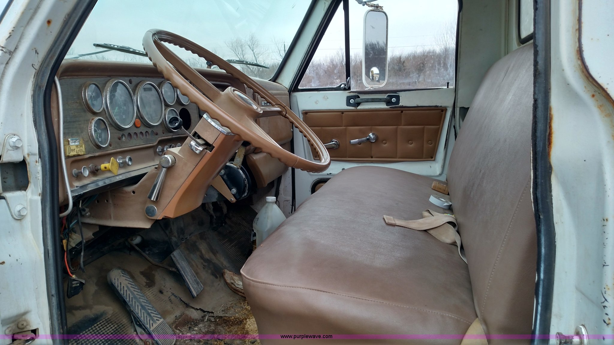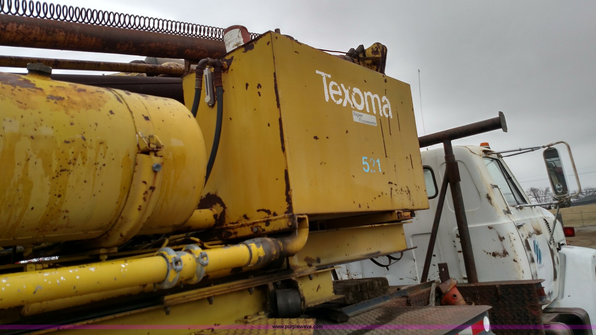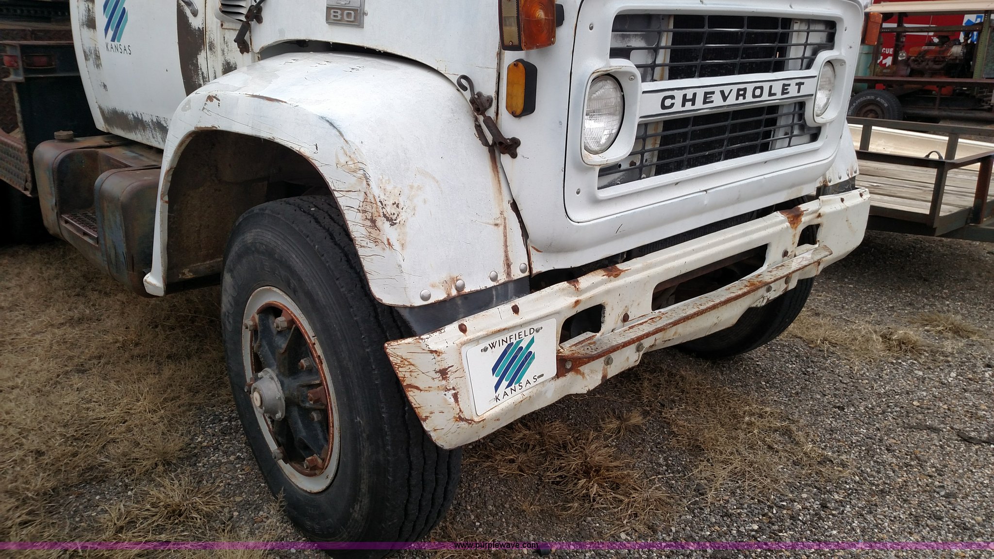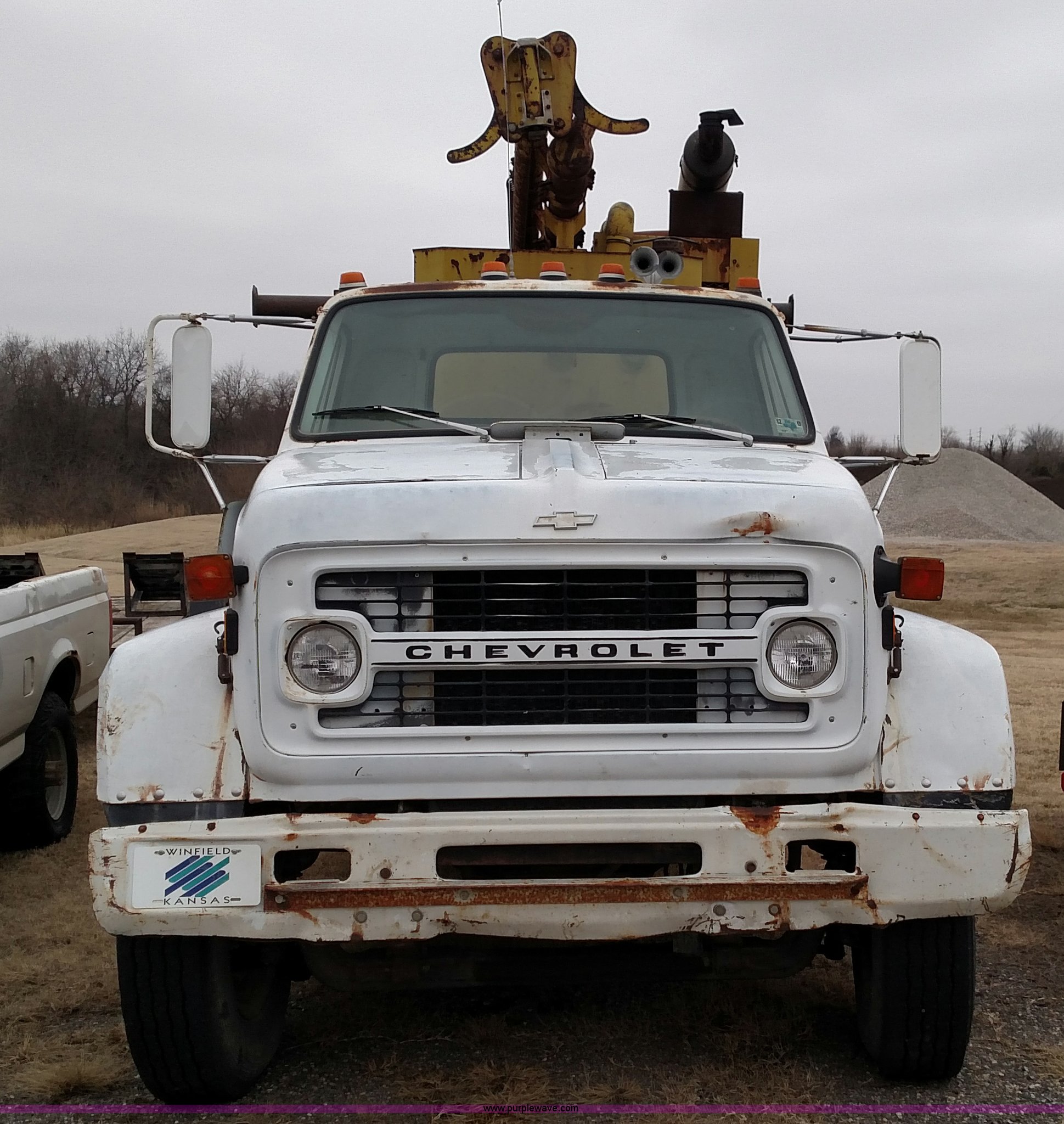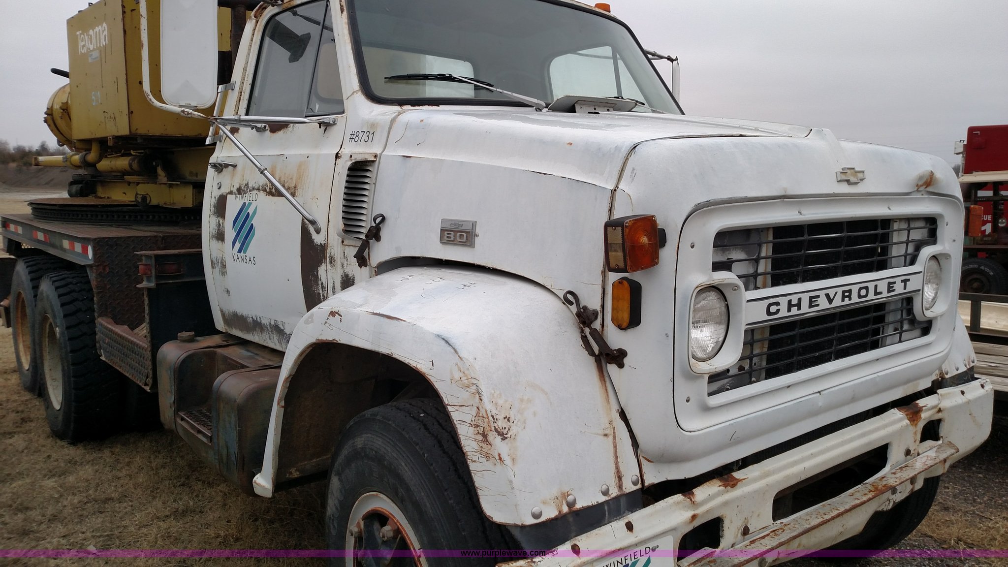 Purple Wave is selling a used Bucket Truck in Kansas. This item is a 1979 Chevrolet C80 Texhoma digger truck with the following: 73,397 miles on odometer, Caterpillar 3208 diesel engine, Automatic transmission, Tandem axle, Inter-axle differential lock, Tilt, Manual windows and locks, Vinyl interior, Rear outriggers, Pole setter, Turntable, 21" bit, 8" bit, Spring suspension, 10.00R20 front tires, 11.00R20 rear tires, Dead battery, Unit# 0008731