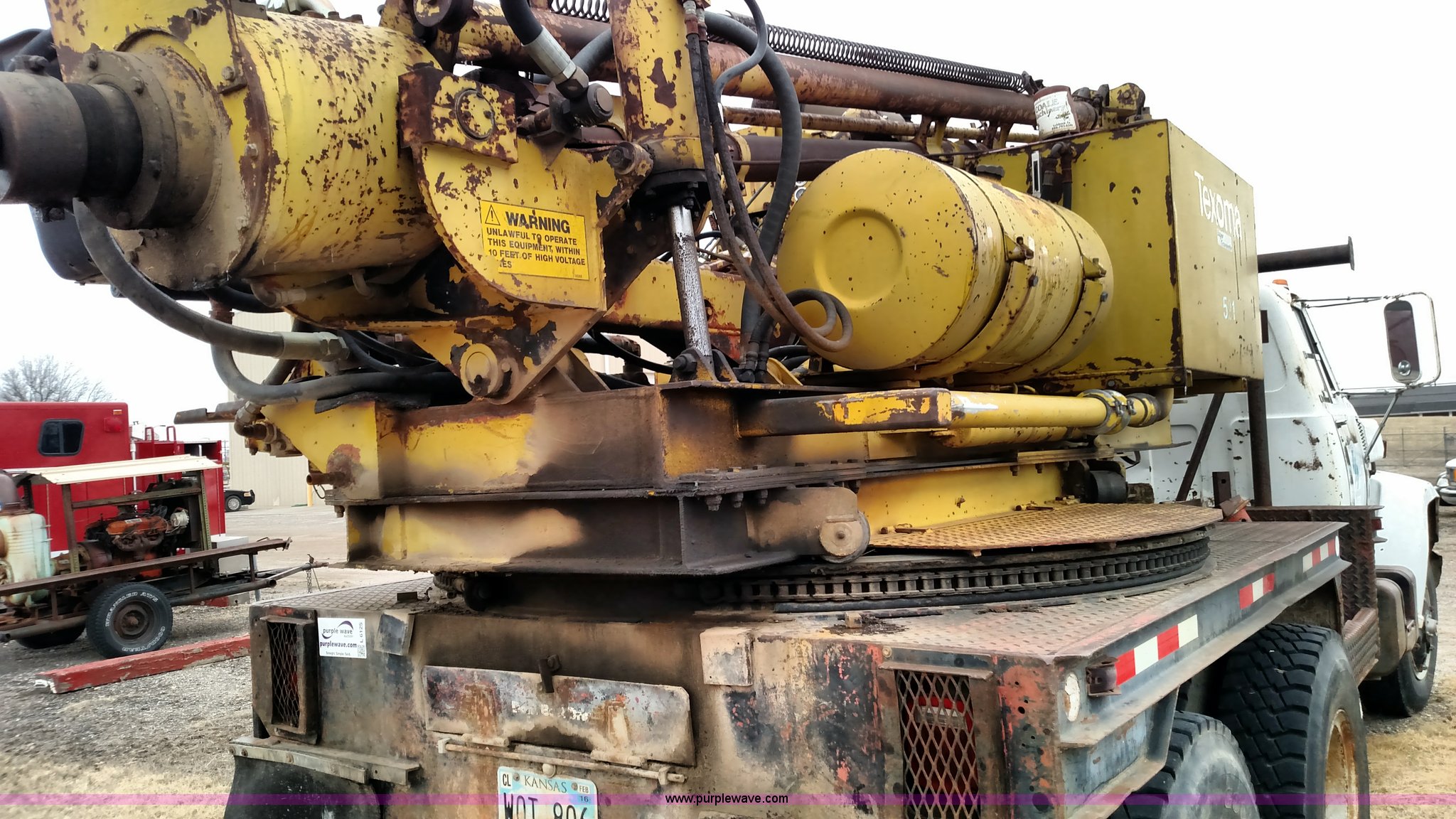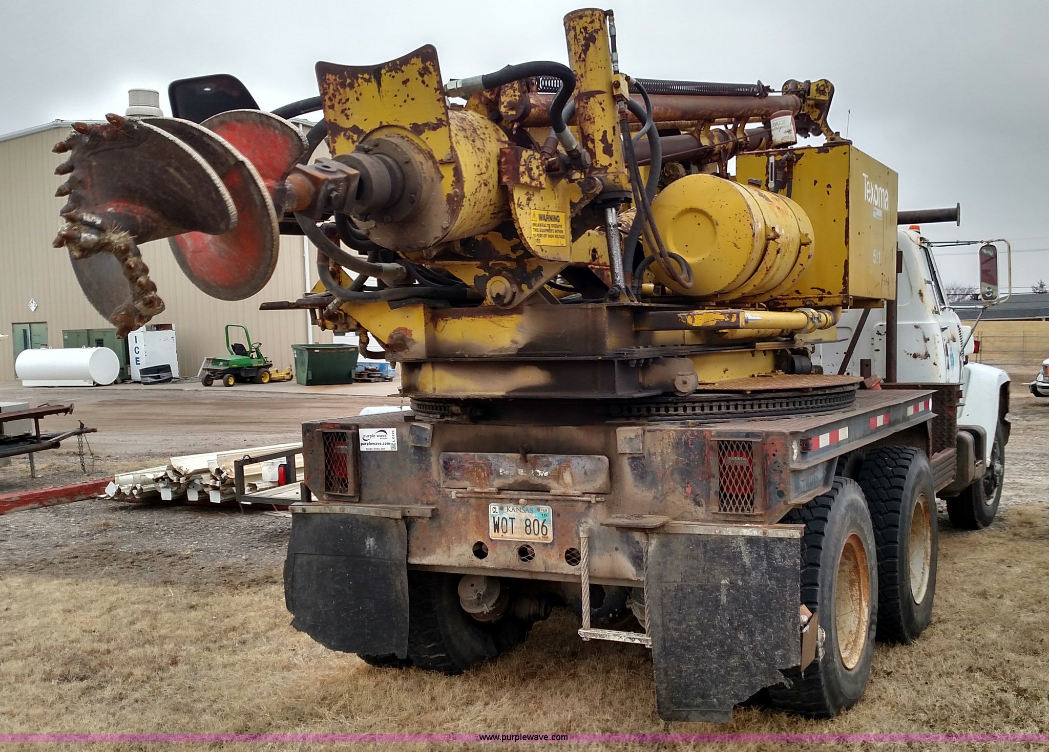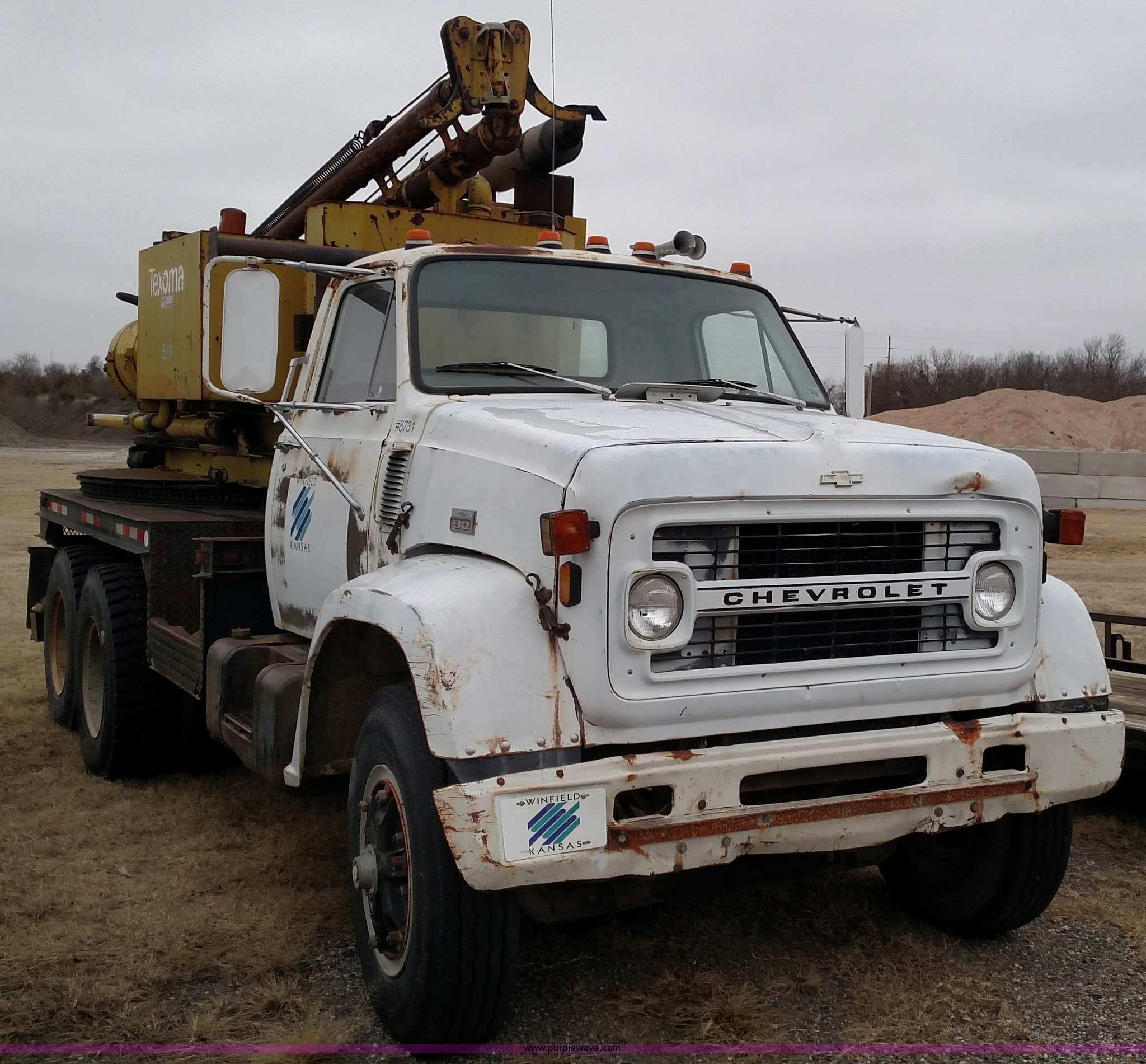 1979 Chevrolet C80 Texhoma digger truck. 73,397 miles on odometer, Caterpillar 3208 diesel engine, Automatic transmission, Tandem axle, Inter-axle differential lock, Tilt, Manual windows and locks, Vinyl interior, Rear outriggers, Pole setter, Turntable, 21" bit, 8" bit, Spring suspension, 10.00R20 front tires, 11.00R20 rear tires, Dead battery, Unit# 0008731. C48CY9V158312. City of Winfield. Winfield, KS 67156