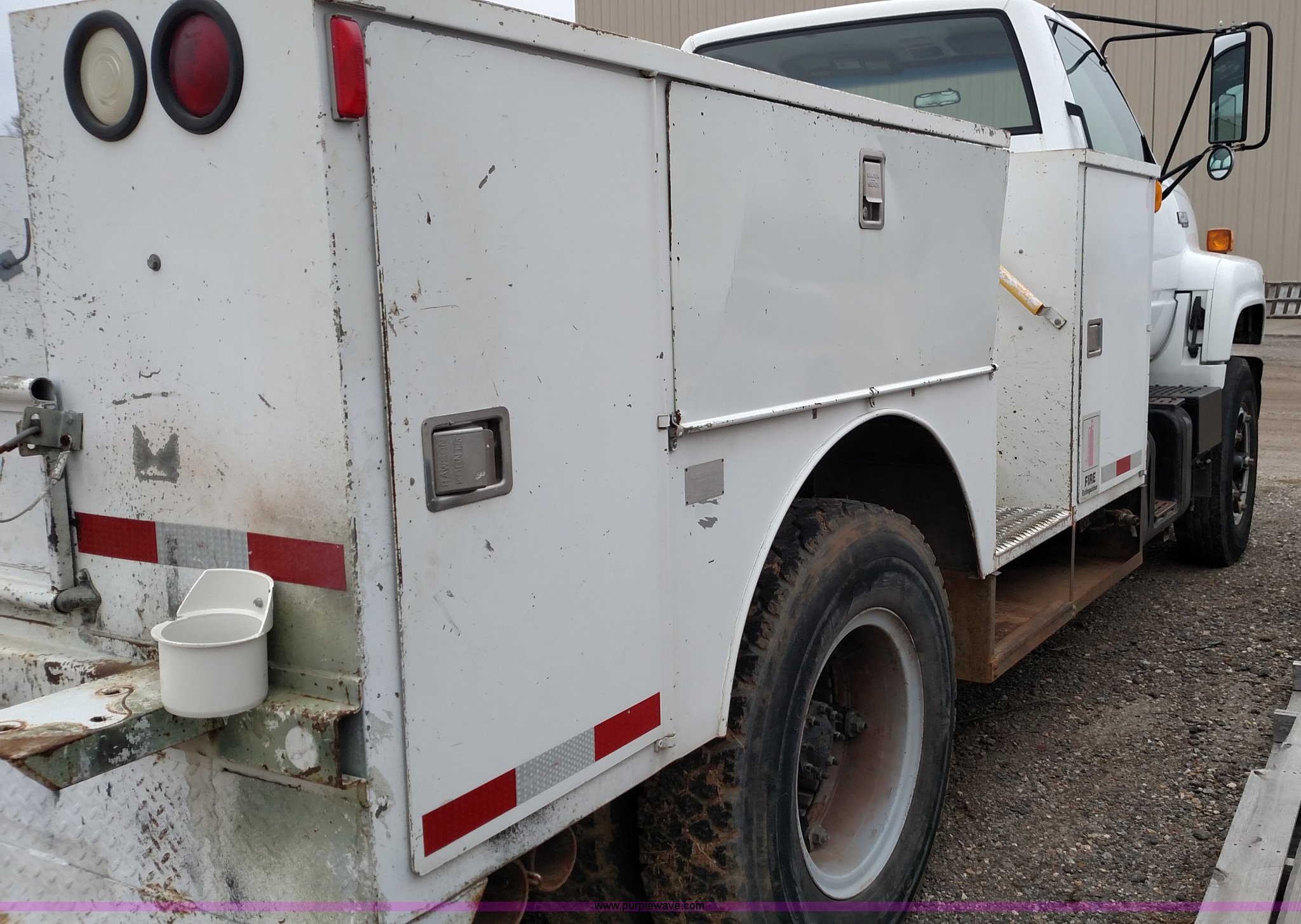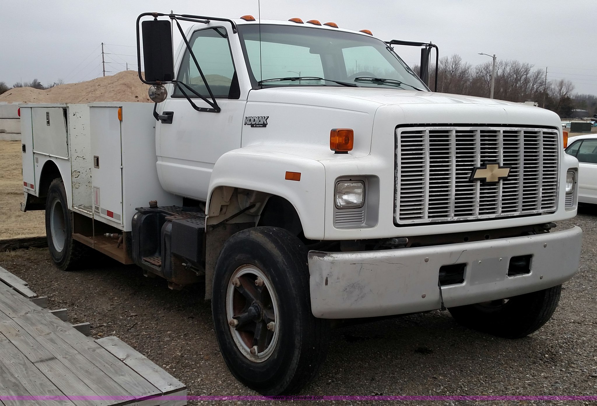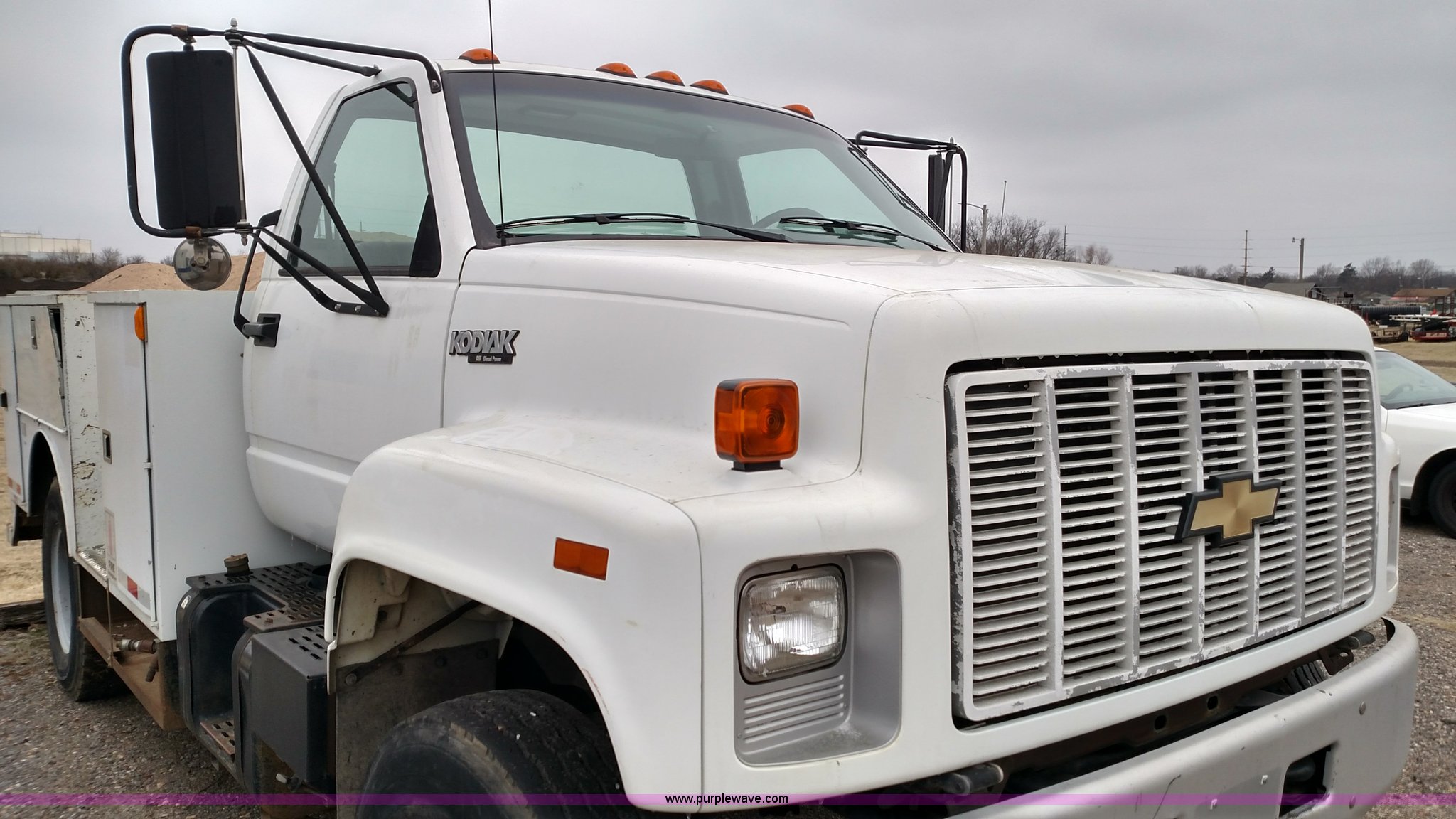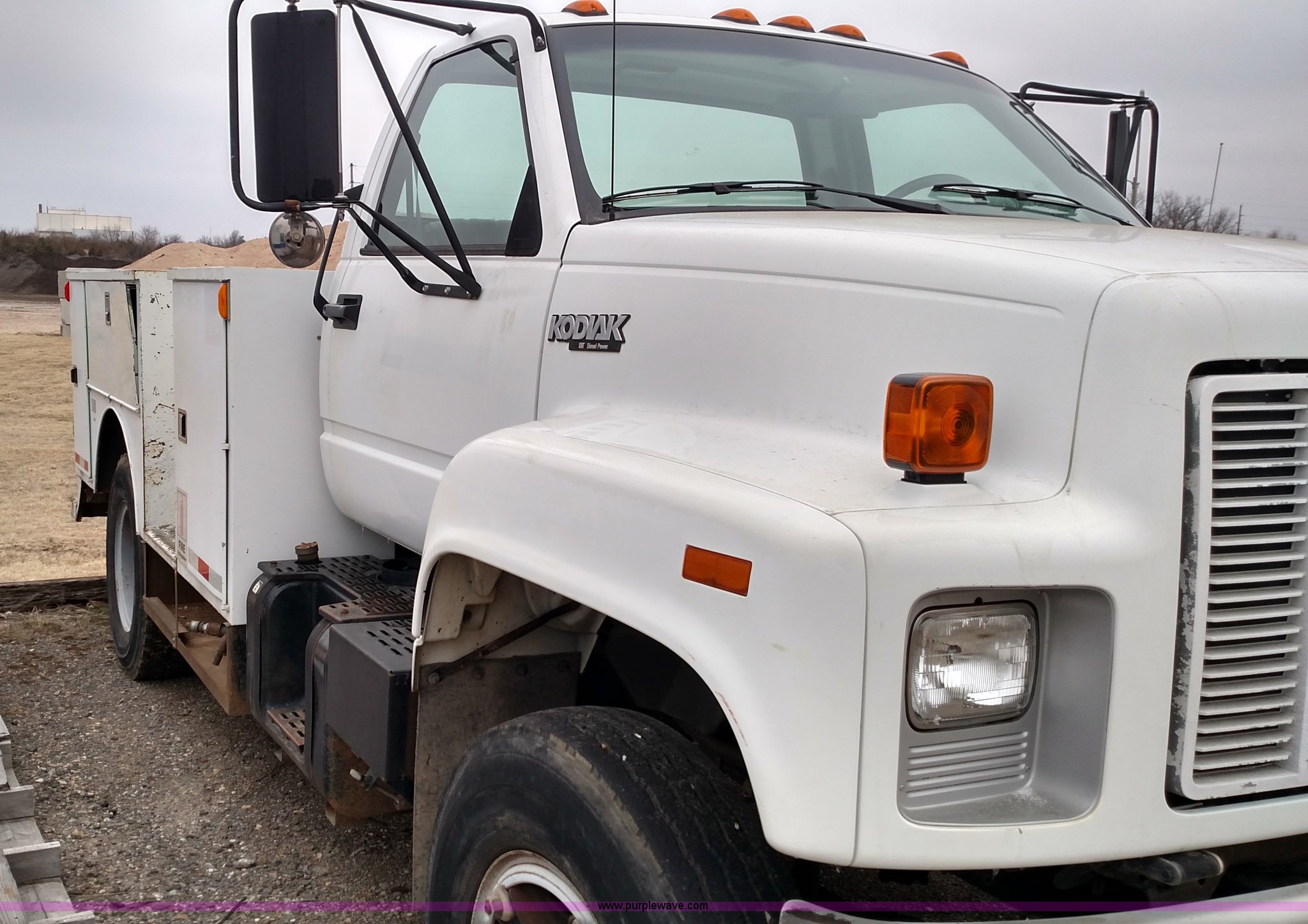 Purple Wave is selling a used Service Truck in Kansas. This item is a 1993 Chevrolet Kodiak service truck with the following: 29,360 miles on odometer, 6,753 hours on meter, Caterpillar 3116 6.6L six cylinder diesel engine, Automatic transmission, Single axle, AM/FM, Rawson-Koenig DA1800 service bed, Shelving, Grimmer Shcmidt E1655 air compressor, 175 psi, PTO driven, 2,200 cfm, Pintle hitch, Hydraulic brakes, 9.00R20 tires, Interior/exterior cosmetic damage