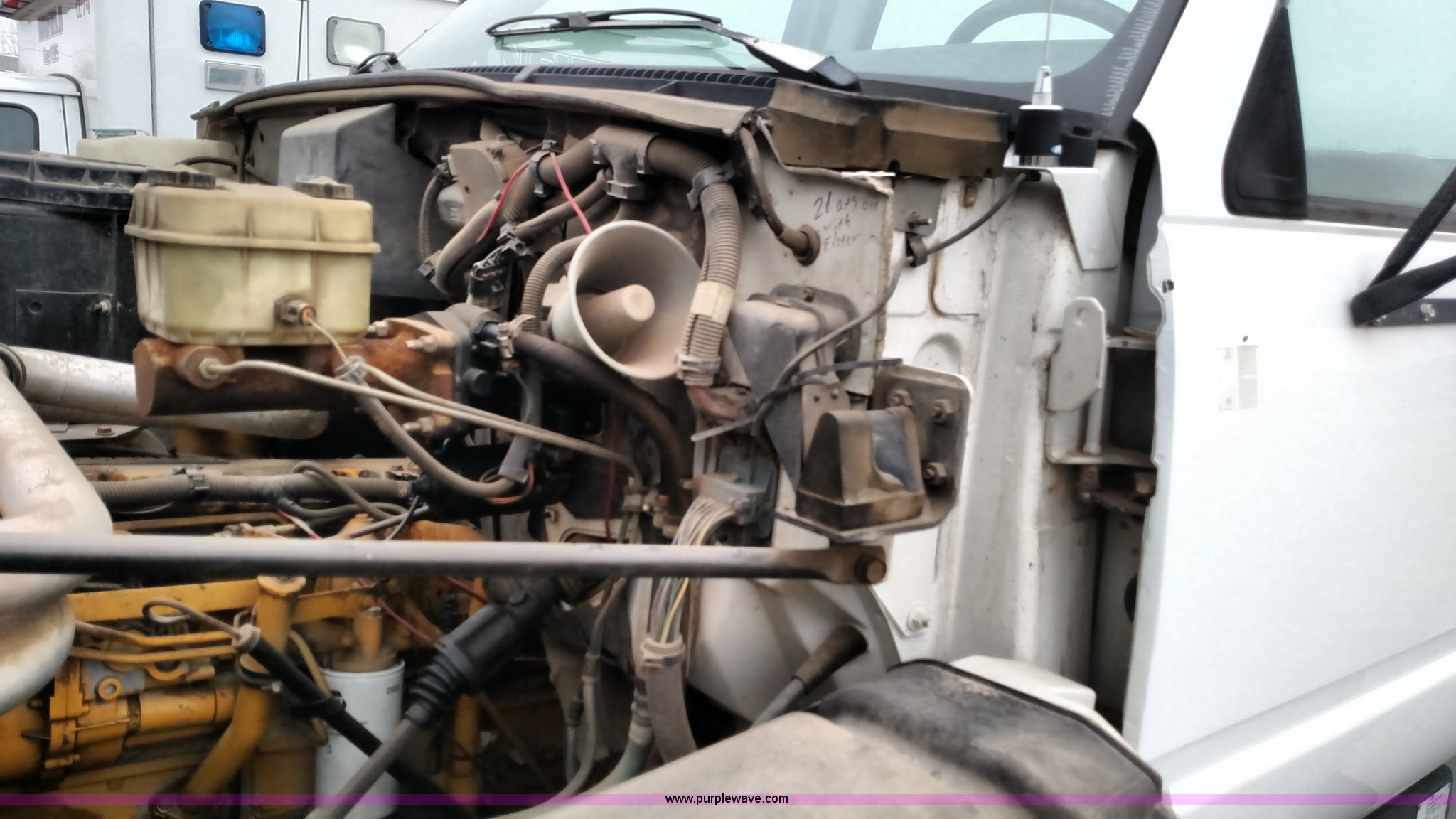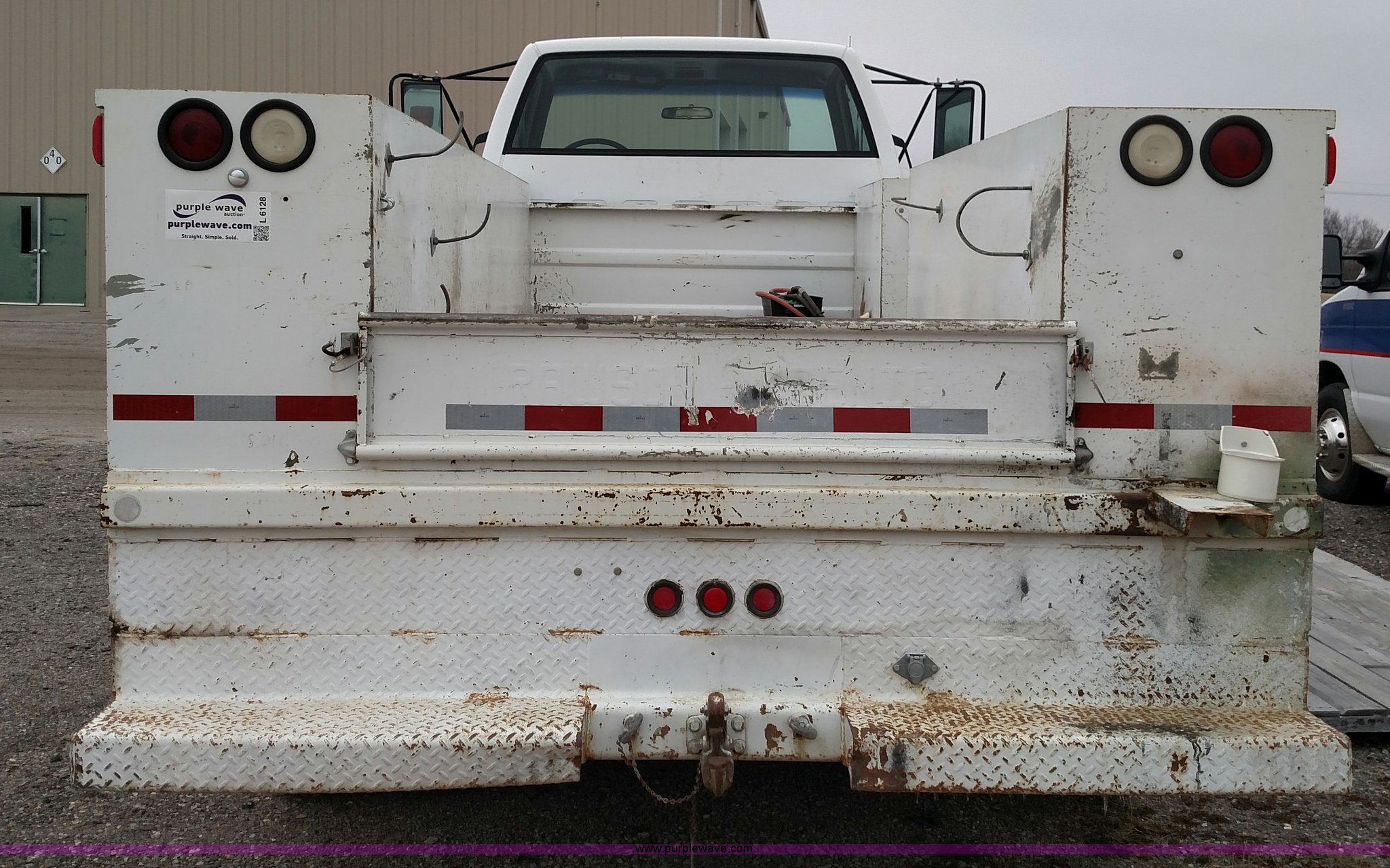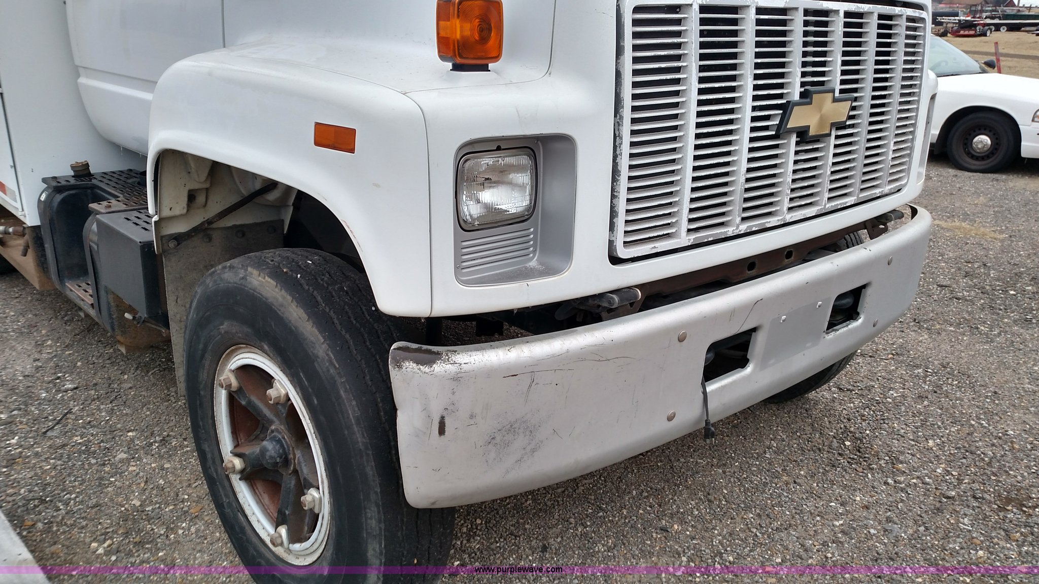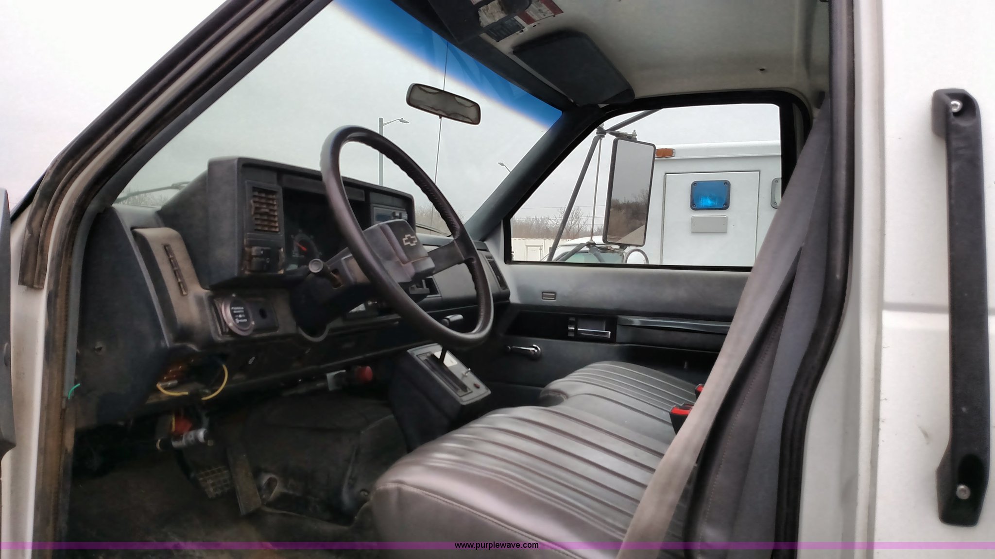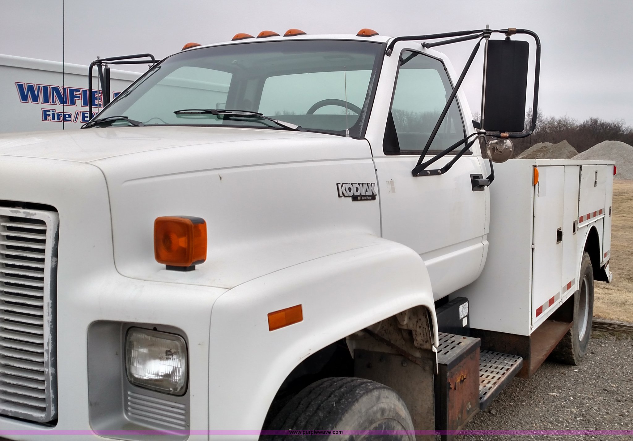 Purple Wave is selling a used Service Truck in Kansas. This item is a 1993 Chevrolet Kodiak service truck with the following: 29,360 miles on odometer, 6,753 hours on meter, Caterpillar 3116 6.6L six cylinder diesel engine, Automatic transmission, Single axle, AM/FM, Rawson-Koenig DA1800 service bed, Shelving, Grimmer Shcmidt E1655 air compressor, 175 psi, PTO driven, 2,200 cfm, Pintle hitch, Hydraulic brakes, 9.00R20 tires, Interior/exterior cosmetic damage