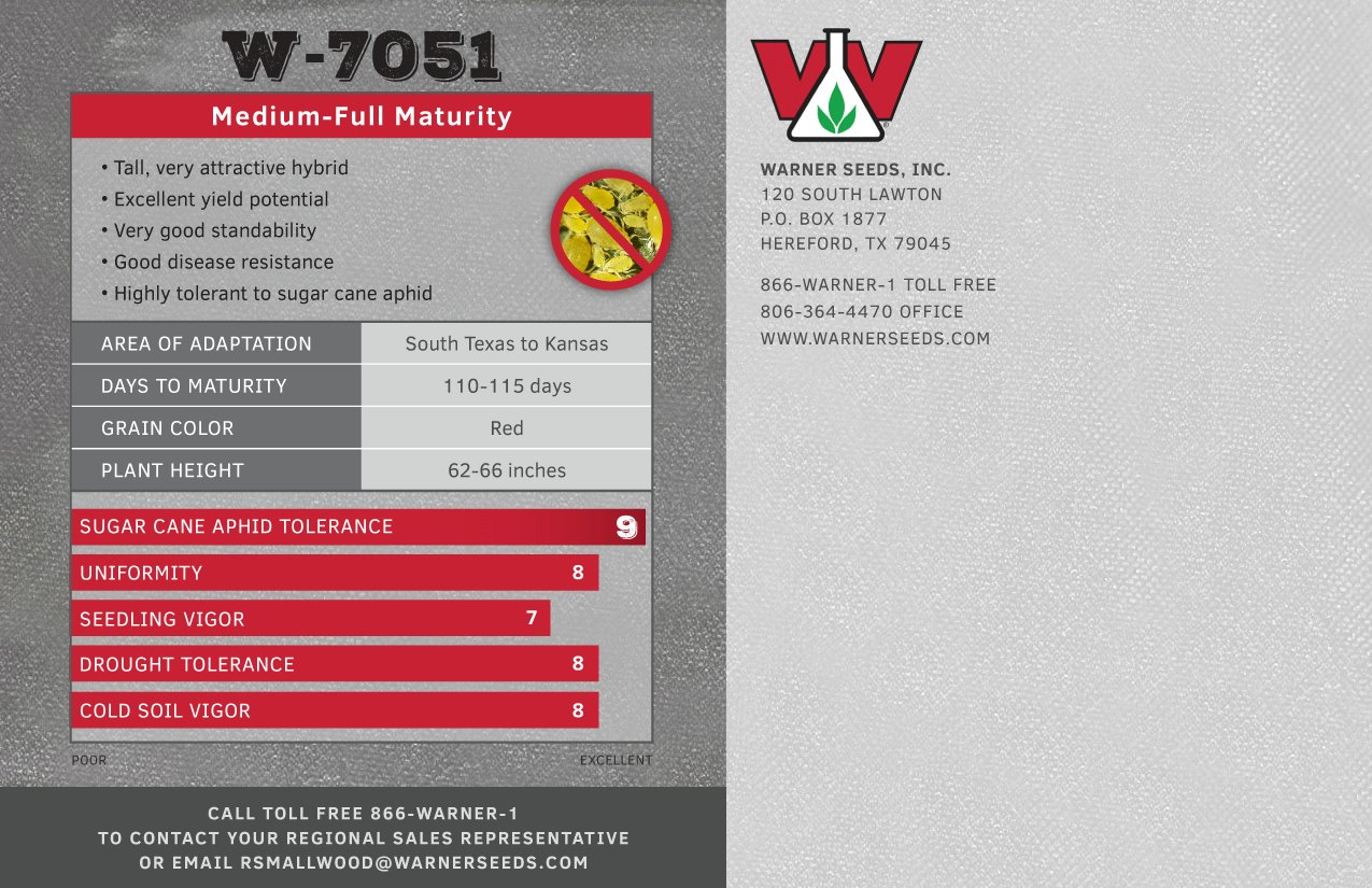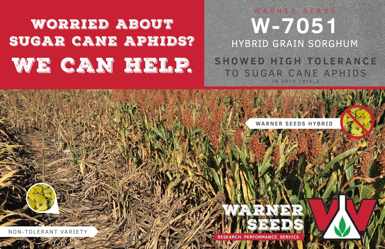 - Warner Seeds, Inc. W 7051 is the first release of many to come that exhibited a very high level of tolerance to the Sugar Cane Aphid in 2015. This hybrid has an extremely high yield potential that averaged over 200 bu. (11,200 lbs.) per acre in irrigated trials in 2015. As you can see in the picture, the Sugar Cane Aphids in this field were no match for W 7051 on the right. A susceptible hybrid on the left was completely devastated by the aphids. Call us at Warner Seeds and let us tell you about our new products!