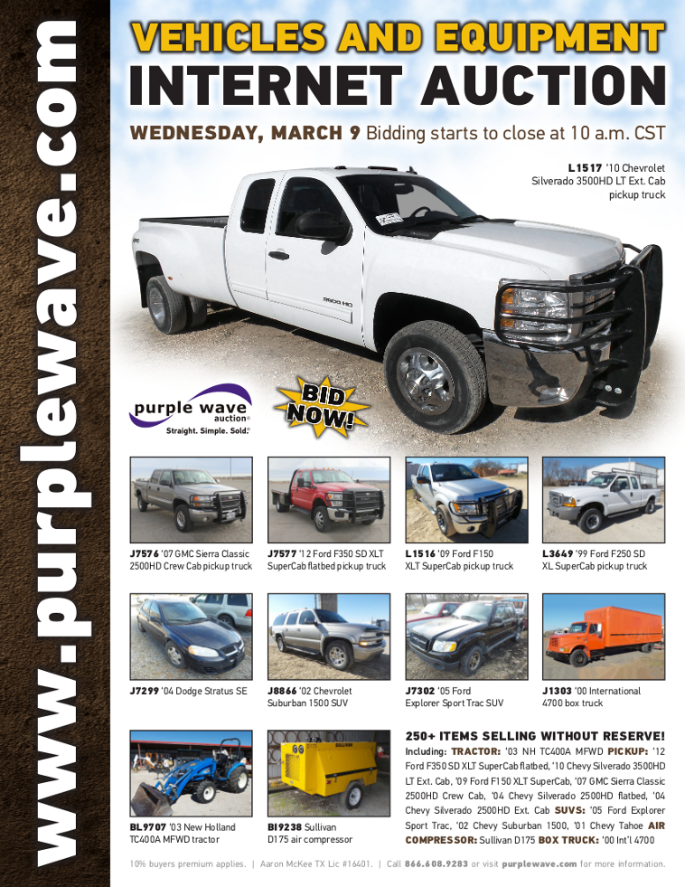 This auction is conducted by Purple Wave, Inc., whose home office is 825 Levee Drive, Manhattan, Kansas. Aaron McKee, Texas auctioneer license # 16401, operates Purple Wave, Inc. Complaints against us may be directed to the Texas Department of Licensing and Regulation, P.O. Box 12157, Austin, Texas 78711, (512) 463-6599. For additional required information, see the attached document.