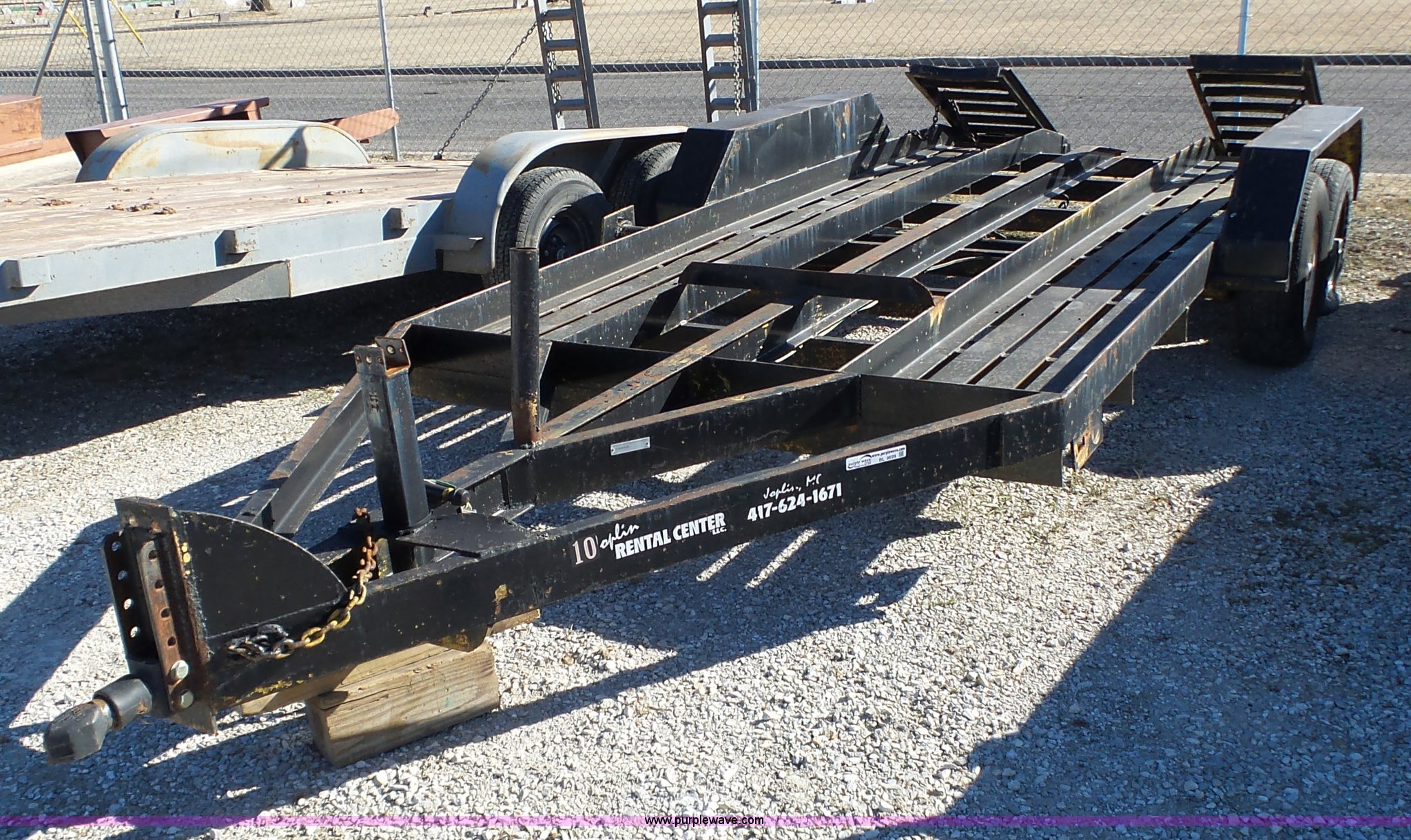 2005 shop built equipment trailer. 15.5'L x 78"W steel deck, Single leg landing gear, 2" ball hitch, Tandem axle, Spring suspension, P225/75R15 tires, GAWR 6,000 lbs per axle. MOHMTRAILER020342. Joplin Rental Center LLC.. 1617 W 10th. Joplin, MO 64801