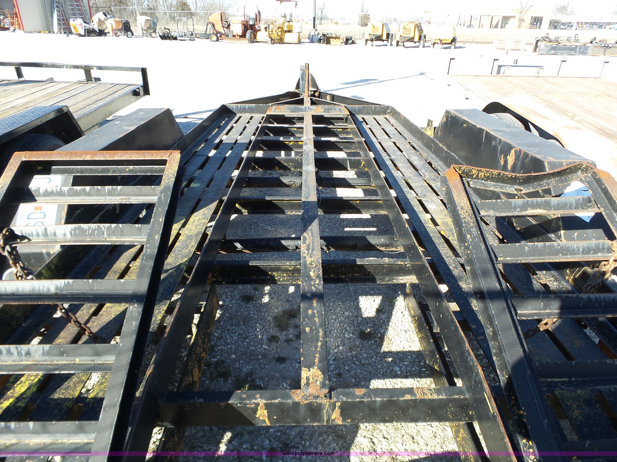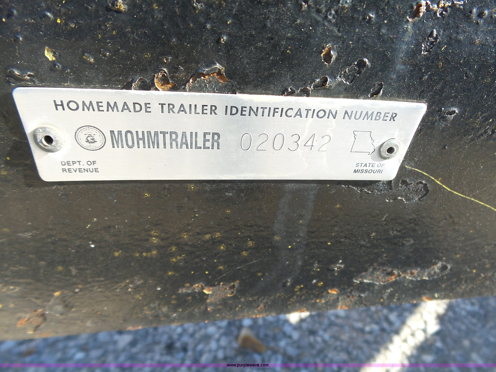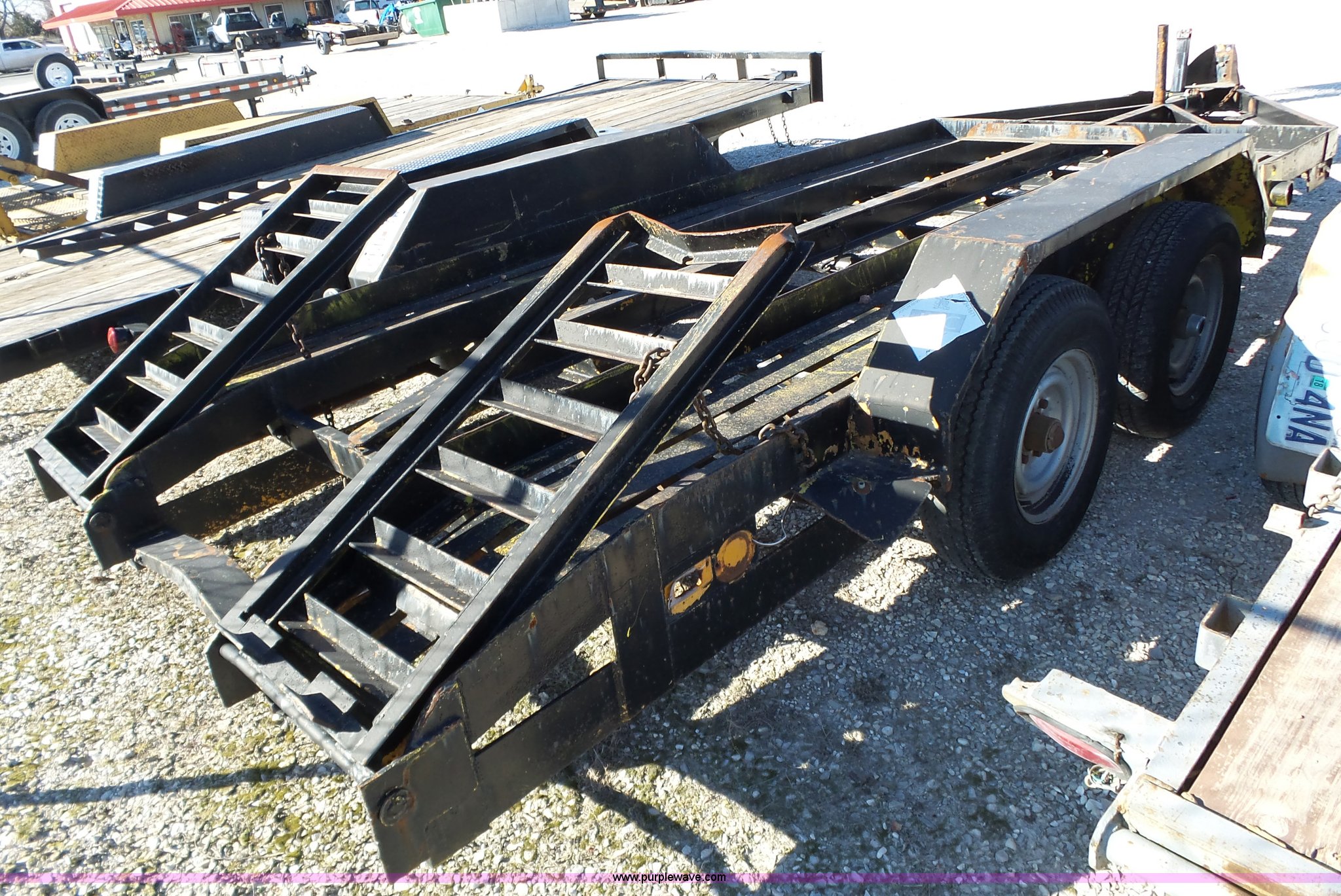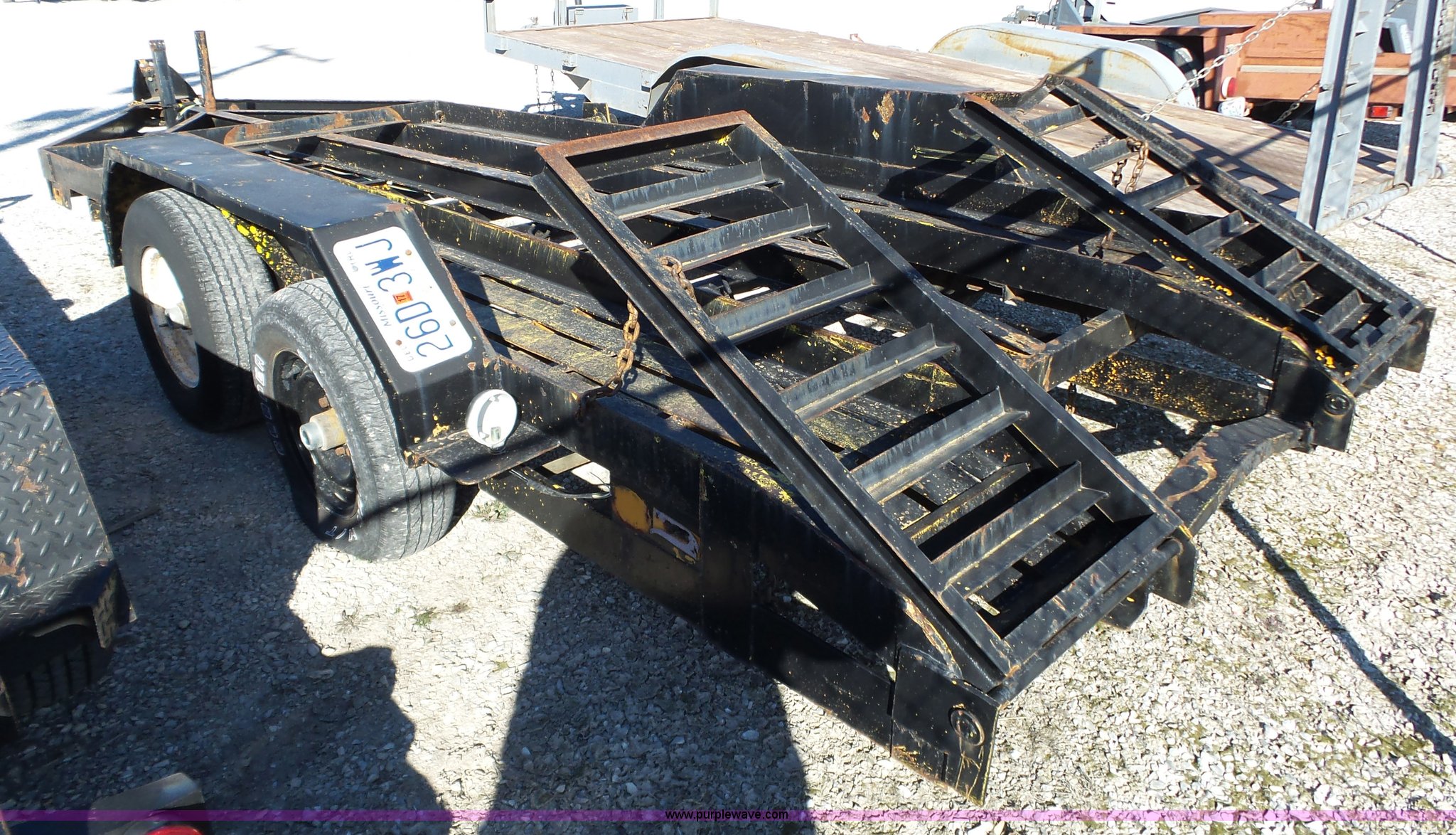 Purple Wave is selling a used Equip. Trailer in Missouri. This item is a 2005 shop built equipment trailer with the following: 15.5'L x 78"W steel deck, Single leg landing gear, 2" ball hitch, Tandem axle, Spring suspension, P225/75R15 tires, GAWR 6,000 lbs per axle