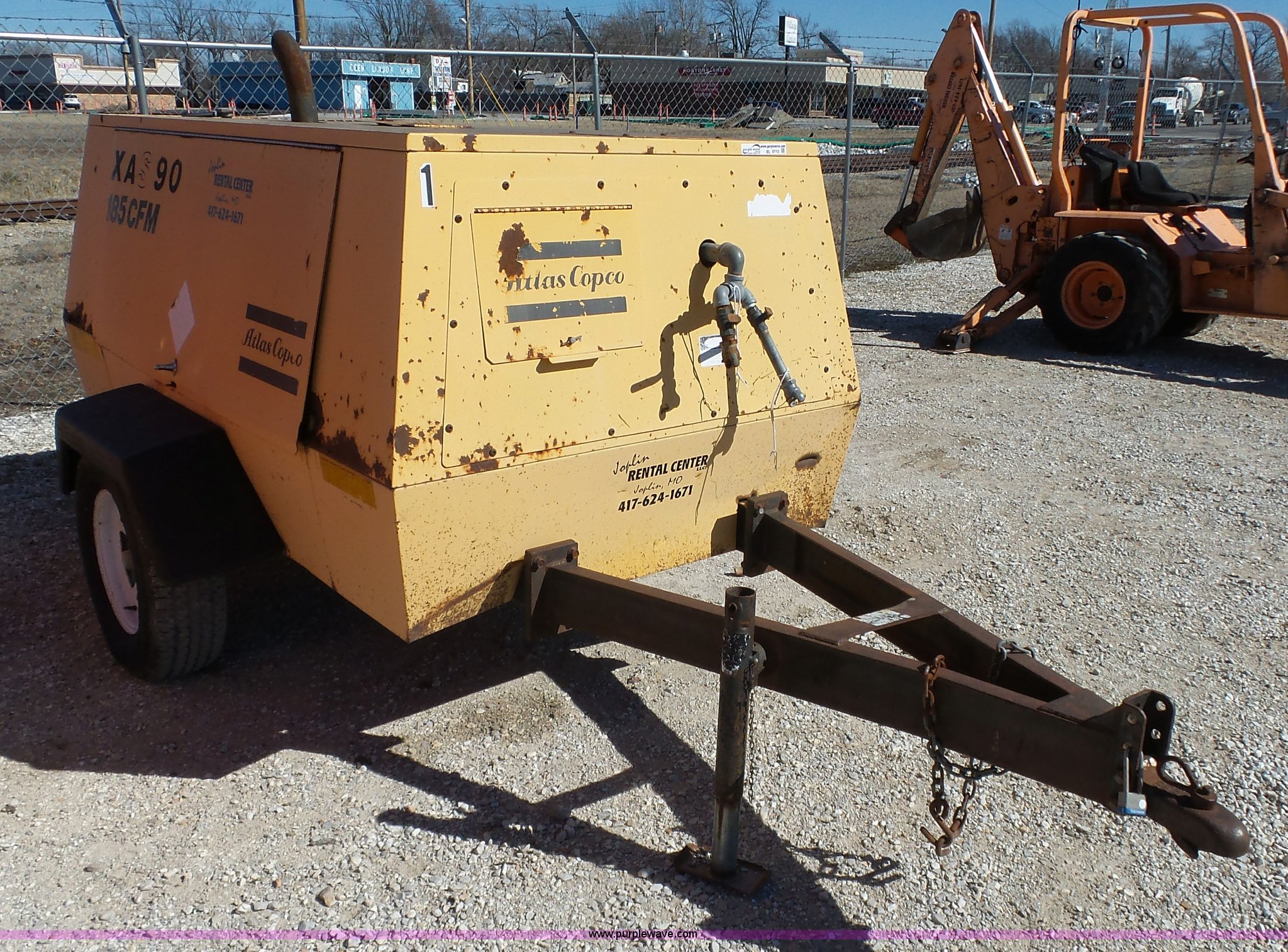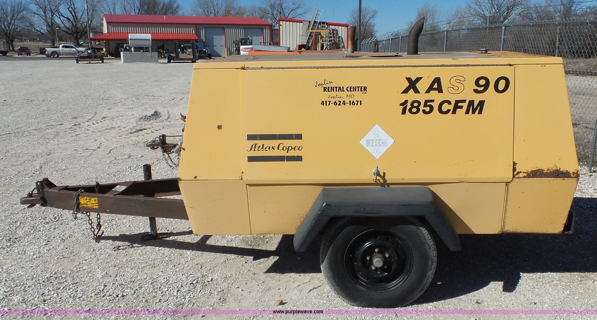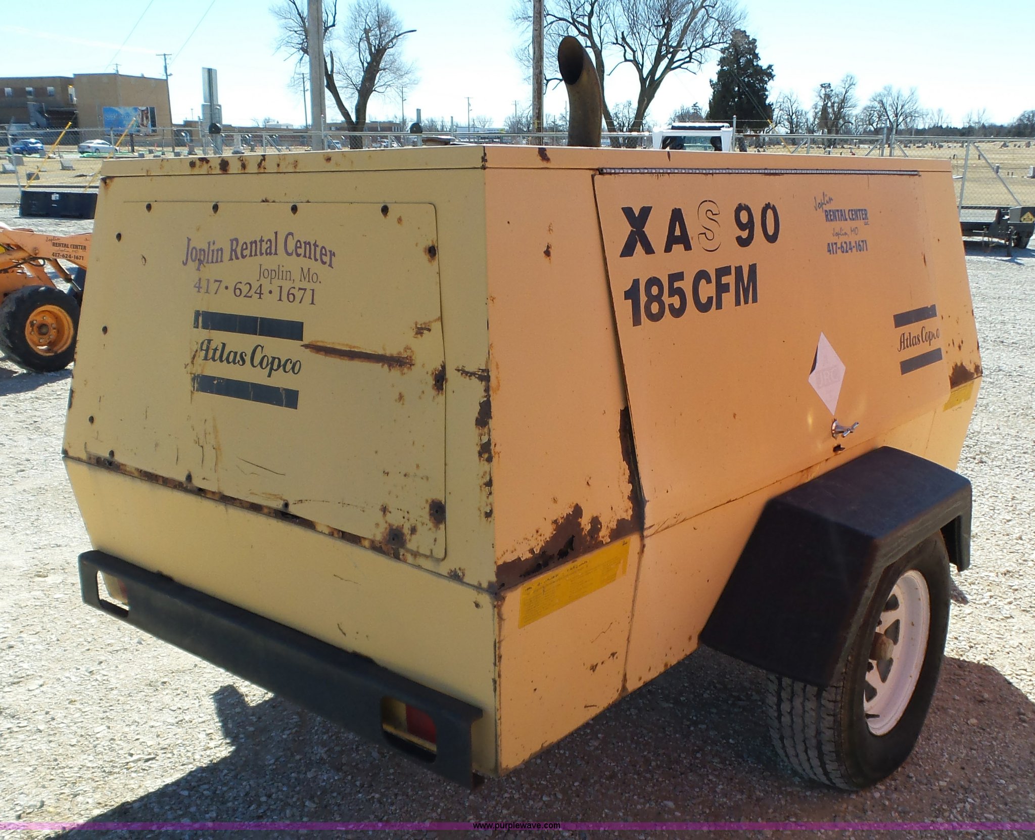 1995 Atlas Copco XAS 90 air compressor. 5,036 hours on meter, John Deere four cylinder diesel engine, 185 CFM, 116 psi, Ball hitch, 195R14 tires, Serial H0L602434. View equipment video. Joplin Rental Center LLC.. 1617 W 10th. Joplin, MO 64801
