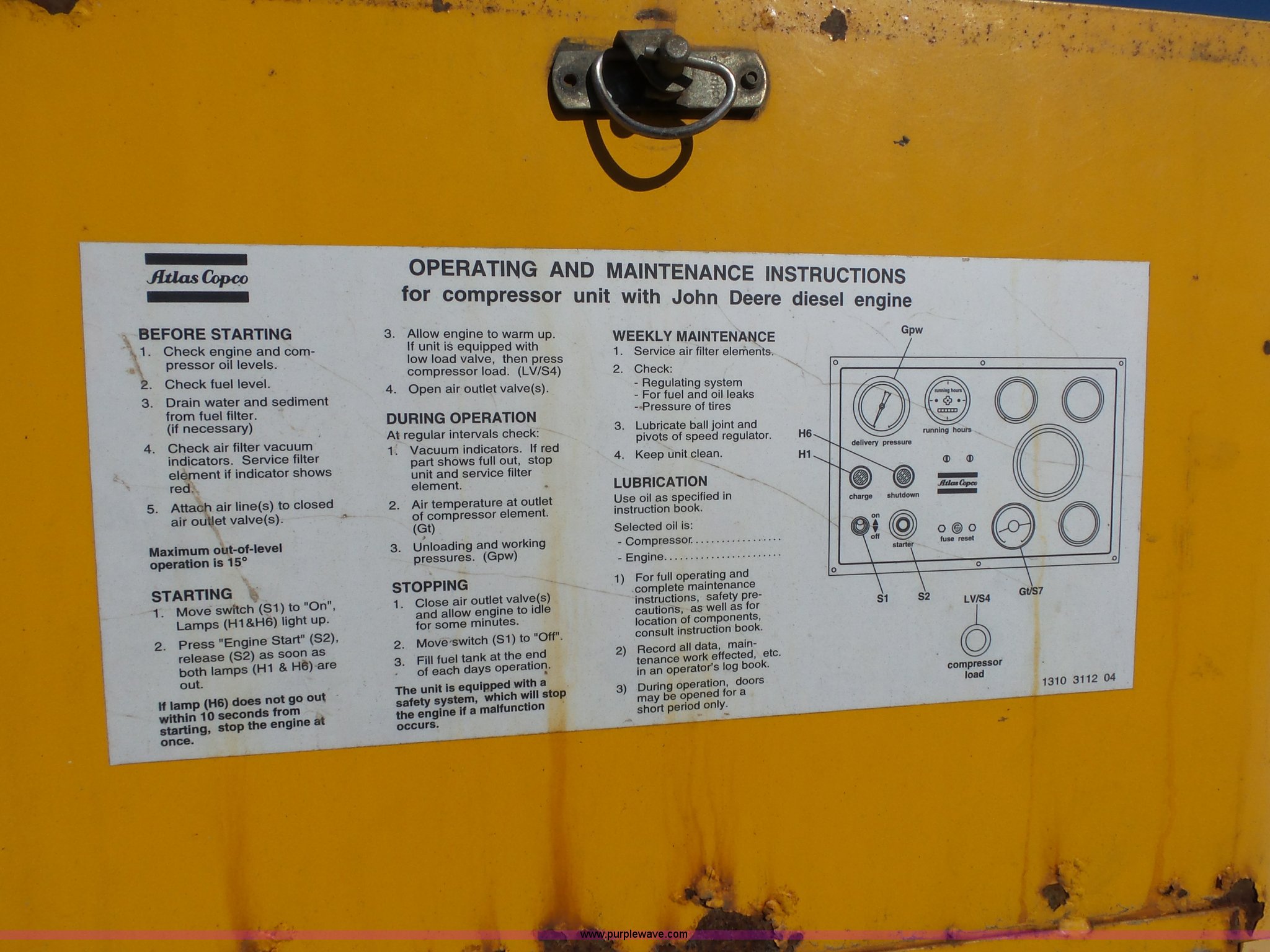 Purple Wave is selling a used Air Compressor in Missouri. This item is a 1995 Atlas Copco XAS 90 air compressor with the following: 5,036 hours on meter, John Deere four cylinder diesel engine, 185 CFM, 116 psi, Ball hitch, 195R14 tires, Serial H0L602434