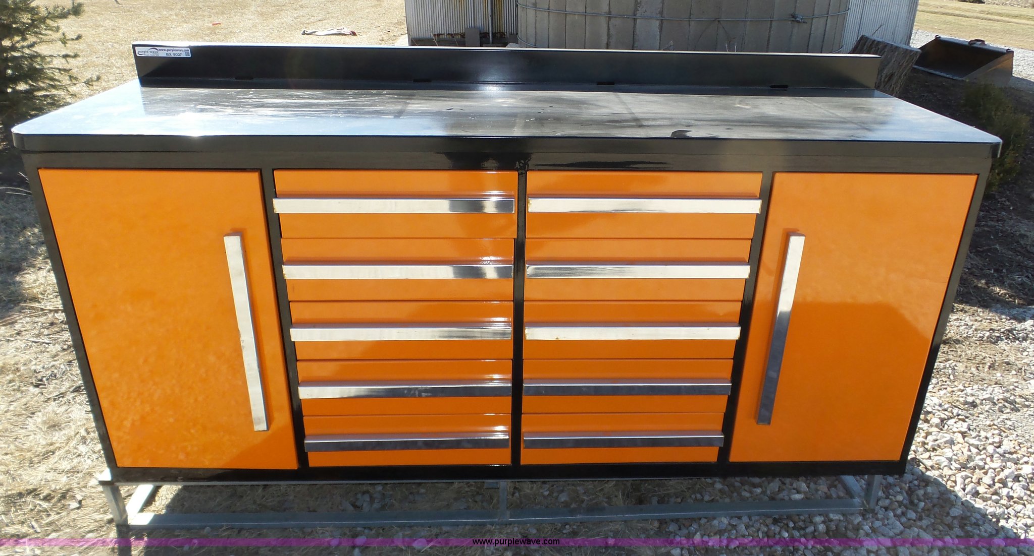 Purple Wave is selling a used Tools in Nebraska. This item is a Ten drawer tool chest with the following: Approximately 87"W x 26"D x 42"H, Approximately 38"H bench top, Approximately 4" back splash, (2) side compartments, Two adjustable shelves, Approximately 20"W x 23"D