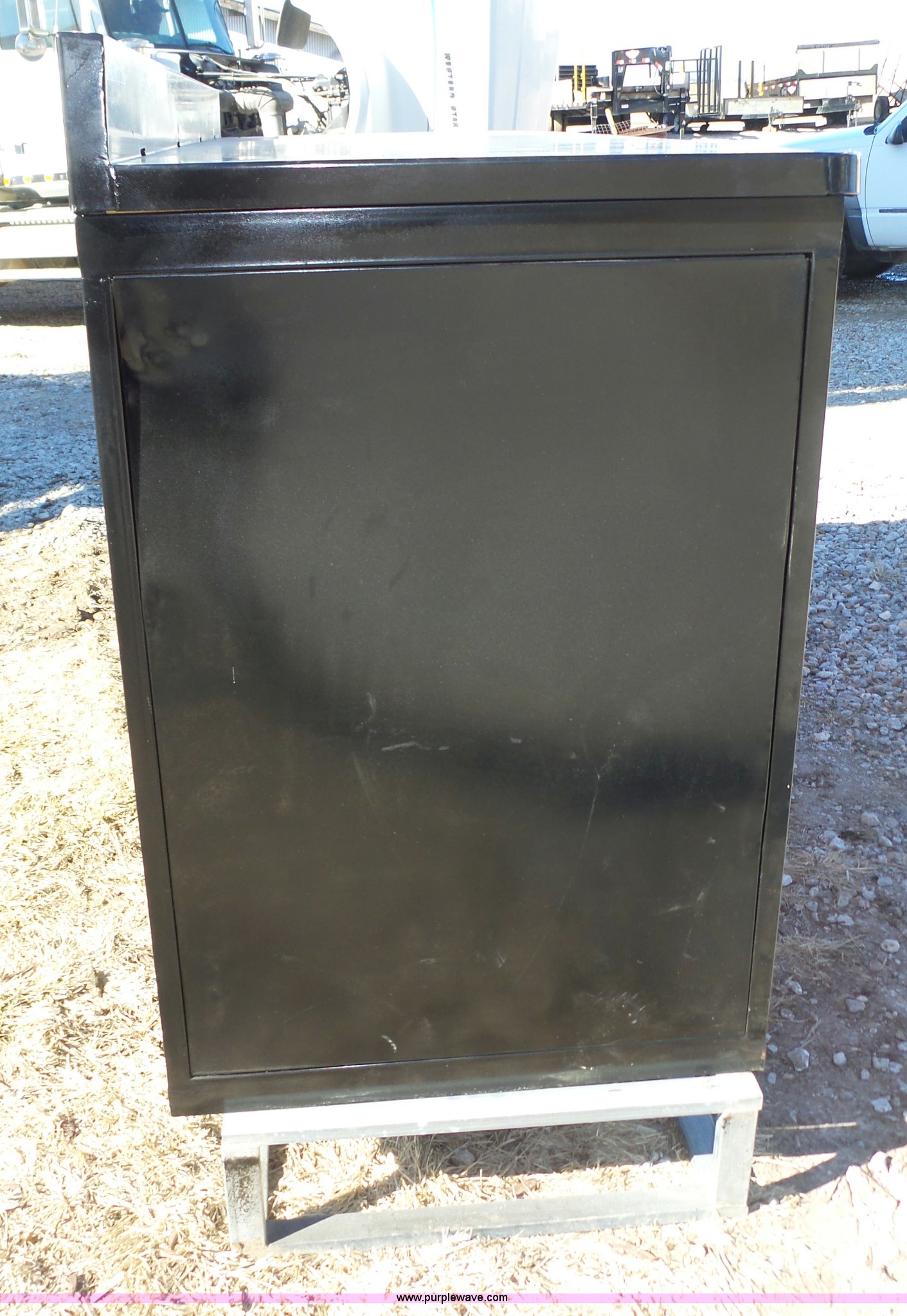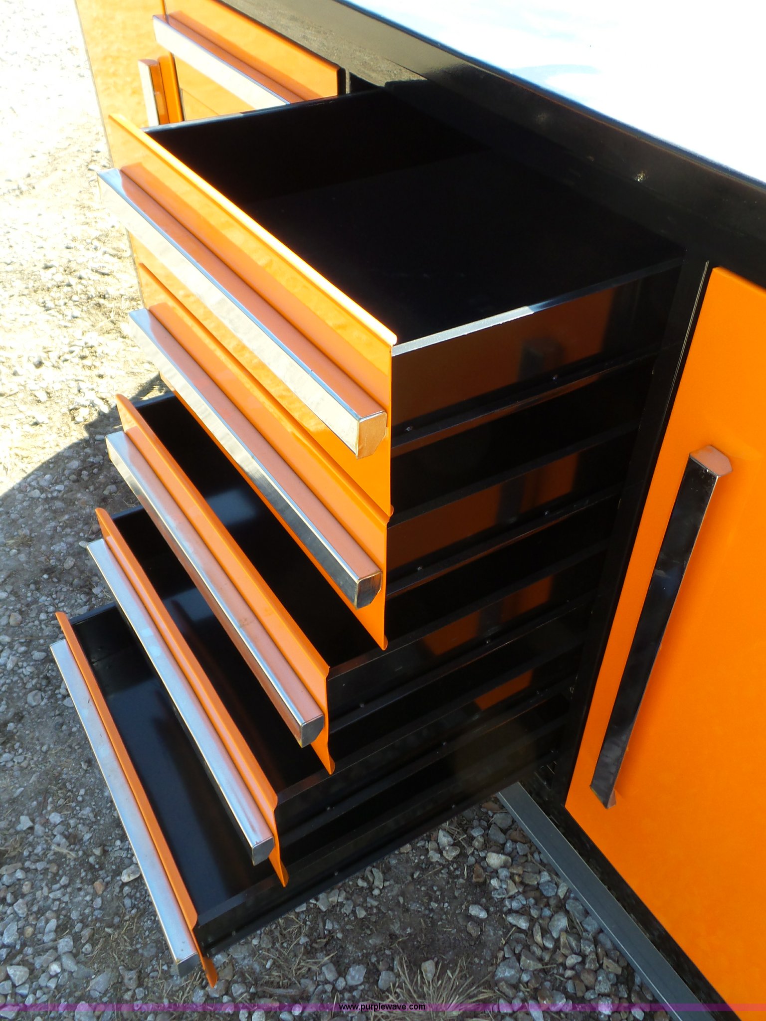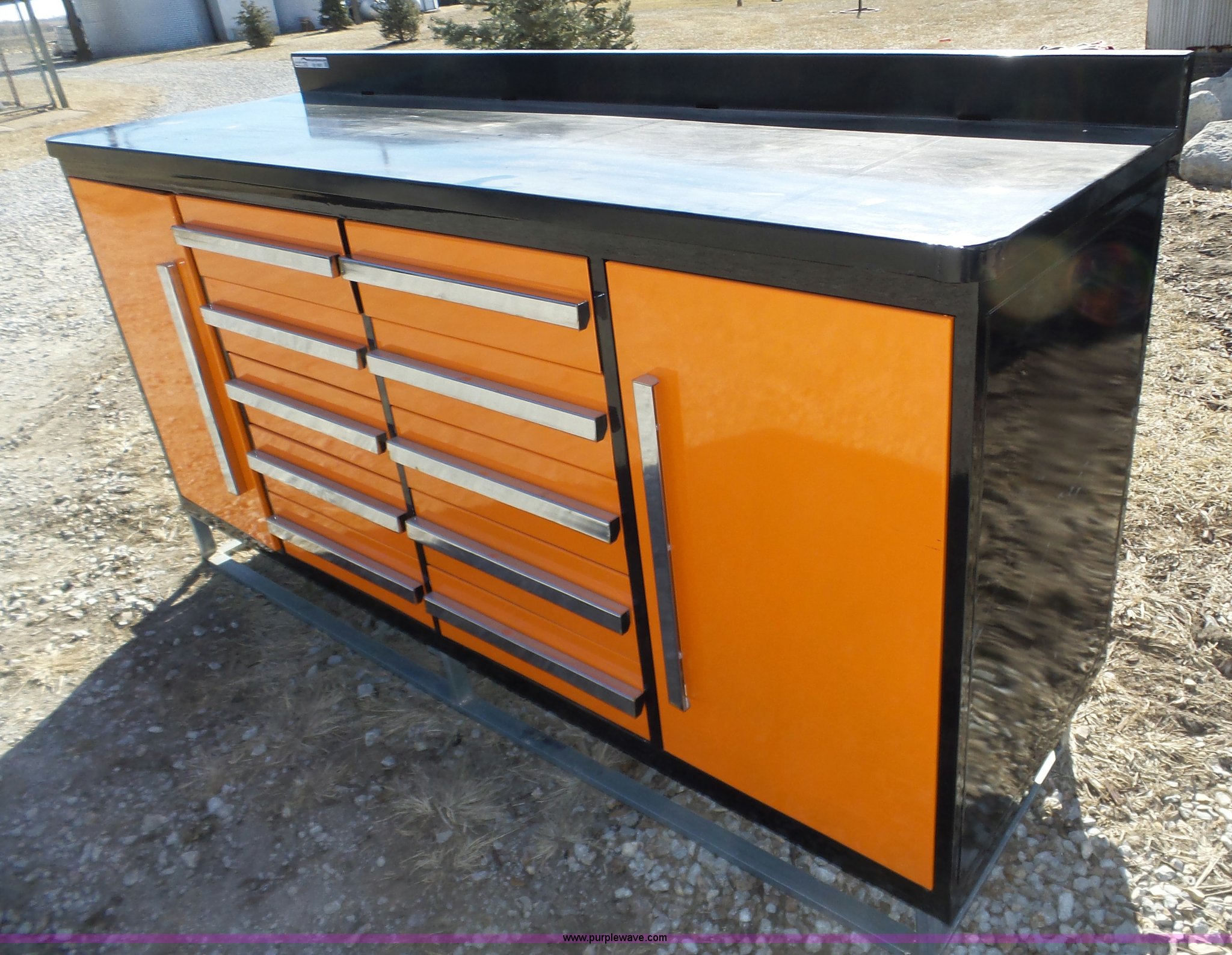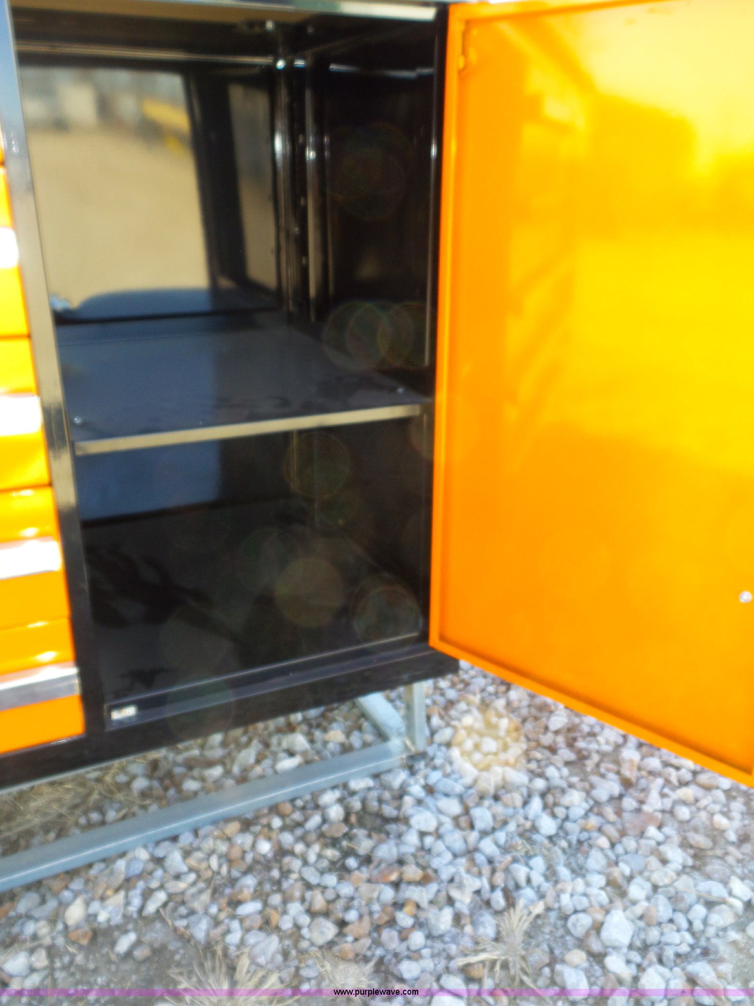Ten drawer tool chest. Approximately 87"W x 26"D x 42"H, Approximately 38"H bench top Approximately 4" back splash, (2) side compartments Two adjustable shelves, Approximately 20"W x 23"D. Scholl Lawn & Landscape LLC. 65111 710 Road. Falls City, NE 68355