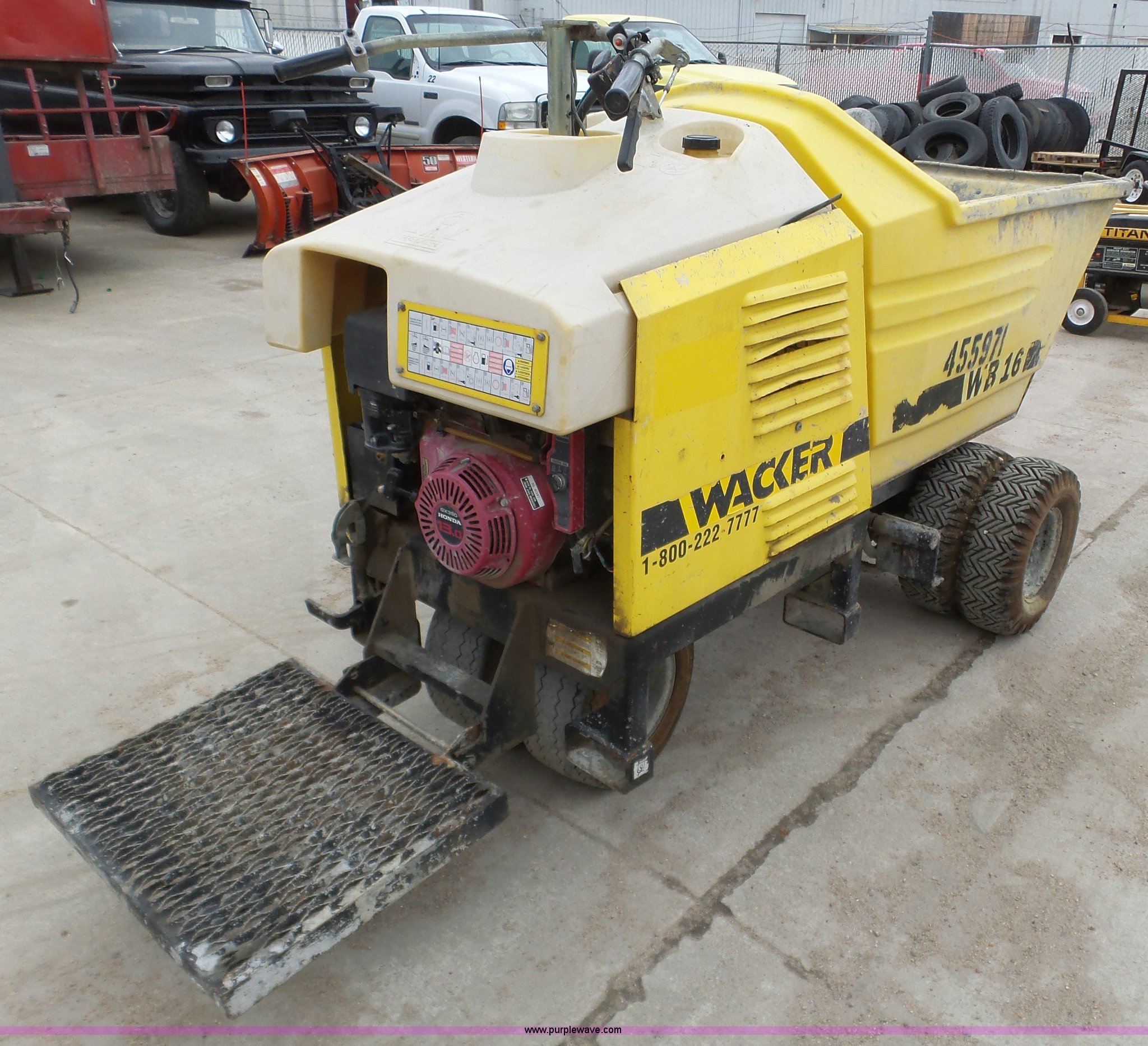 Purple Wave is selling a used Concrete Dispenser in Nebraska. This item is a Wacker WB16 power buggy with the following: Honda GX390 gas engine, 13 HP, Electric start, 16 cubic foot capacity, Forklift pockets, Rear platform, 5.70-8 drive tires, 16.5 x 6.5-8 steer tires, 1,475 lbs. base operating weight, Serial 5394542, Unit# 455971