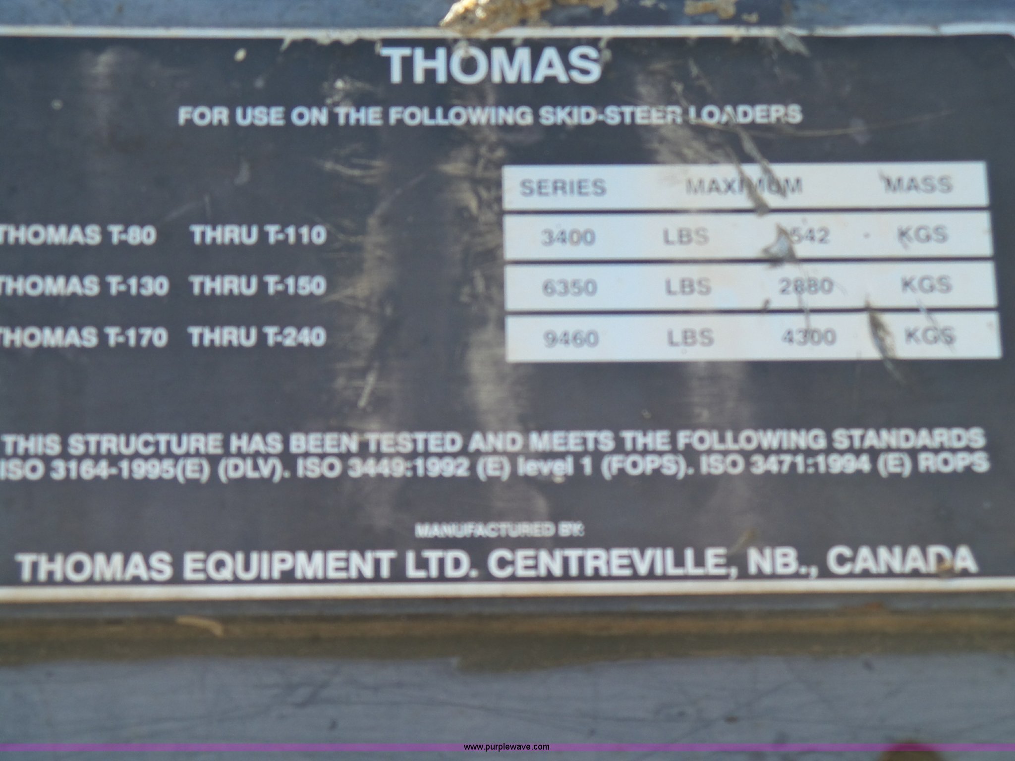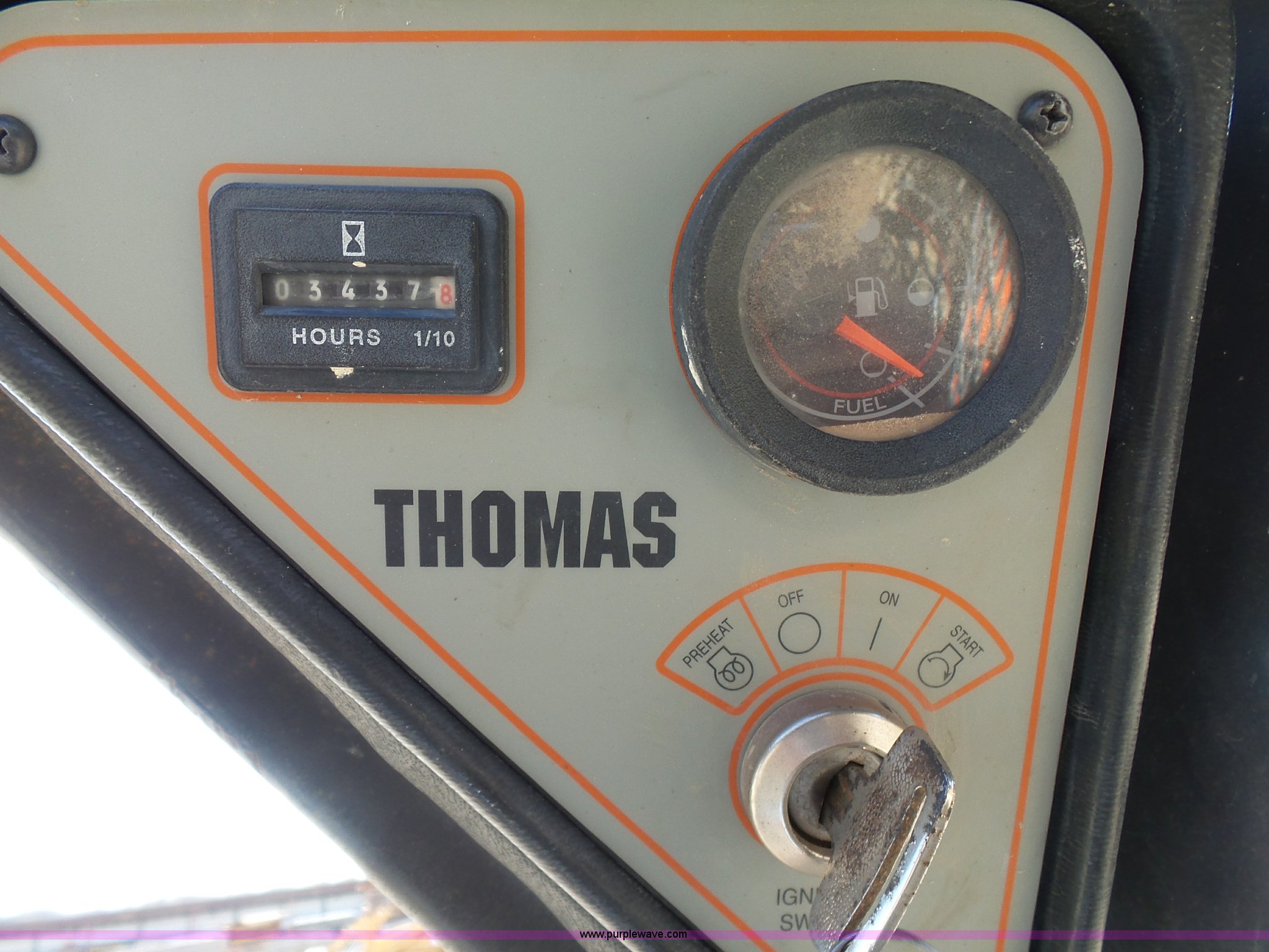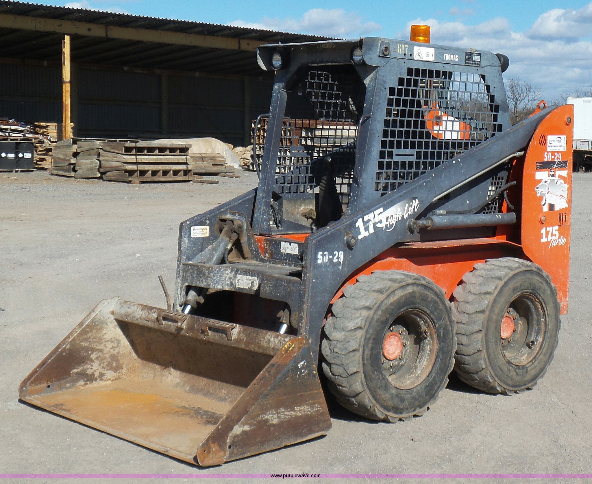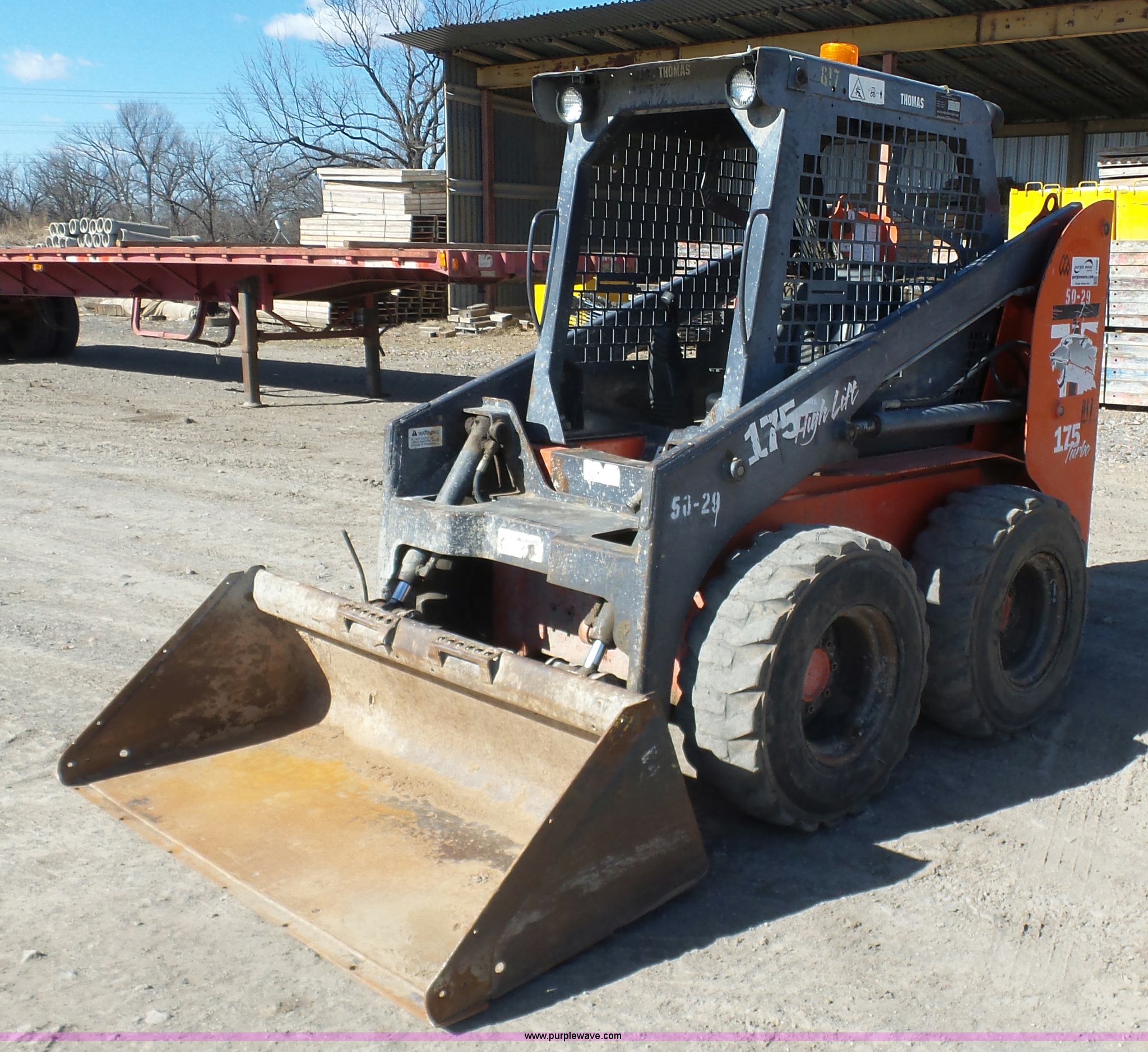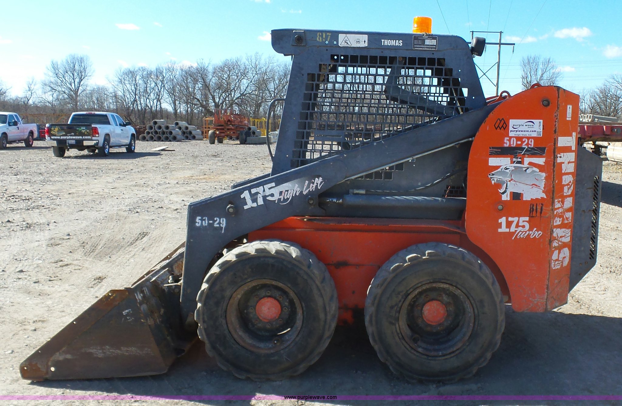Purple Wave is selling a used Skid Steer Loader in Oklahoma. This item is a Thomas 175 High Lift skid steer with the following: 3,437 hours on meter, Kubota four cylinder turbo diesel engine, Hydrostatic transmission, Joystick controls, Backup alarm, Front and rear work lights, Manual quick coupler, 5'7"W bucket, Model 7700B, 12-16.5 tires, Serial LQ000145, Unit# 5029
