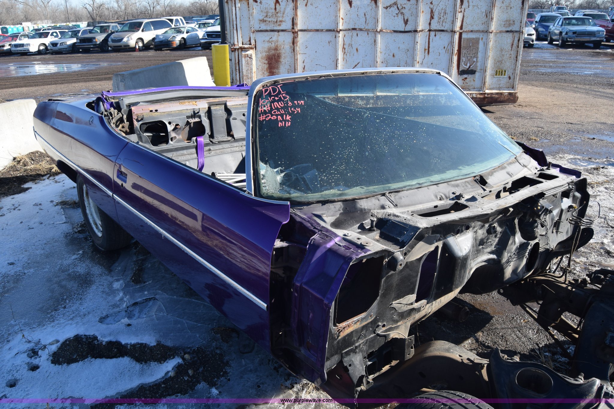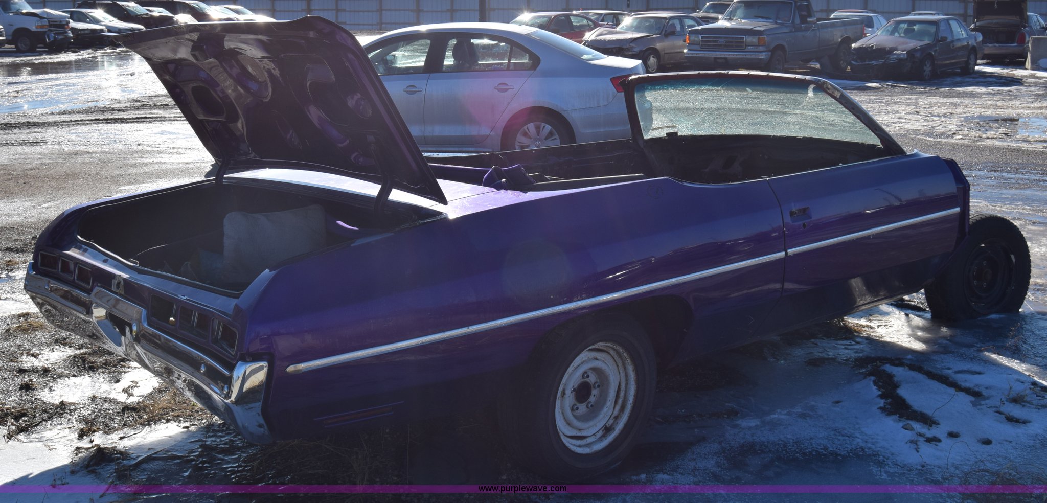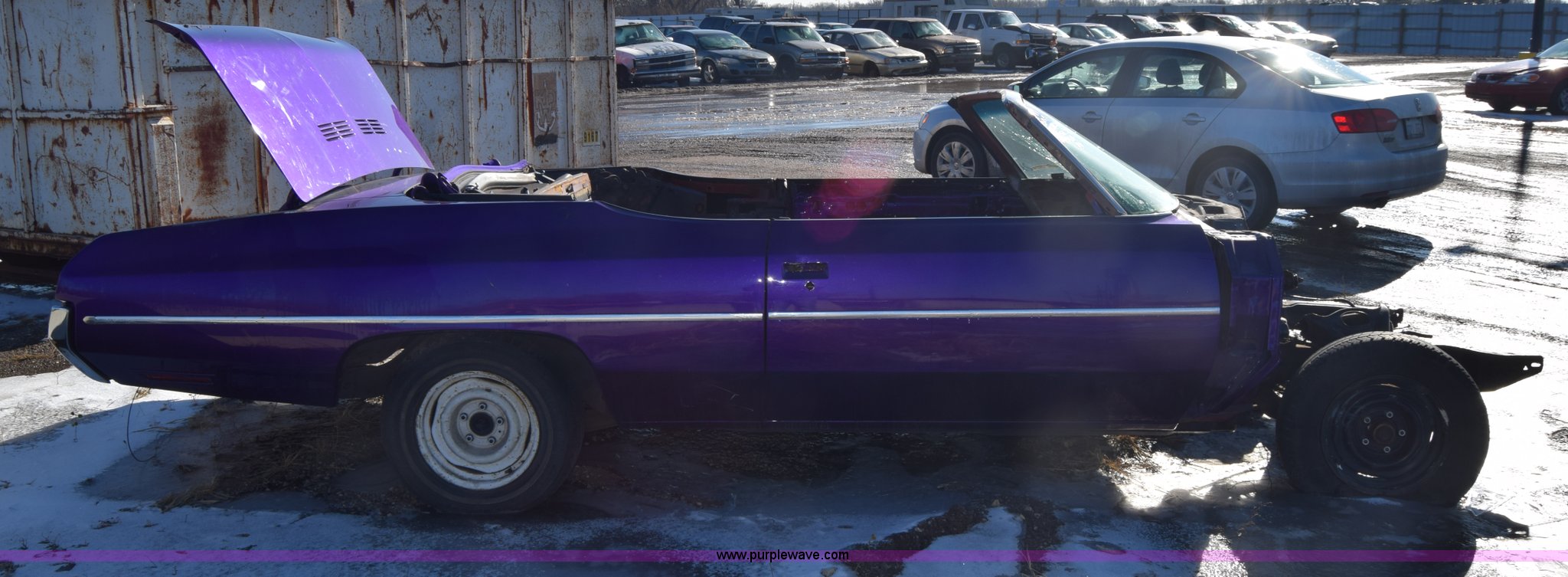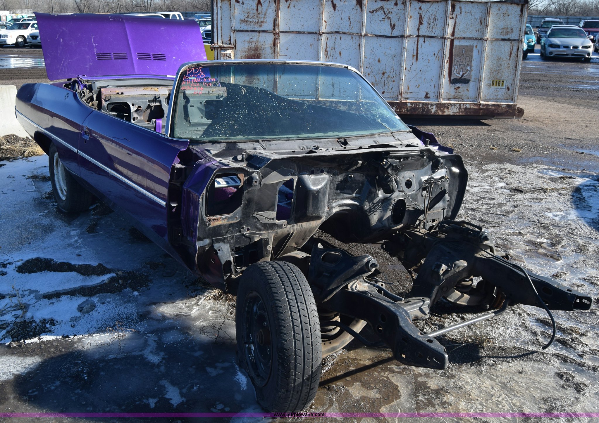 Purple Wave is selling a used Passenger Vehicle in Kansas. This item is a 1971 Chevrolet Impala with the following: Unknown miles on odometer, Engine removed, Transmission removed, 205/70R15 tires, Front end removed, One wheel removed, Parts missing, Seats missing, Windshield cracked, Interior/exterior cosmetic damage, Dents and scratches, Case# 15C027355