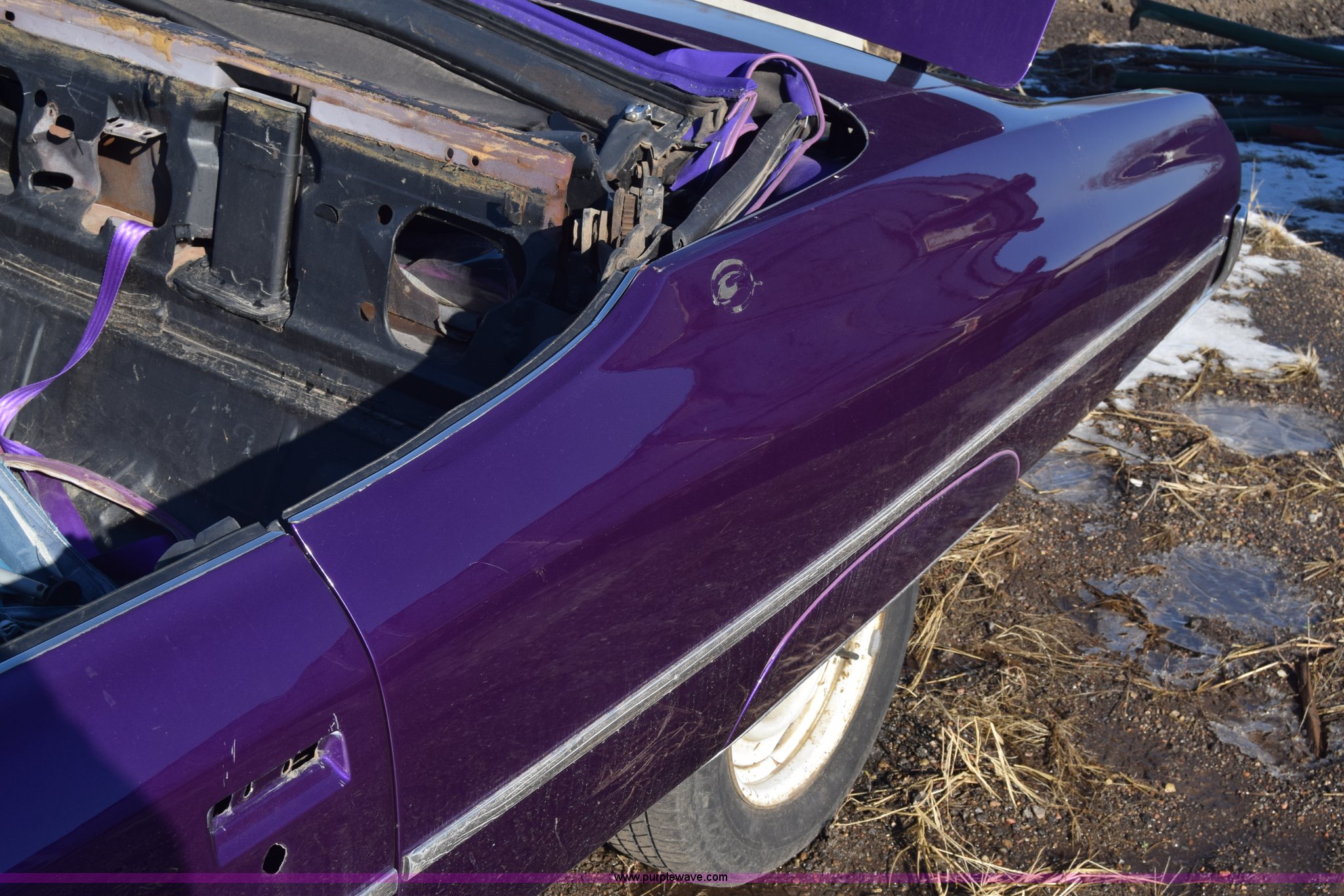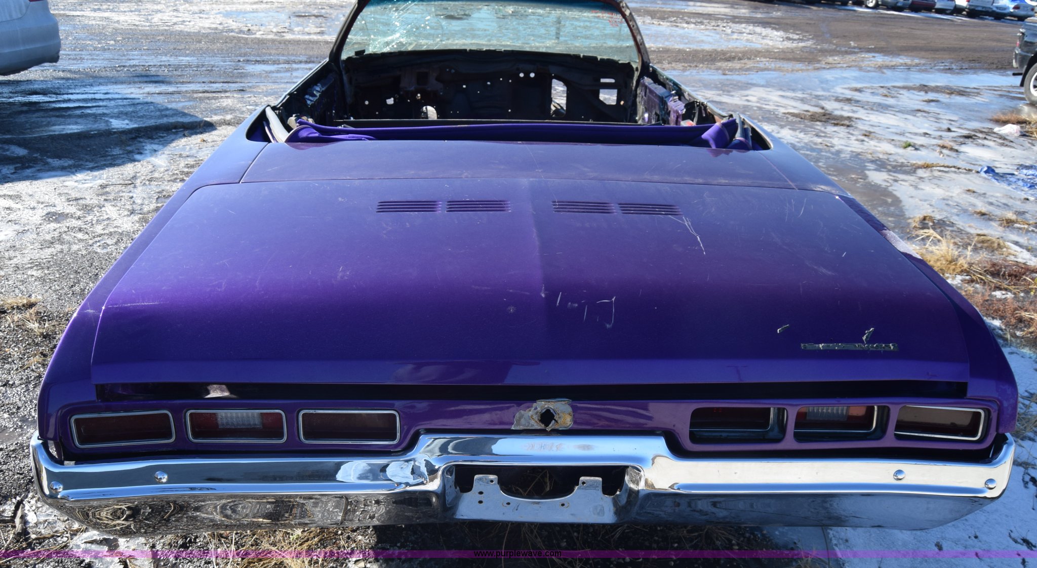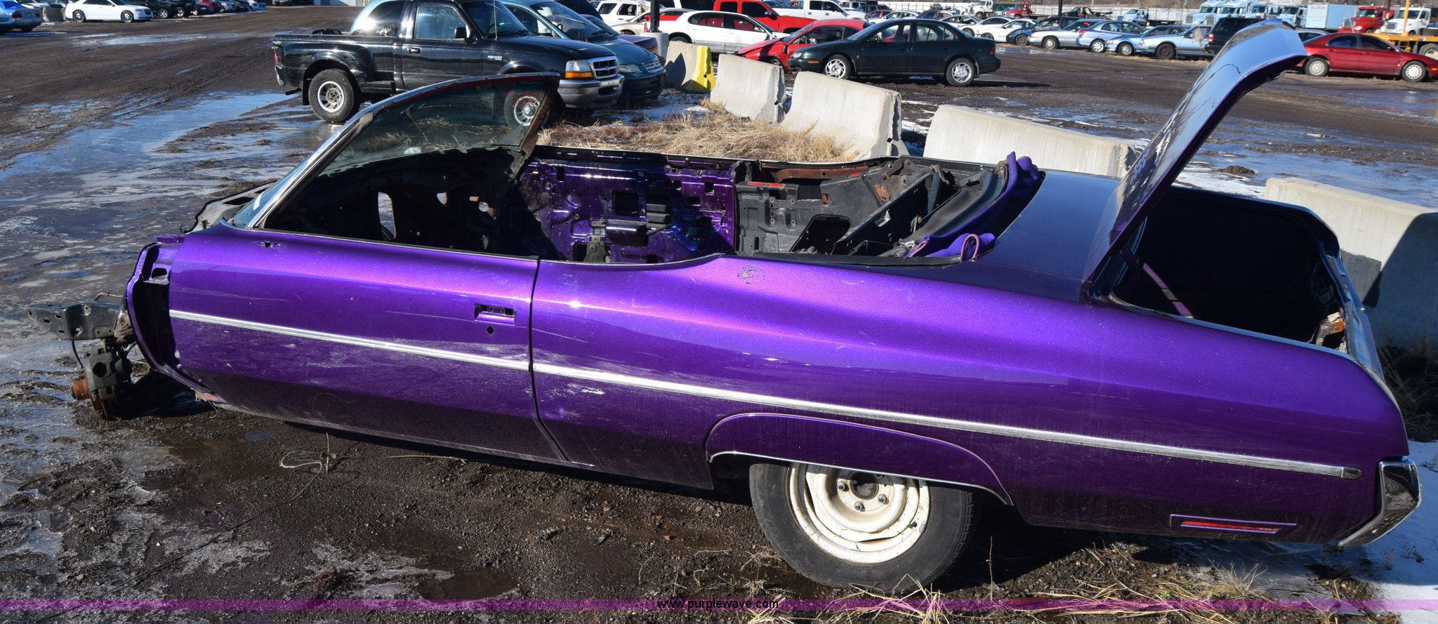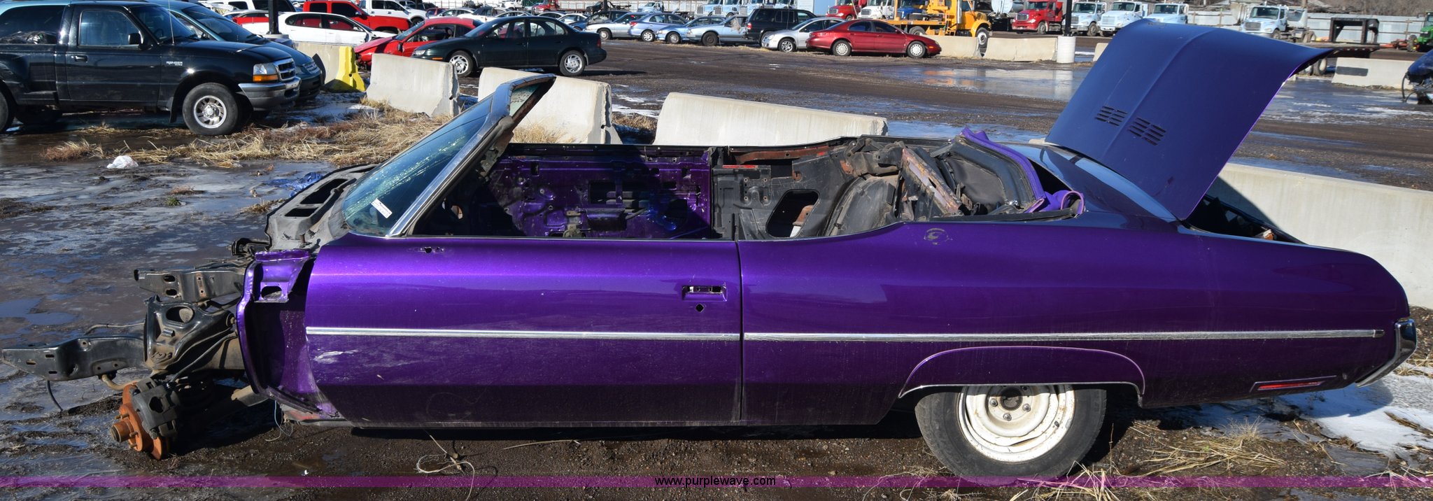 Purple Wave is selling a used Passenger Vehicle in Kansas. This item is a 1971 Chevrolet Impala with the following: Unknown miles on odometer, Engine removed, Transmission removed, 205/70R15 tires, Front end removed, One wheel removed, Parts missing, Seats missing, Windshield cracked, Interior/exterior cosmetic damage, Dents and scratches, Case# 15C027355