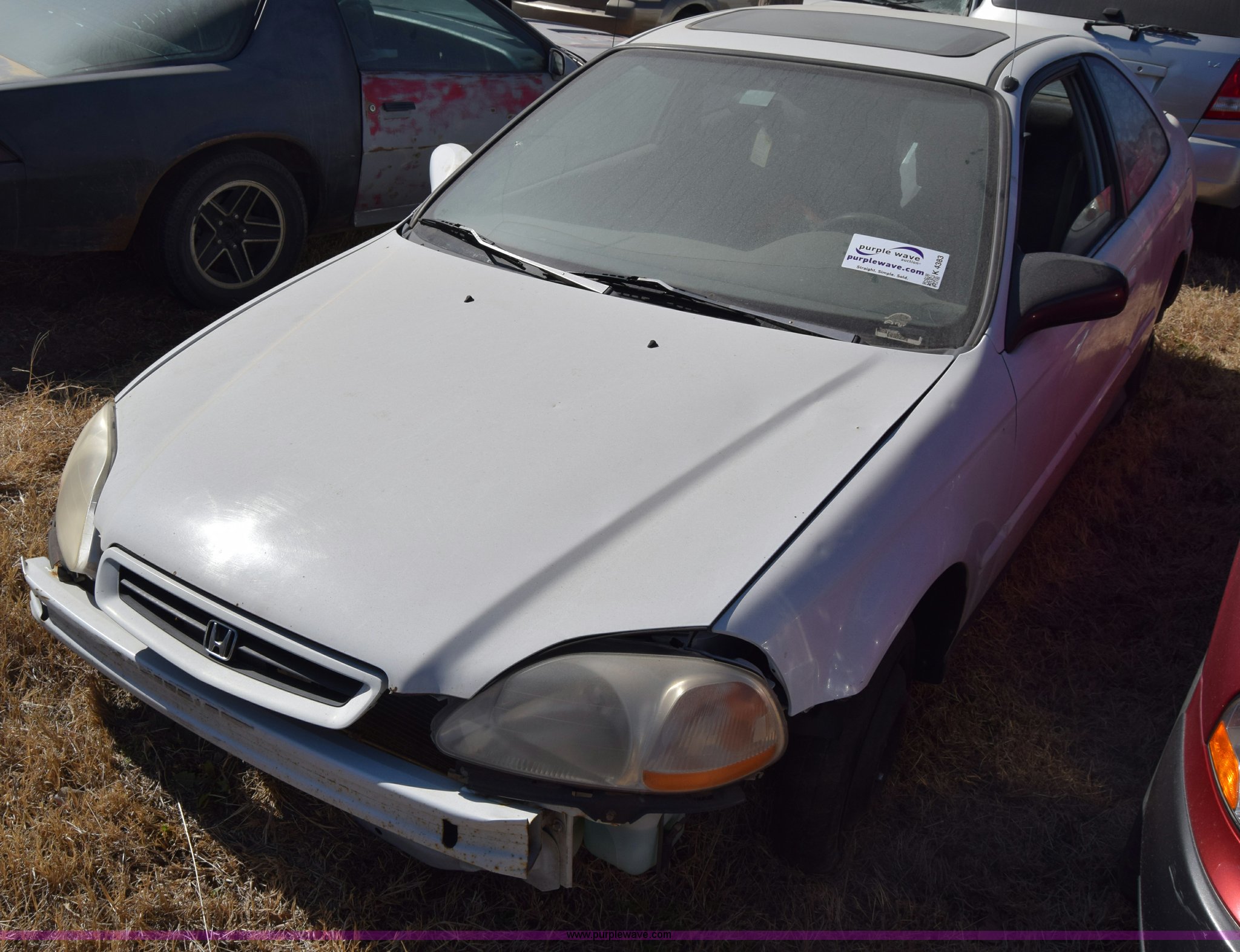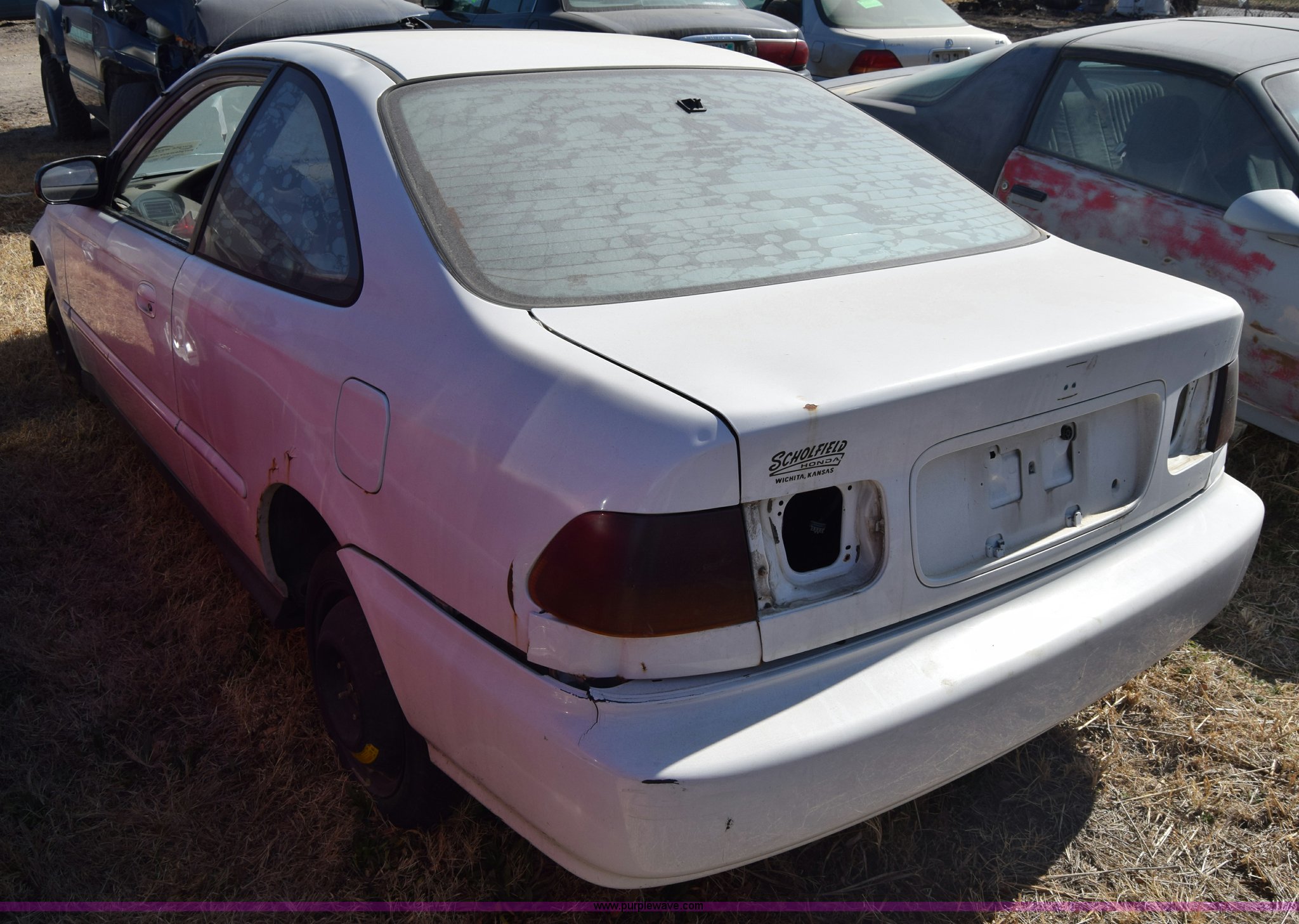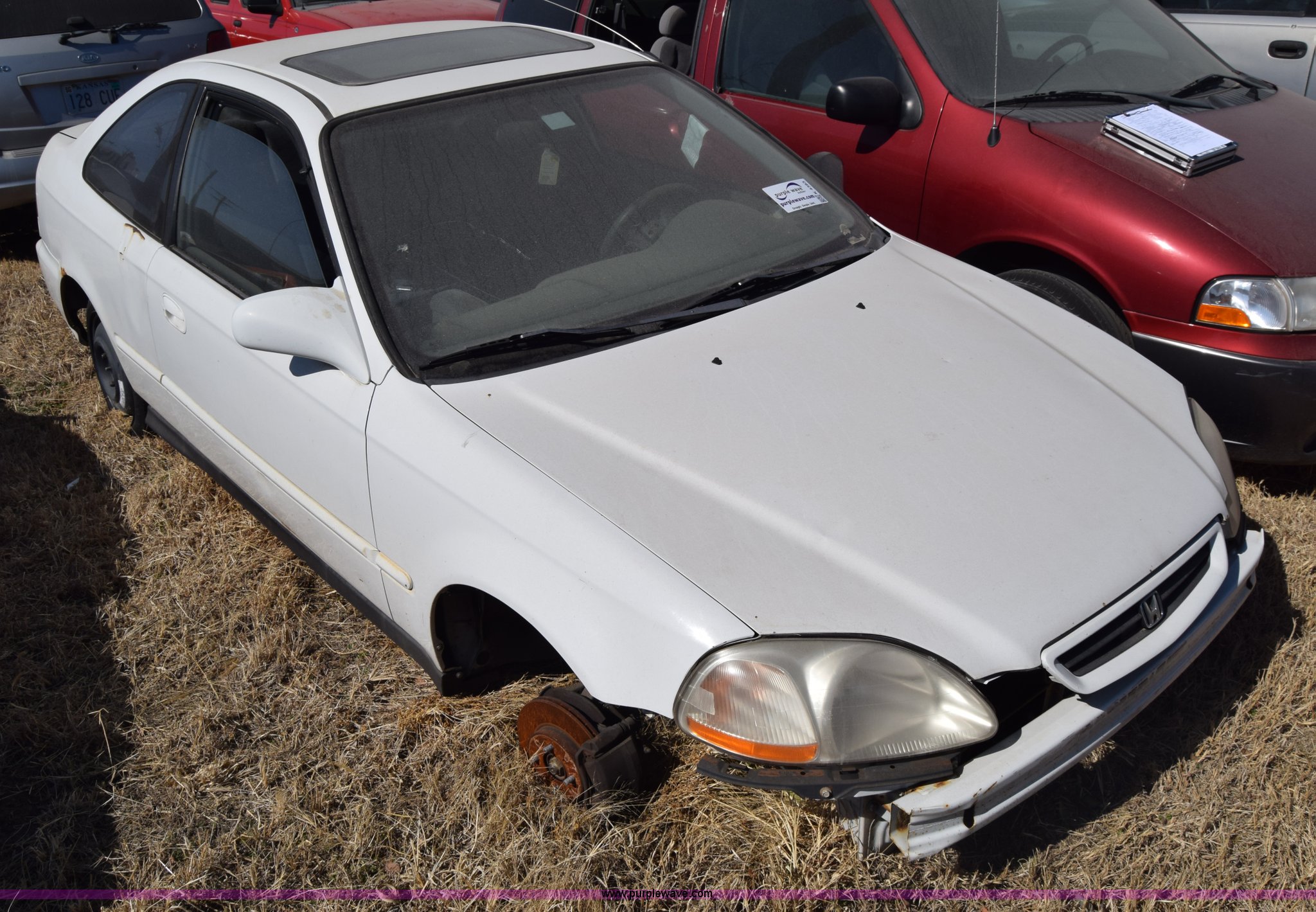 Purple Wave is selling a used Passenger Vehicle in Kansas. This item is a 1996 Honda Civic with the following: 127,099 miles on odometer, 1.6L L4 SOHC 16V gas engine, Manual transmission, AC and heat, Power windows, locks, and mirrors, Sunroof, 105/70D15 tires, Interior/exterior cosmetic damage, Dents and scratches, Wheel removed, Seats removed, Stereo removed, Case# 15C517683