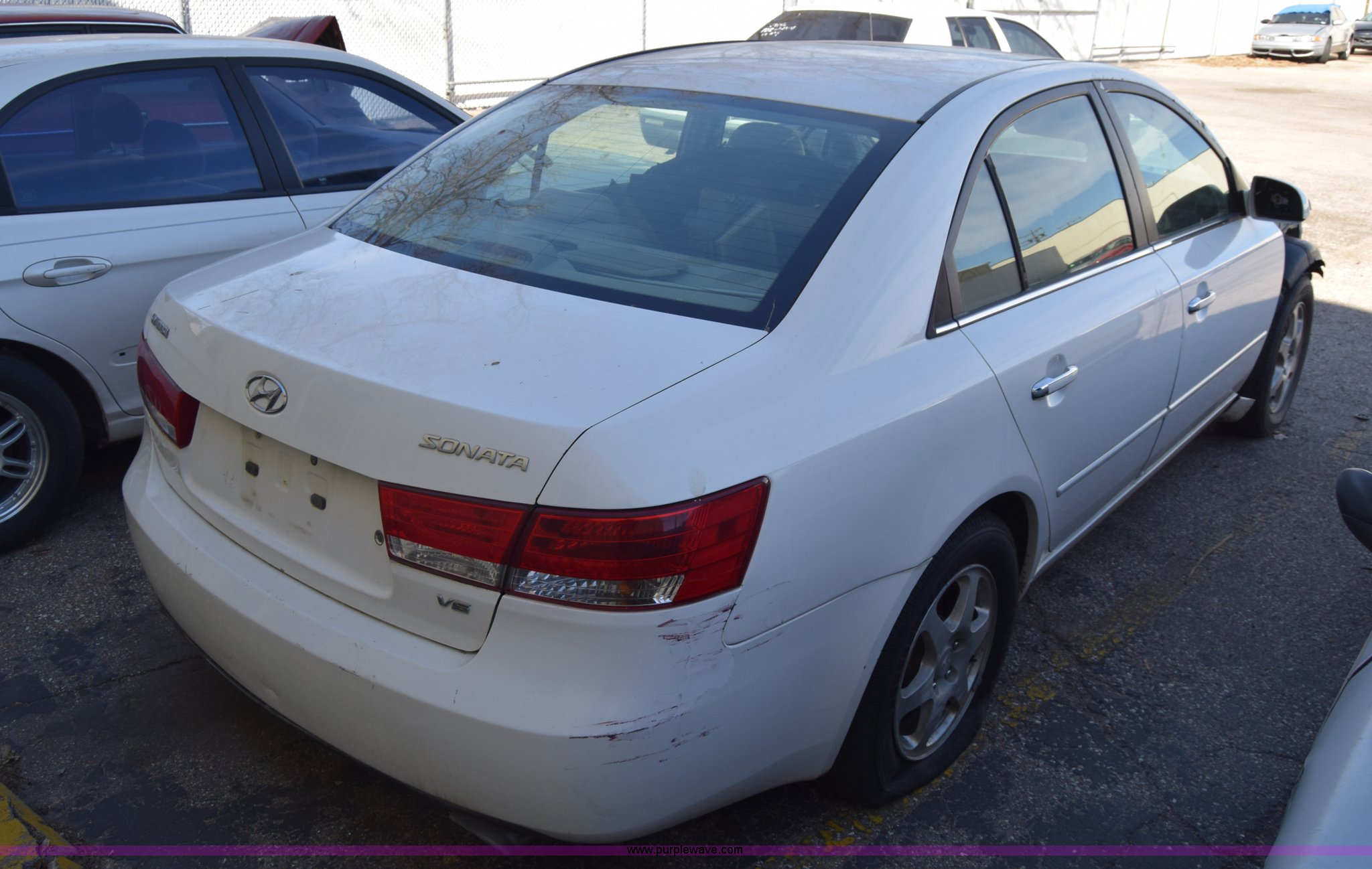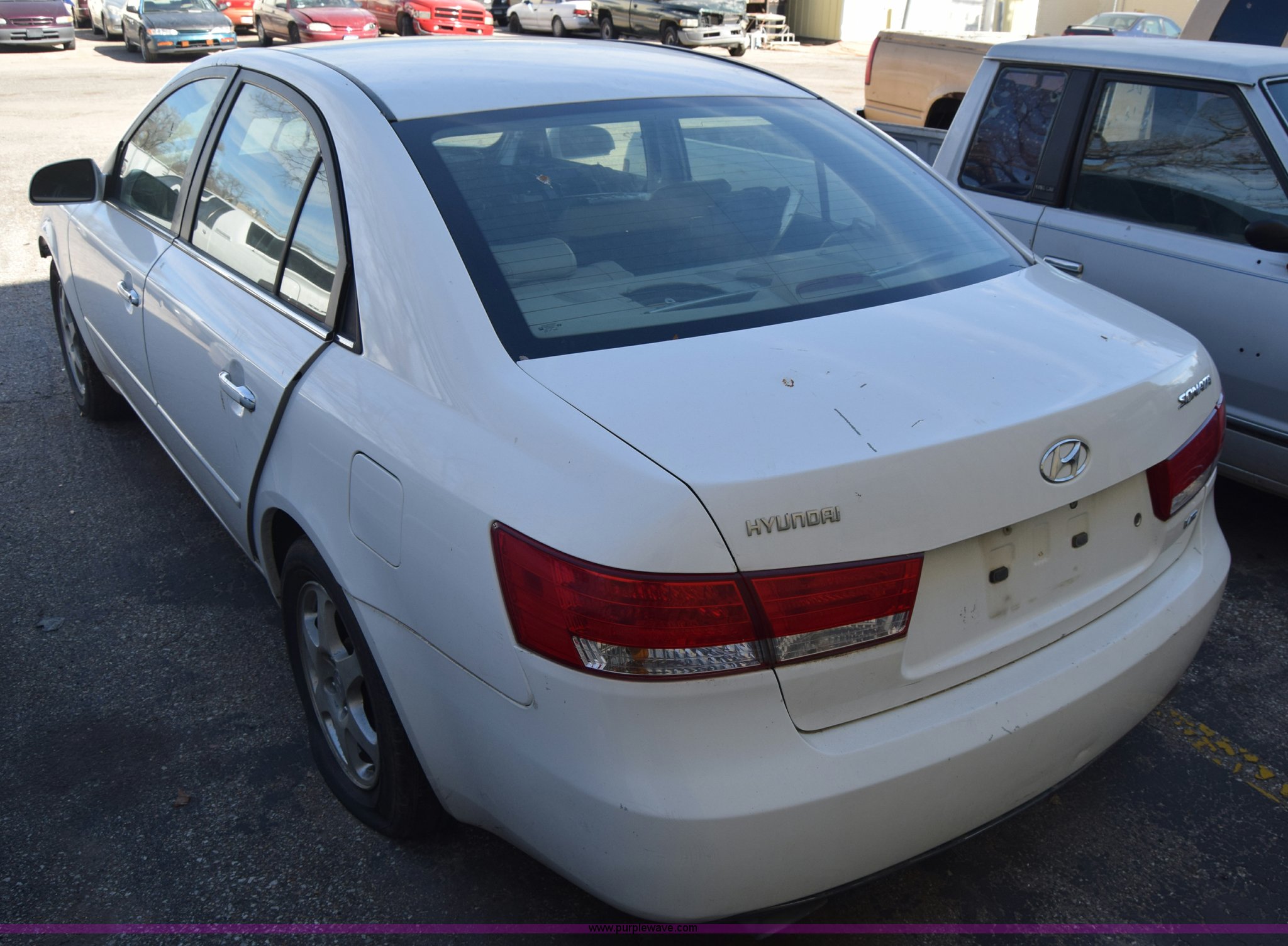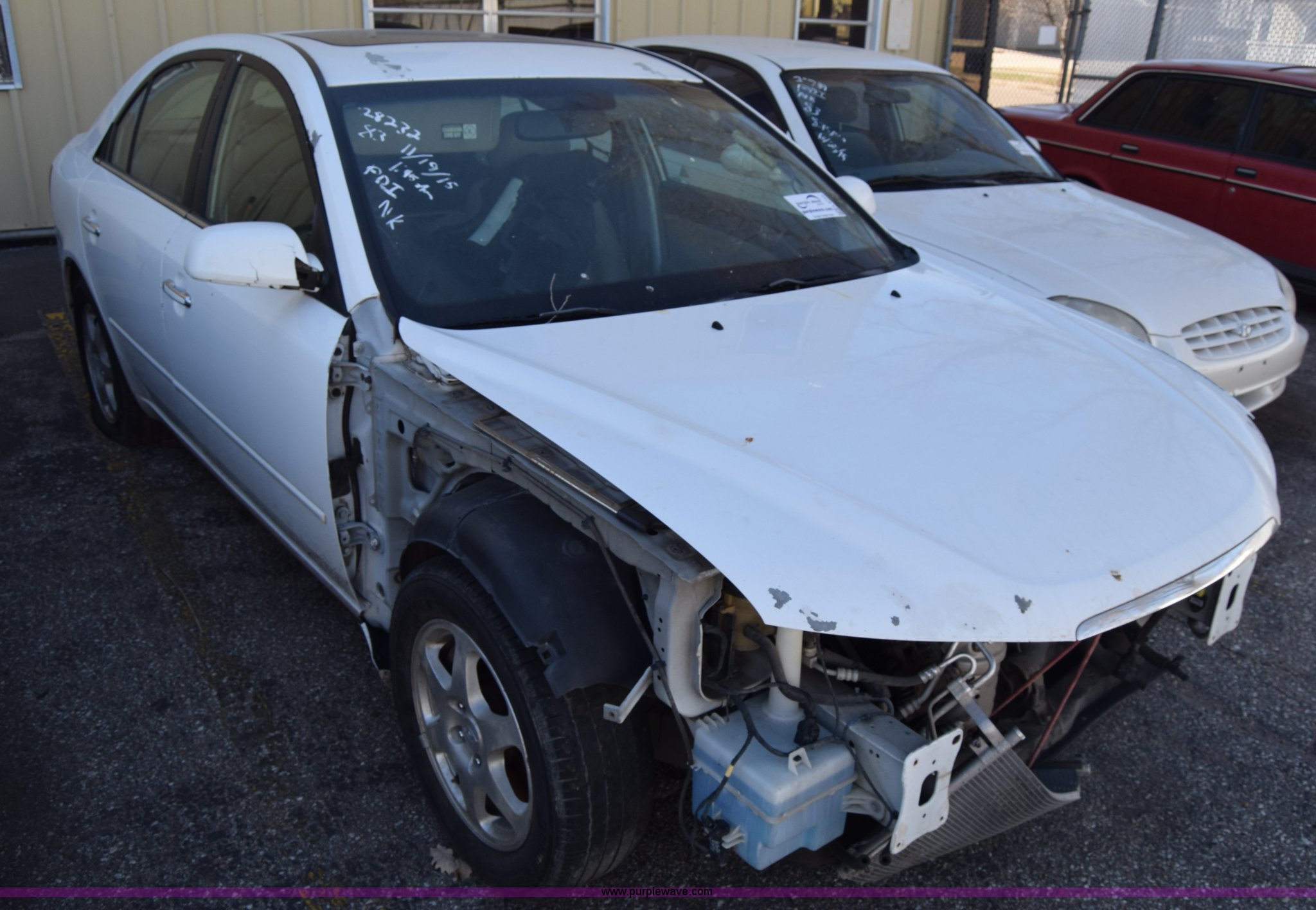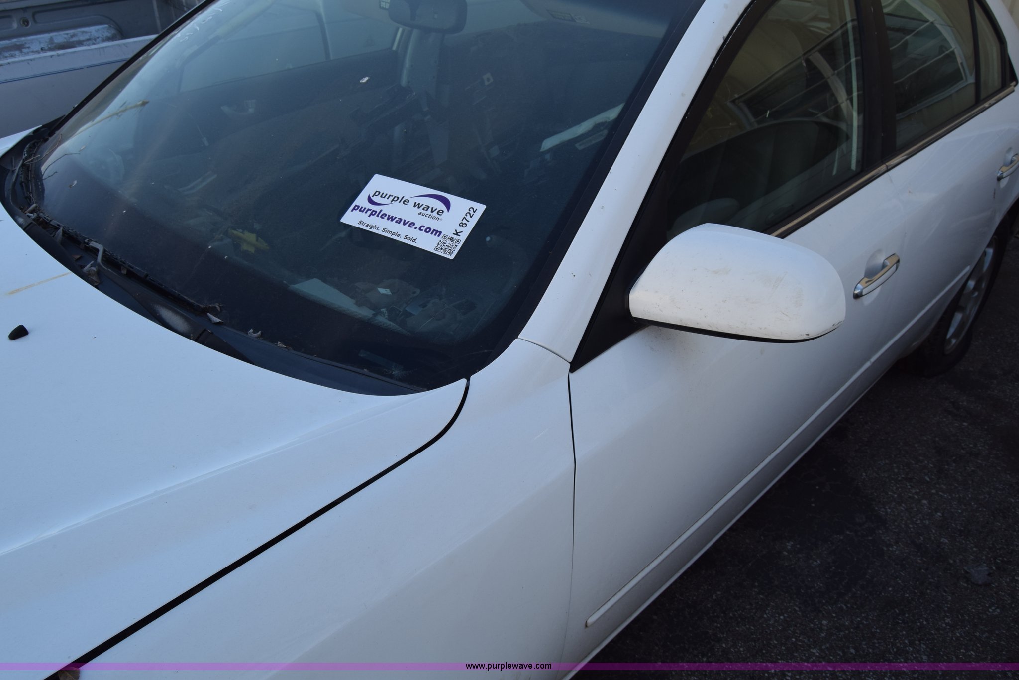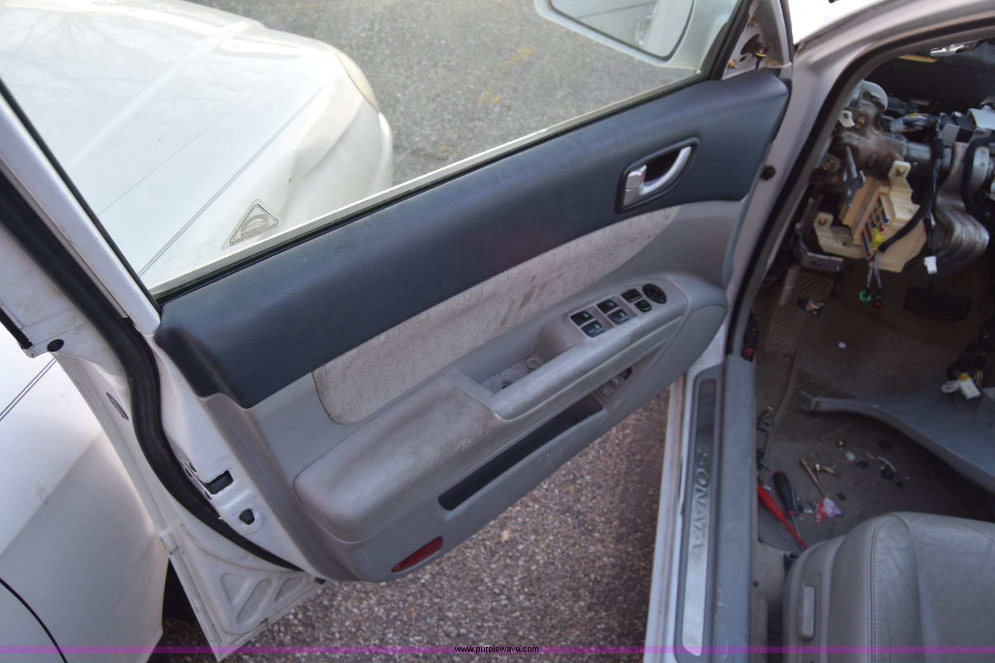 Purple Wave is selling a used Passenger Vehicle in Kansas. This item is a 2006 Hyundai Sonata with the following: Unknown miles on odometer, 3.3L V6 DOHC 24V gas engine, Automatic transmission, AC and heat, Power windows, locks, and mirrors, Vinyl interior, Sunroof, 215/60R16 tires, Interior/exterior cosmetic damage, Dents and scratches, Front bumper removed, Front fender removed, Interior stripped, Windshield cracked, Case# 15C510864