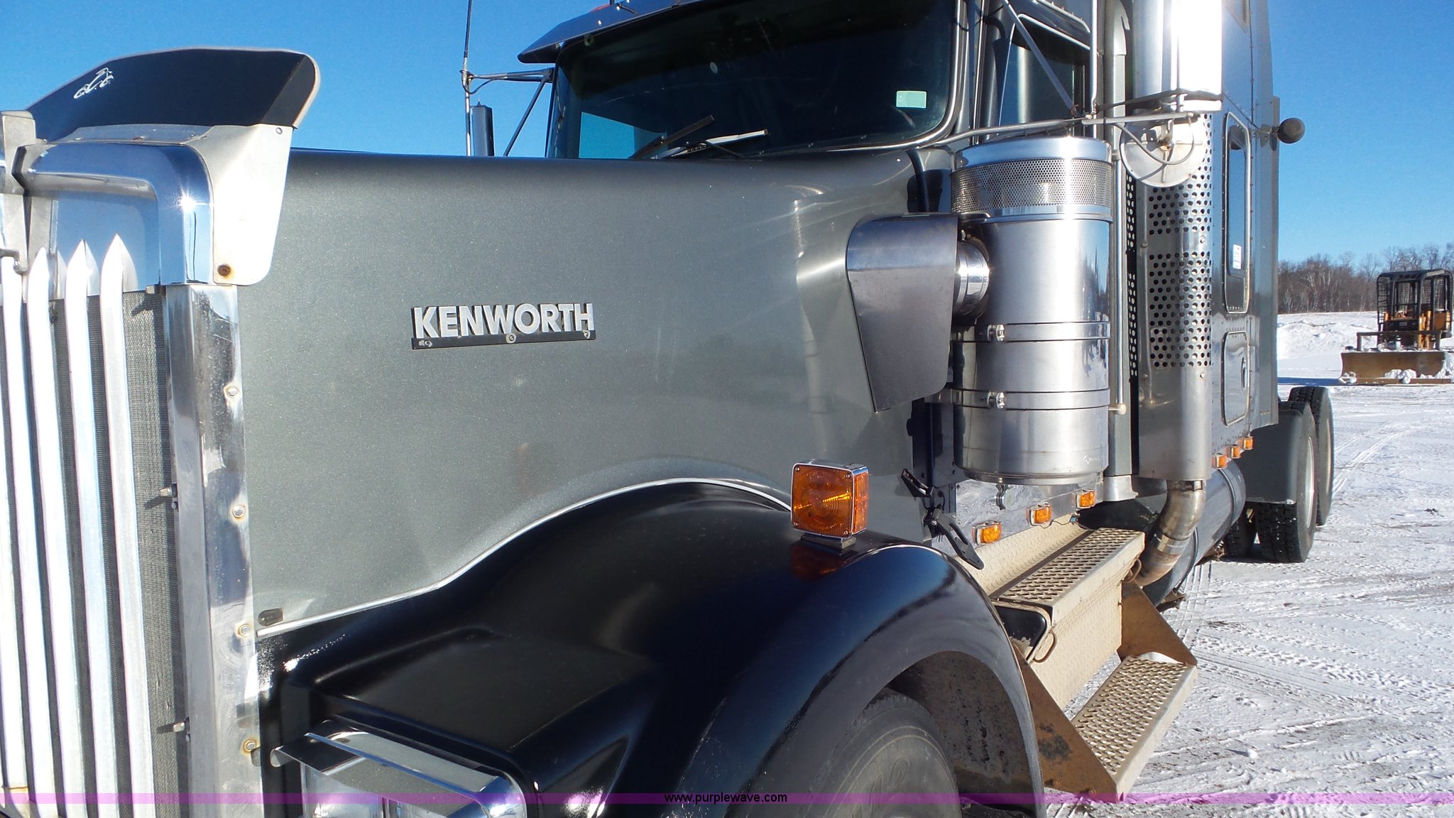 Purple Wave is selling a used Truck Tractor in Minnesota. This item is a 1999 Kenworth W900L semi truck with the following: 690,423 miles on odometer, Caterpillar 3406E 14.6L L6 turbo diesel engine, Eaton Fuller thirteen speed manual transmission, Tandem axle, Inter-axle differential lock, AC and heat, Tilt, Cruise, AM/FM/CD, Heated mirrors, Air suspension seat, Air ride cab, 60" sleeper, Single bed, Block heater, Dump valves, Dual front exhaust stacks, Aluminum headache rack, Steel deck plate, Air operated sliding fifth wheel plate, Dual fuel tanks, Quarter fenders, Mud flaps, Air suspension, Air brakes, Engine brake, 264" wheelbase, Aluminum wheels, 11R22.5 tires