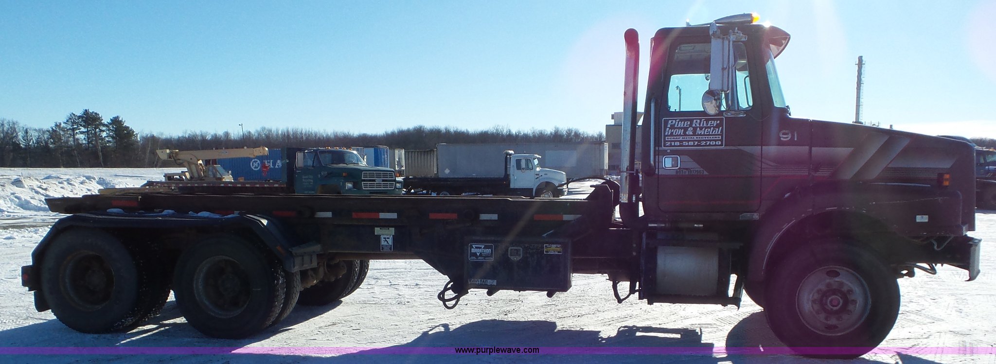 Purple Wave is selling a used Rollback or Tow Truck in Minnesota. This item is a 1991 Volvo WG cable rolloff truck with the following: 398,359 miles on odometer, 7,483 hours on meter, Volvo TD122 12.0L I6 turbo diesel engine, Eight speed manual transmission, Tandem axle, Full screw, AC and heat, AM/FM/CD, Power passenger window, Heated mirrors, Air suspension seat, Front tow hooks, Exterior visor, PTO, Marathon C3-174-EX rollback bed, (3) valve control, Single rear exhaust stack, Dual fuel tanks, Full fenders, Pintle hitch, 242" wheelbase, Camelback suspension, Air brakes, Engine brake, 315/80R22.5 front tires, 11R22.5 rear tires, Unit# 91