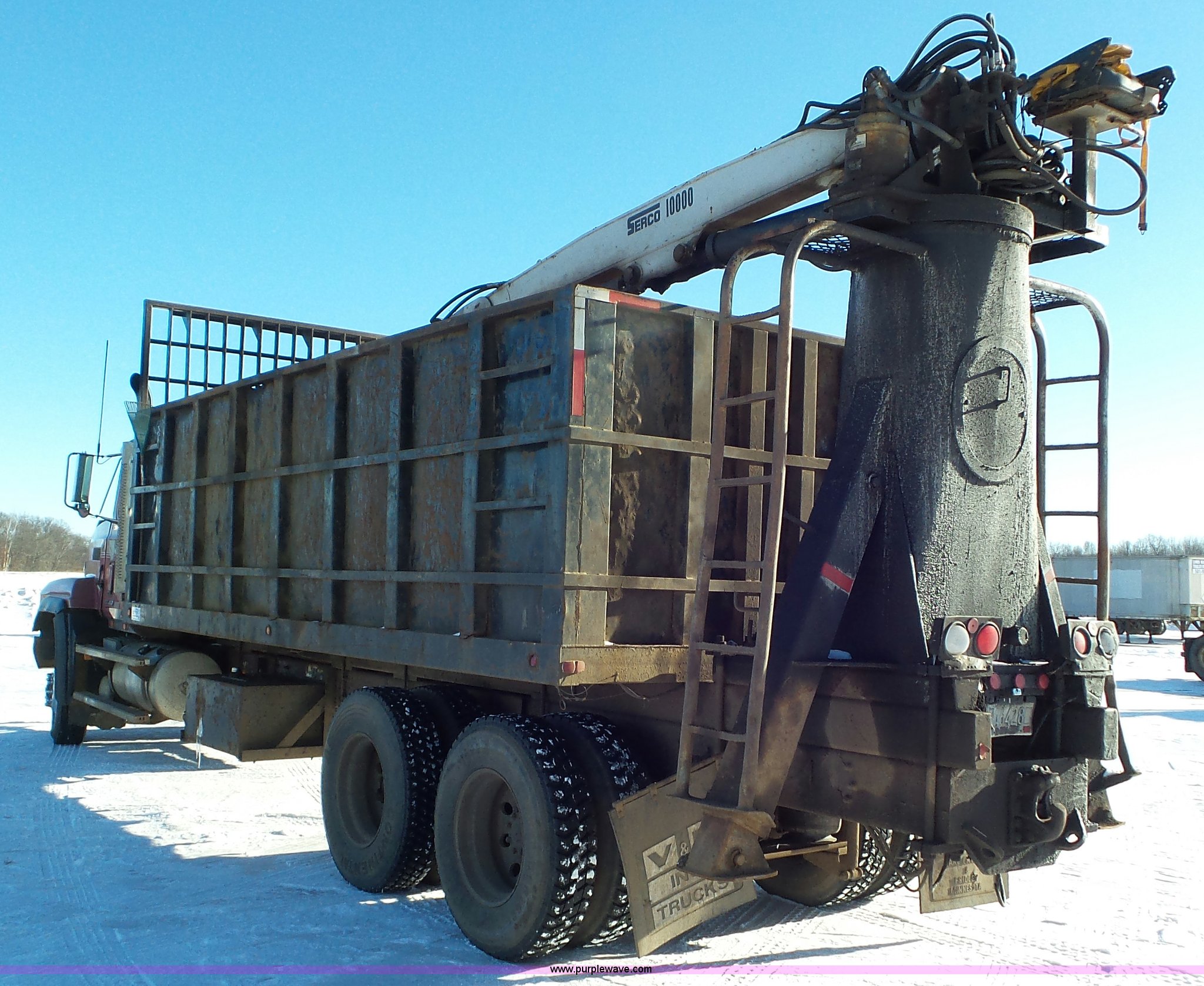 1999 Mack CL713 grapple truck. 383,233 miles on odometer, 23,060 hours on meter, Mack E7 12.0L L6 turbo diesel engine, Maxi torque nine speed manual transmission, Tandem axle, Inter-axle differential lock, AC and heat, Cruise, AM/FM/cassette, Heated mirrors, Spring suspension seat, Air ride cab, Block heater, Front tow hooks, Exterior visor, PTO, Dump valves, Serco 100G0 grapple bed 20'L box, (2) valve control, Grapple, Dual rear exhaust stacks, Dual fuel tanks, Mud flaps, 282" wheelbase, Air suspension, Air brakes, Engine brake, 11R22.5 tires. 1M2AD62C0XW008315. 19586 County Road 102. Ironton, MN 56455