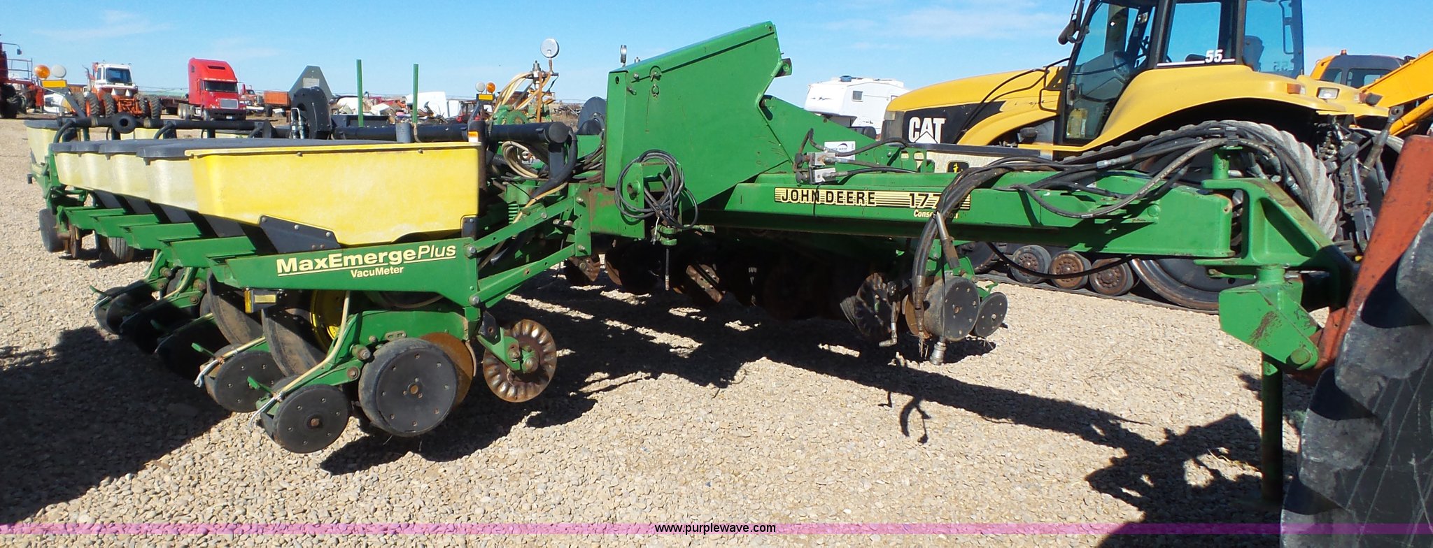 Purple Wave is selling a used Planter in Texas. This item is a John Deere 1770 Conservation Max Emerge planter with the following: 16 row, 30" spacing, Double hydraulic fold, Coulter, Double disk openers, Press wheels, Double closing wheels, Application tubes and system, Vacuum planter system, Trash disks, Transport lighting, Serial H01770A675211