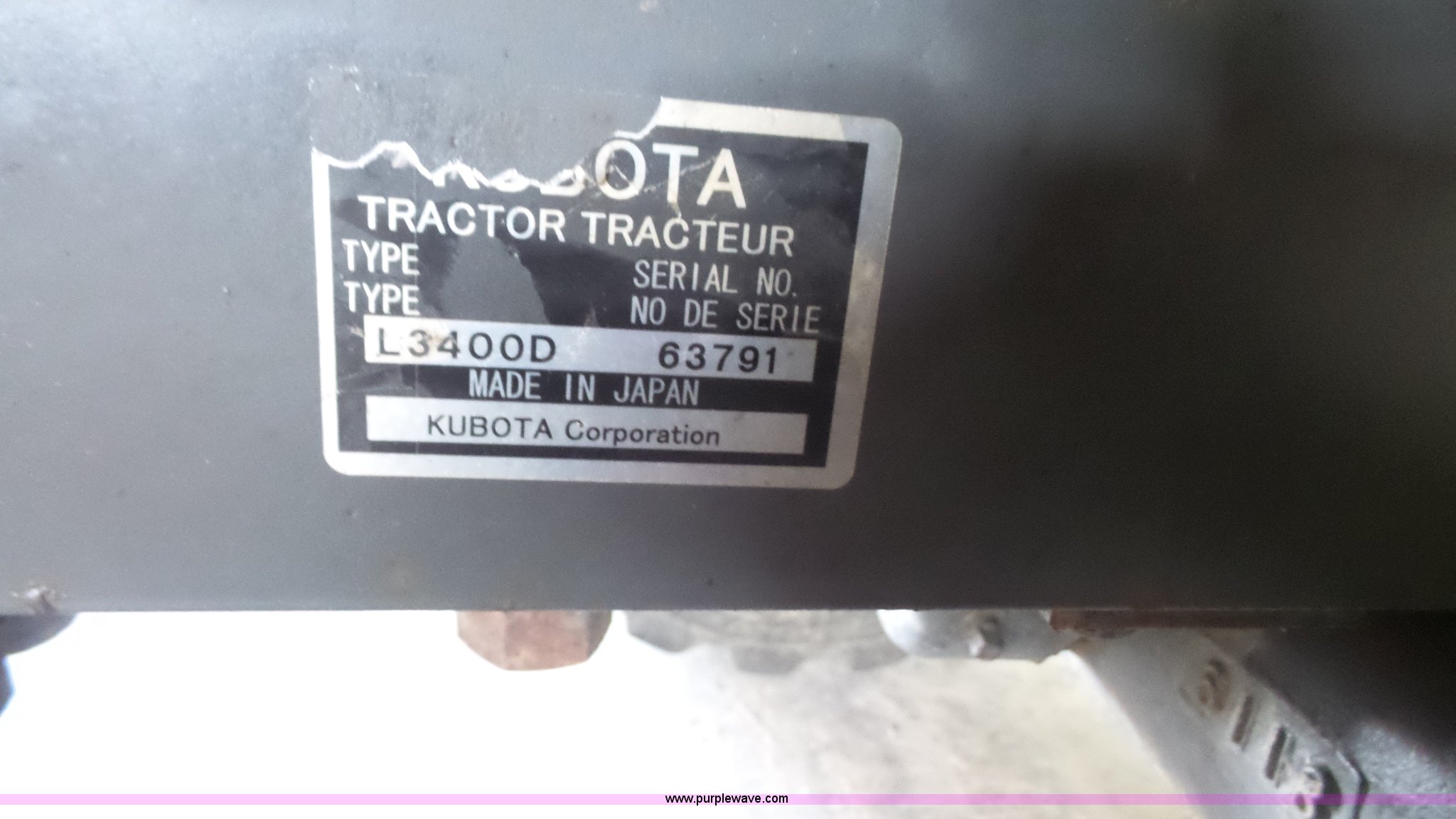 Purple Wave is selling a used Tractor in Missouri. This item is a 2007 Kubota L3400D MFWD tractor with the following: 1,034 hours on meter, Kubota 1.6L three cylinder diesel engine, 34.7 HP, Hydrostatic transmission, Three range, Suspension seat, Kubota LA463 loader, 60"W bucket, Joystick controls, Three point, 540 PTO, 27x8.50-15 front tires, 15x19.5 rear tires, Hood damage, Serial 63791