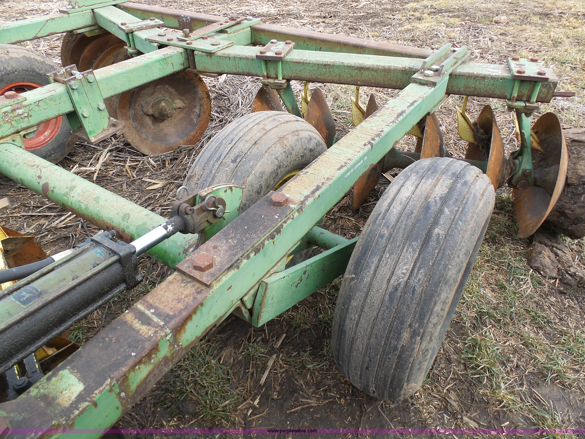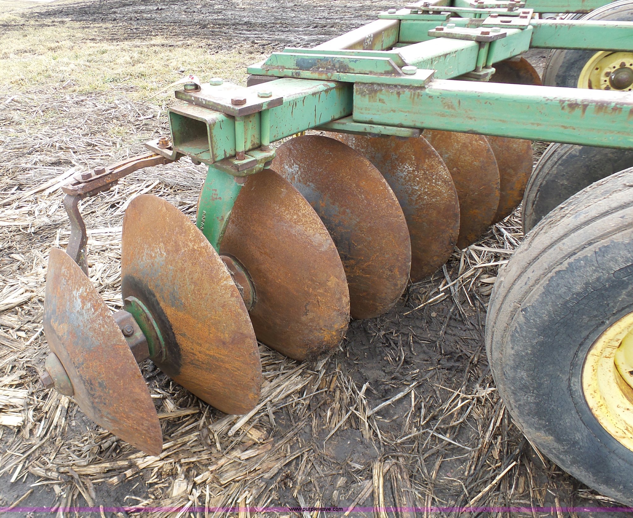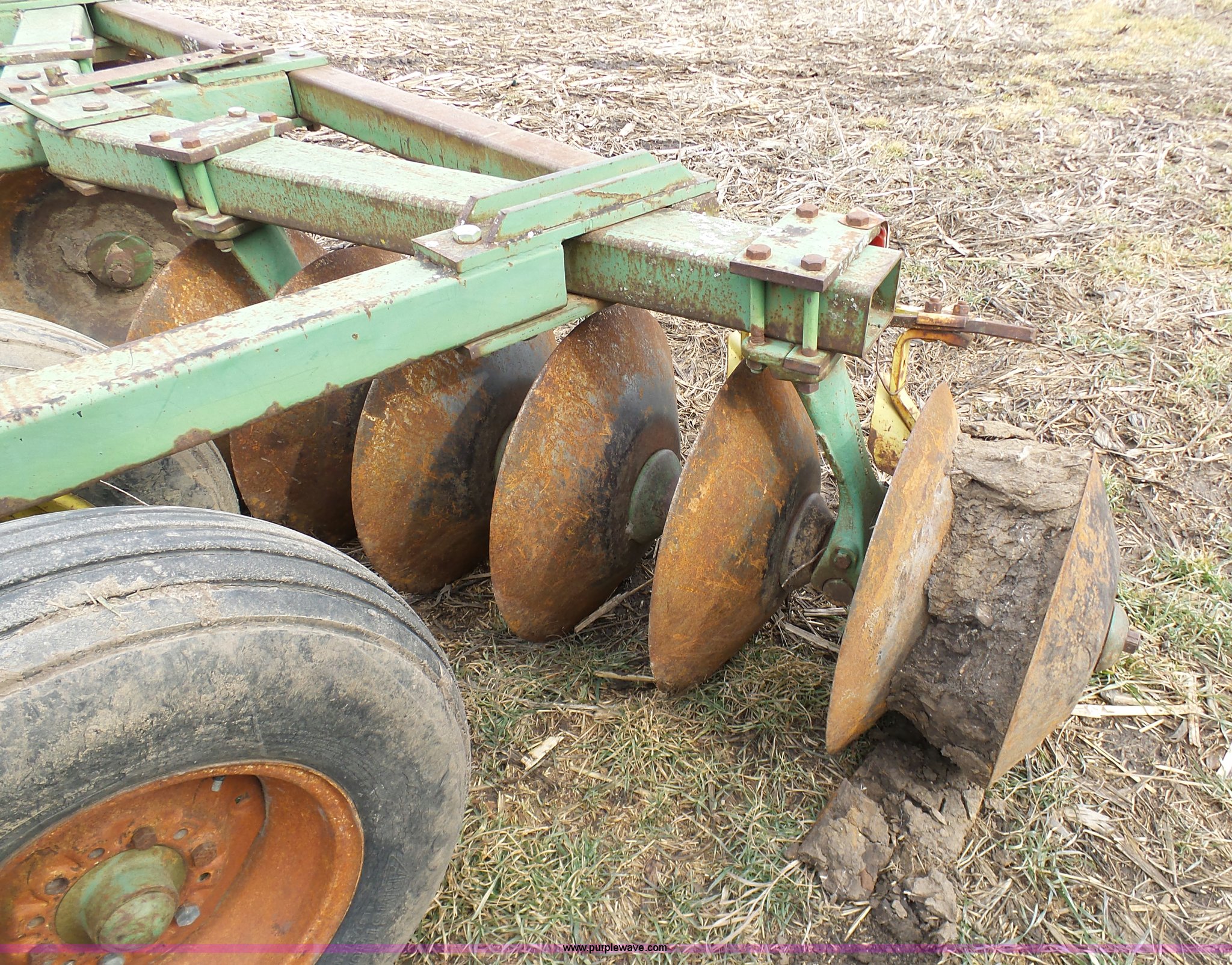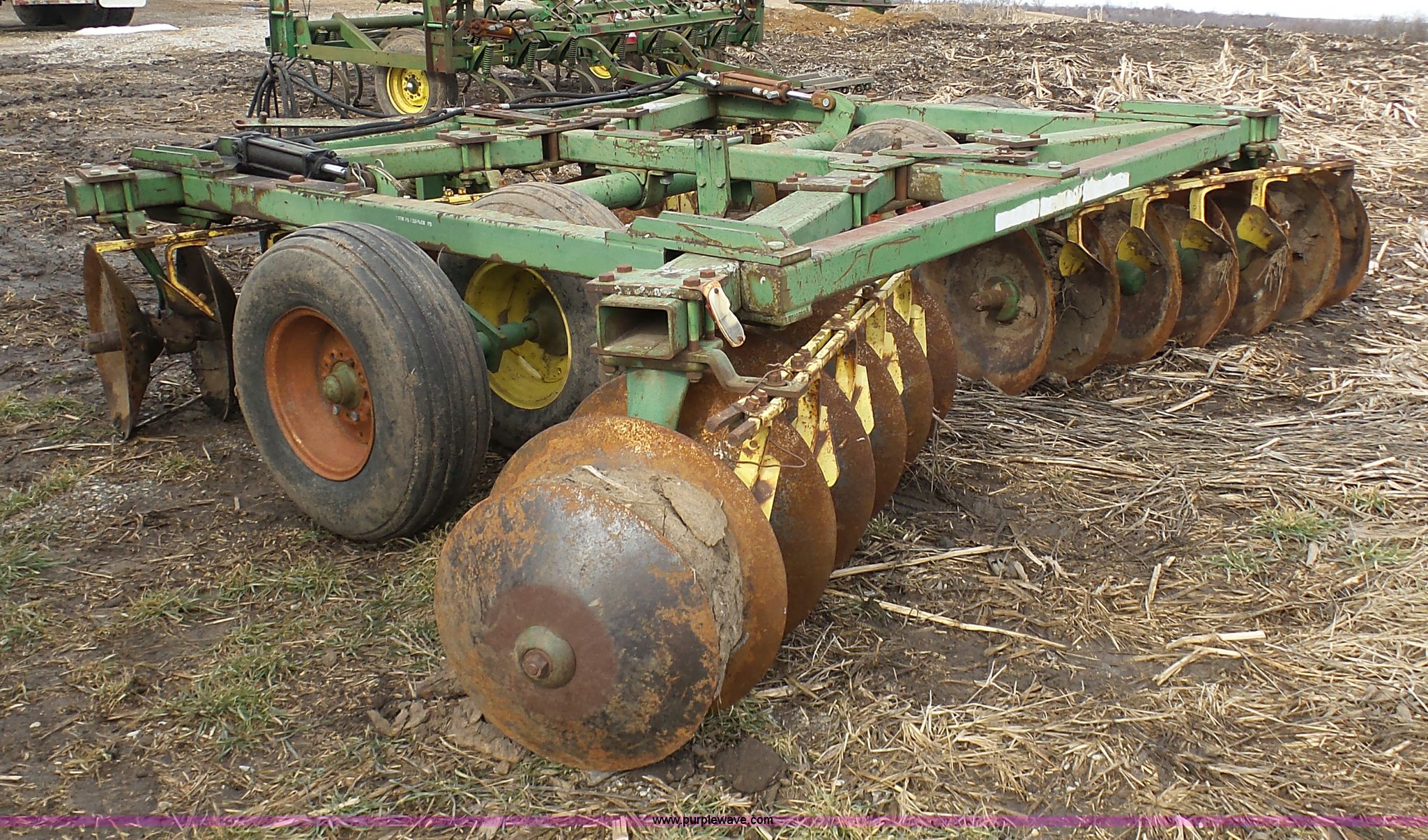 Purple Wave is selling a used Disk in Missouri. This item is a John Deere disk with the following: Approx. 13'W, Pin hitch, 11-15 tires