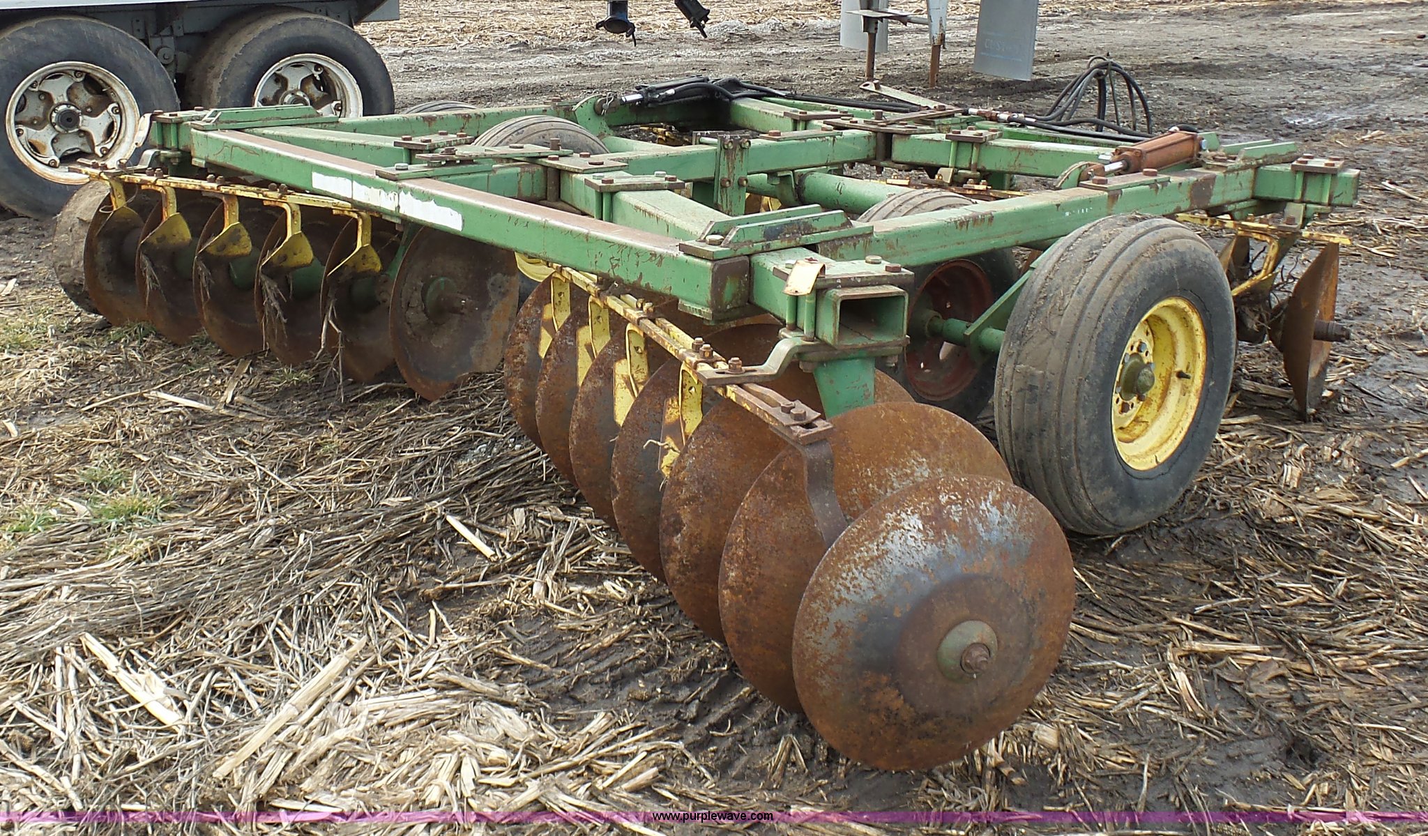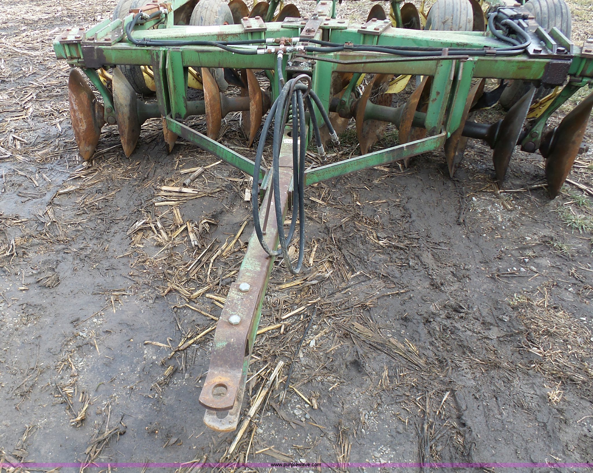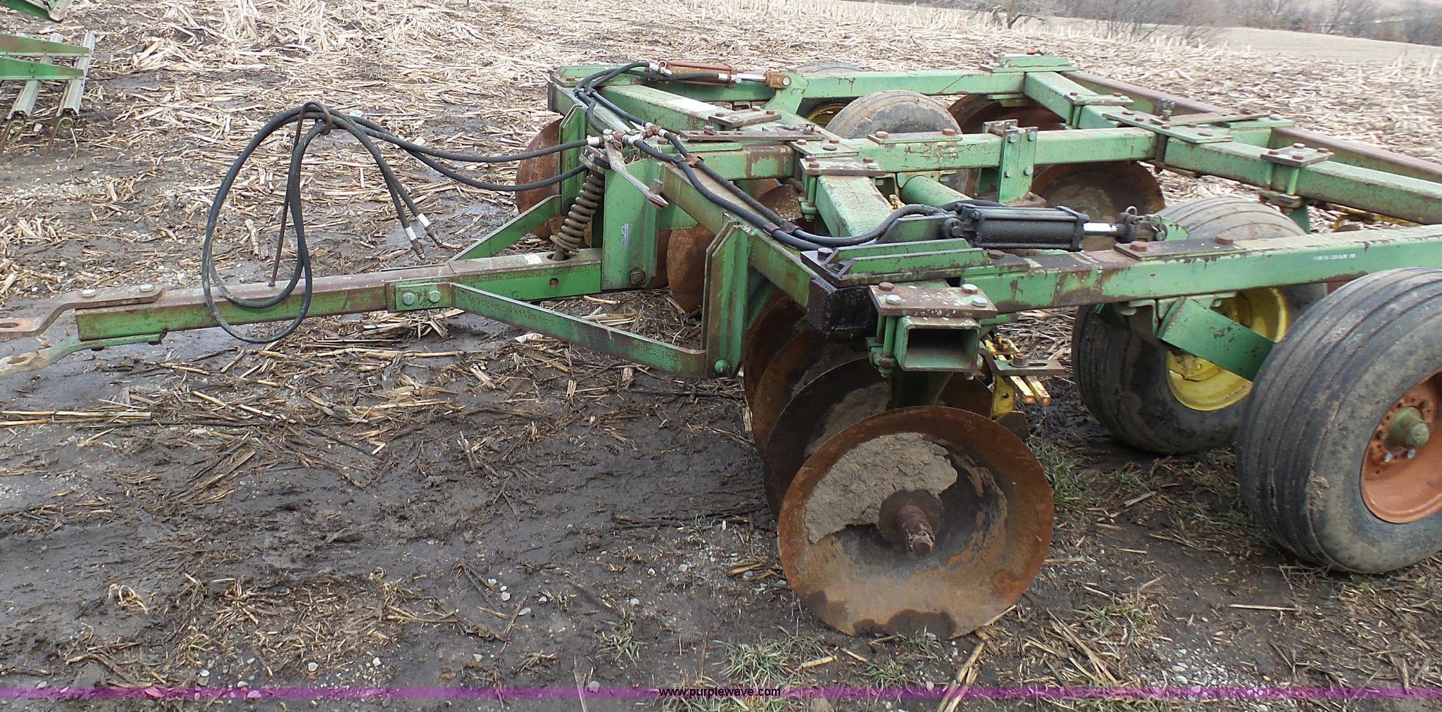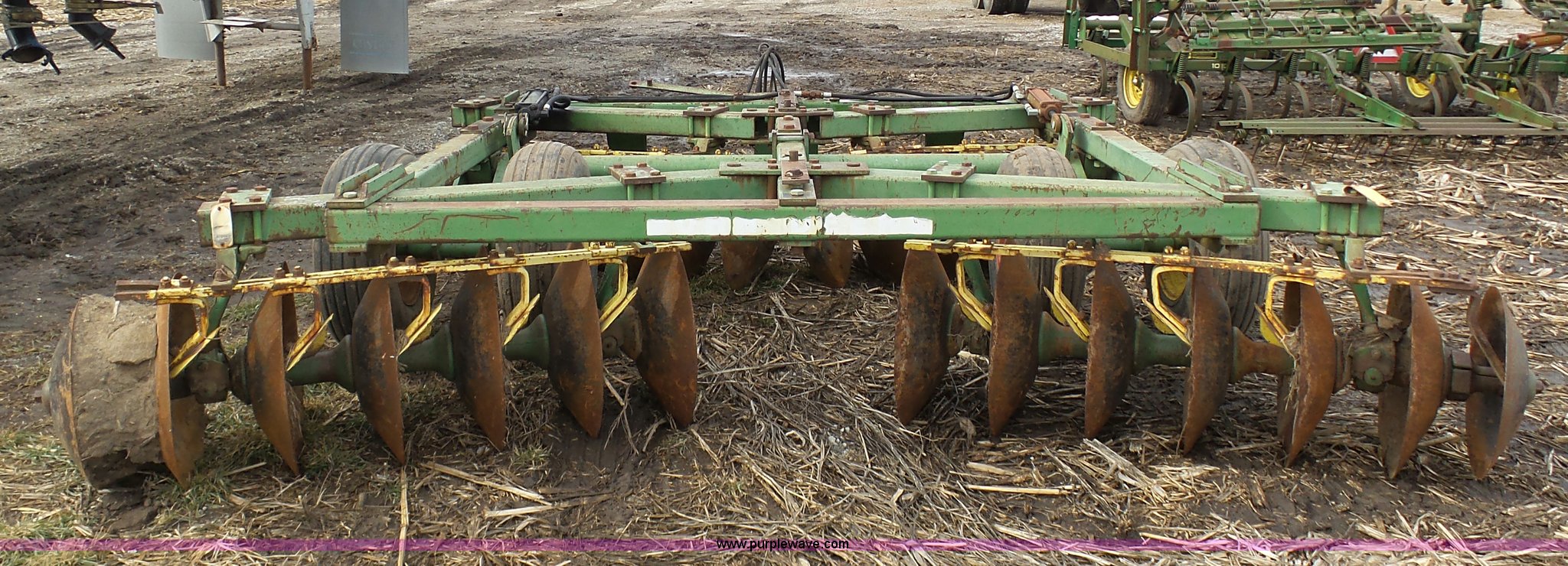 Purple Wave is selling a used Disk in Missouri. This item is a John Deere disk with the following: Approx. 13'W, Pin hitch, 11-15 tires