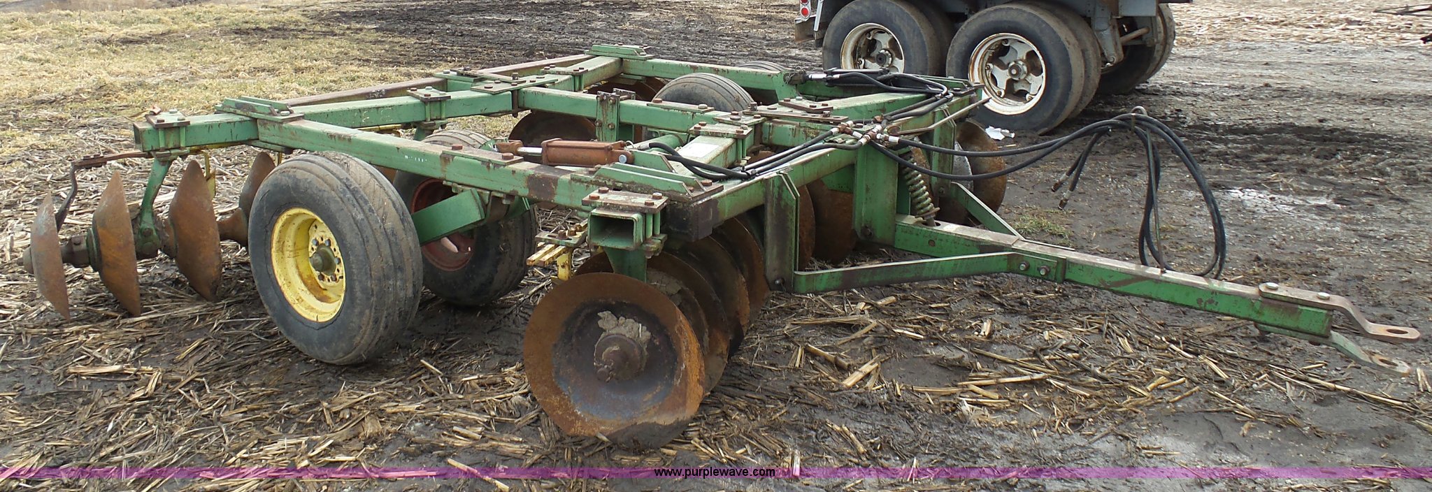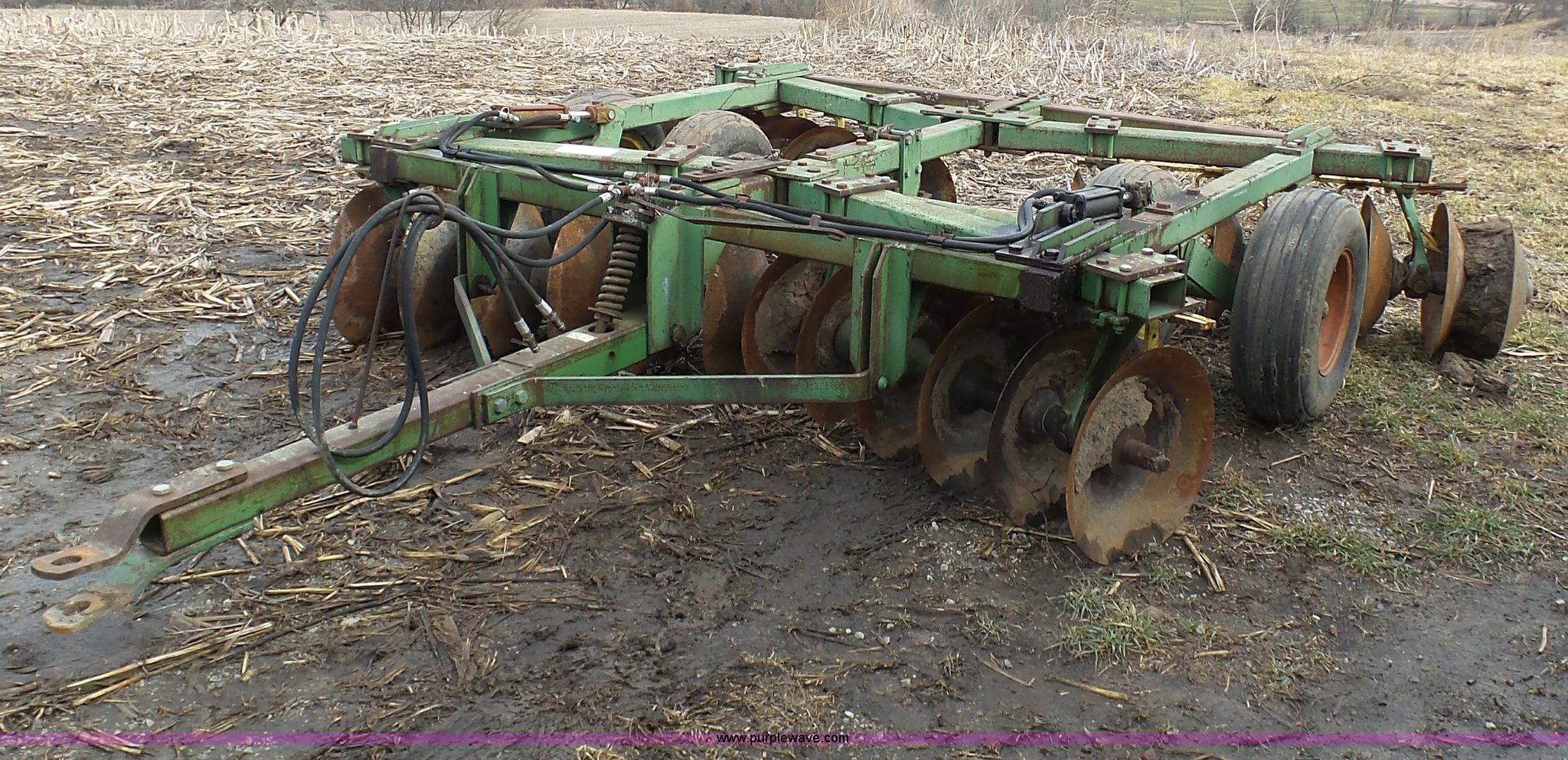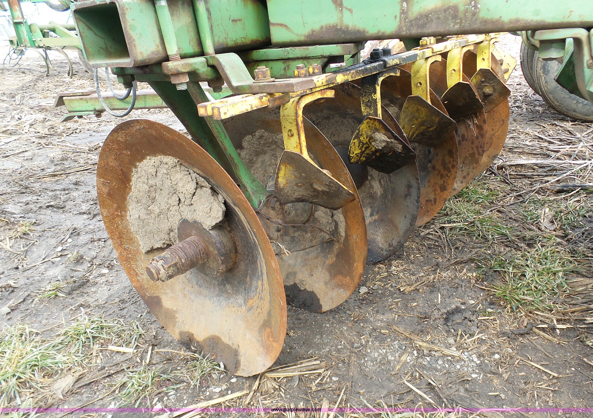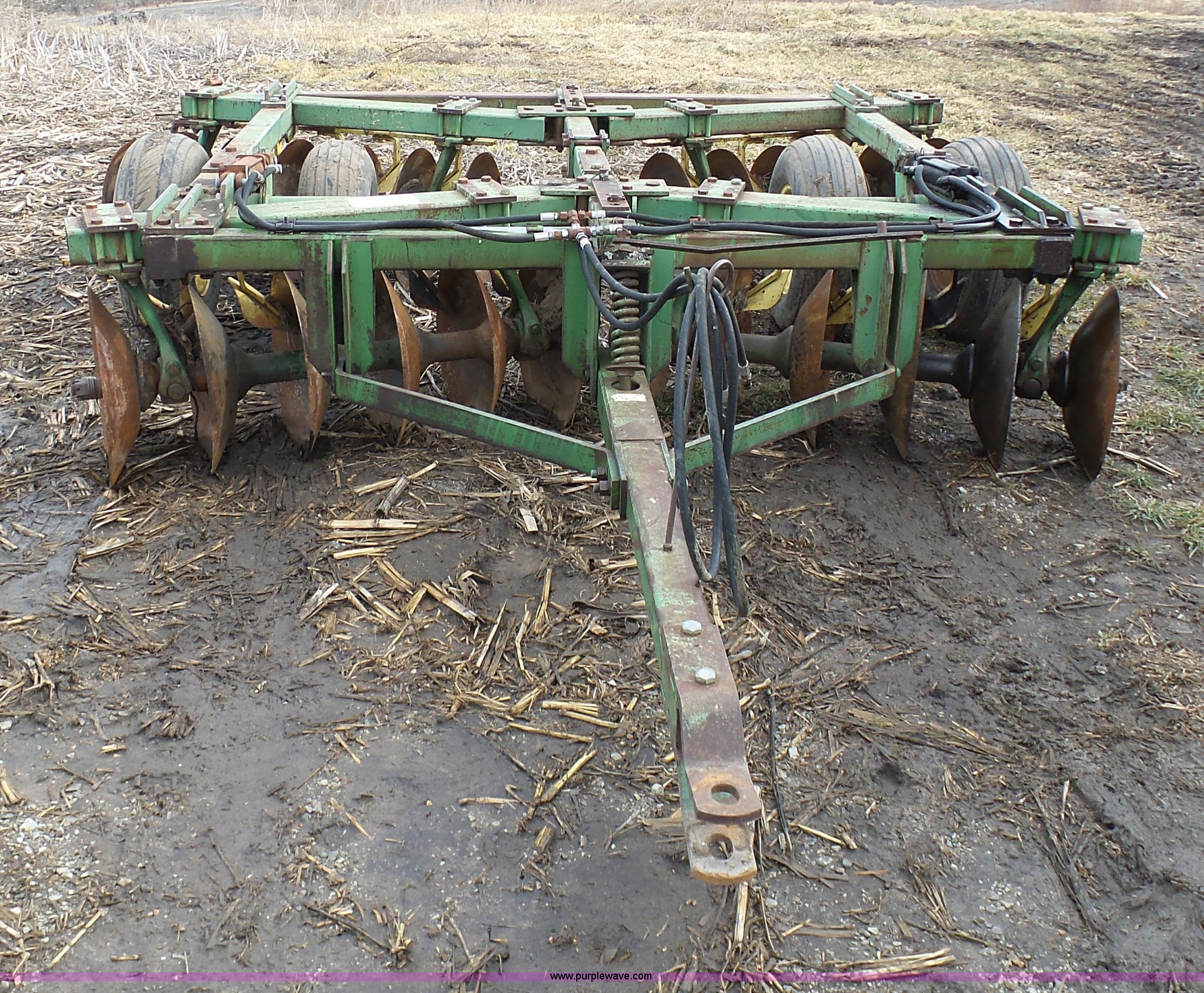 Purple Wave is selling a used Disk in Missouri. This item is a John Deere disk with the following: Approx. 13'W, Pin hitch, 11-15 tires