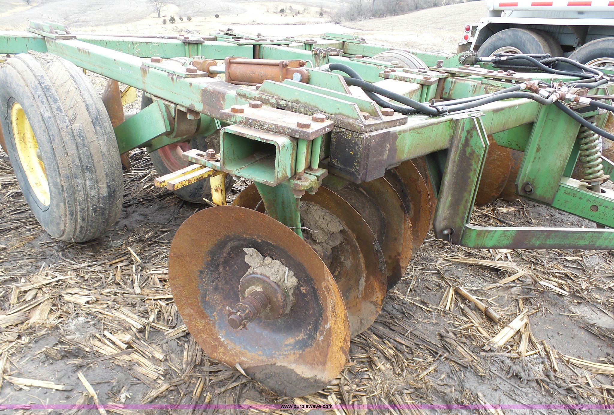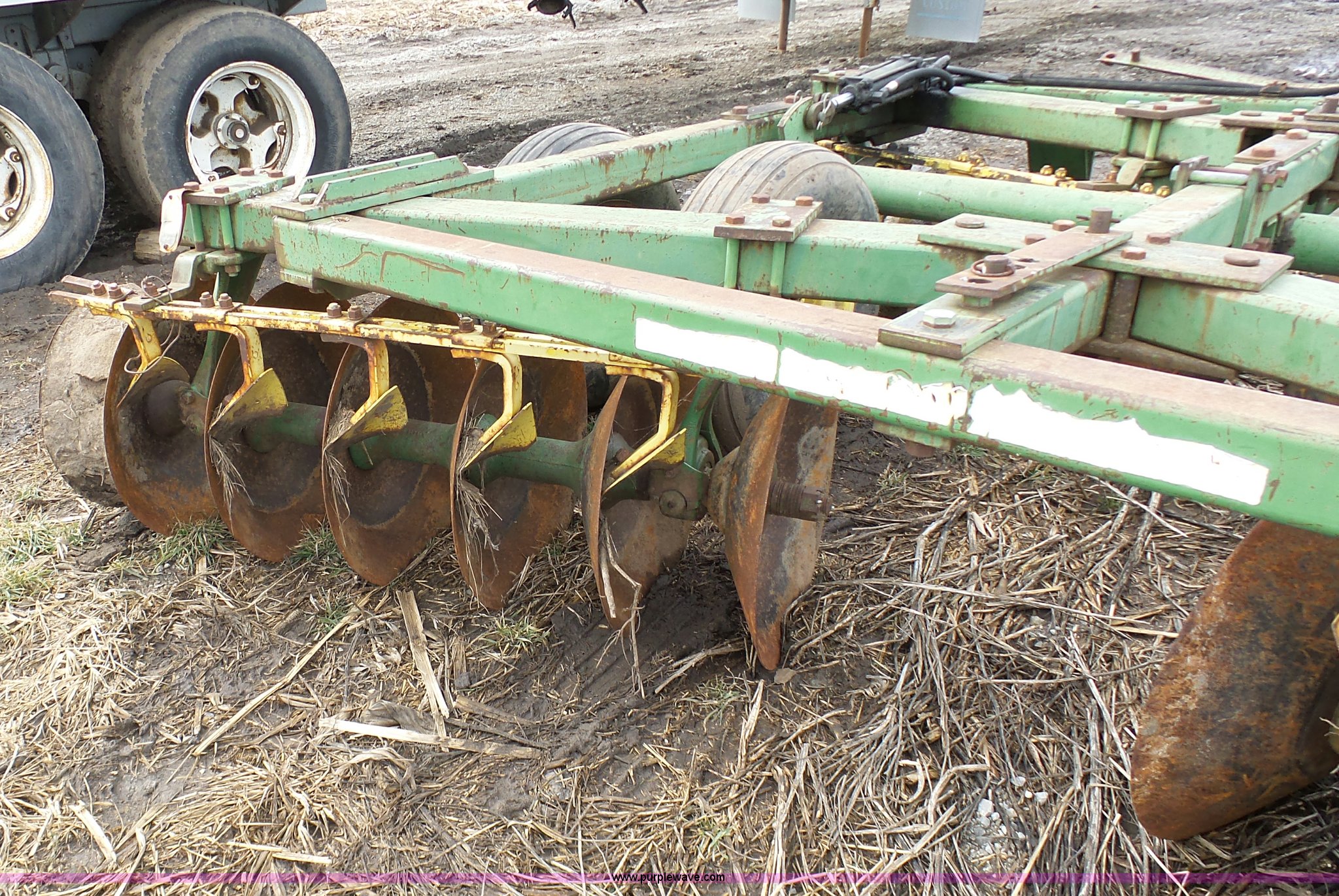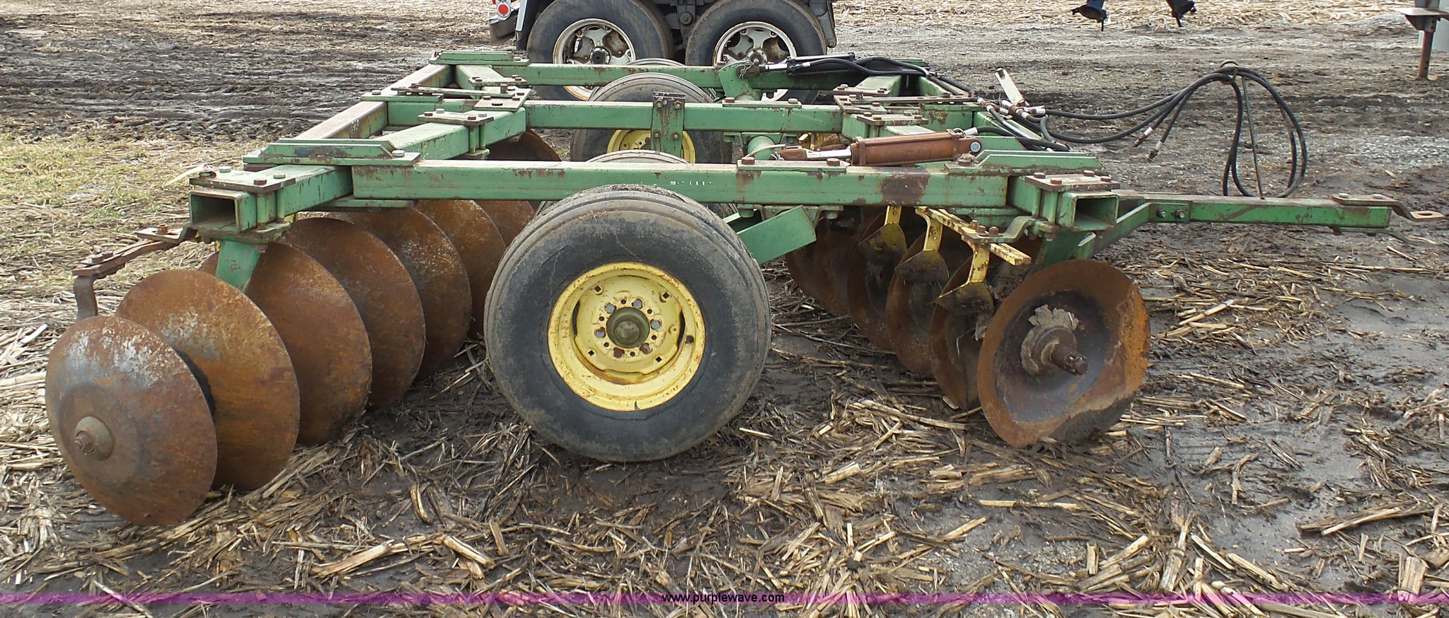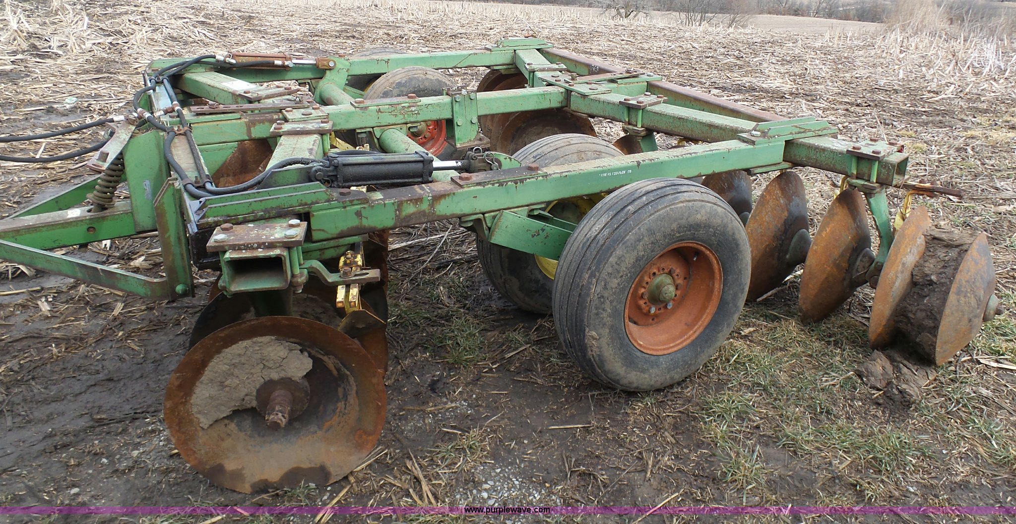 Purple Wave is selling a used Disk in Missouri. This item is a John Deere disk with the following: Approx. 13'W, Pin hitch, 11-15 tires