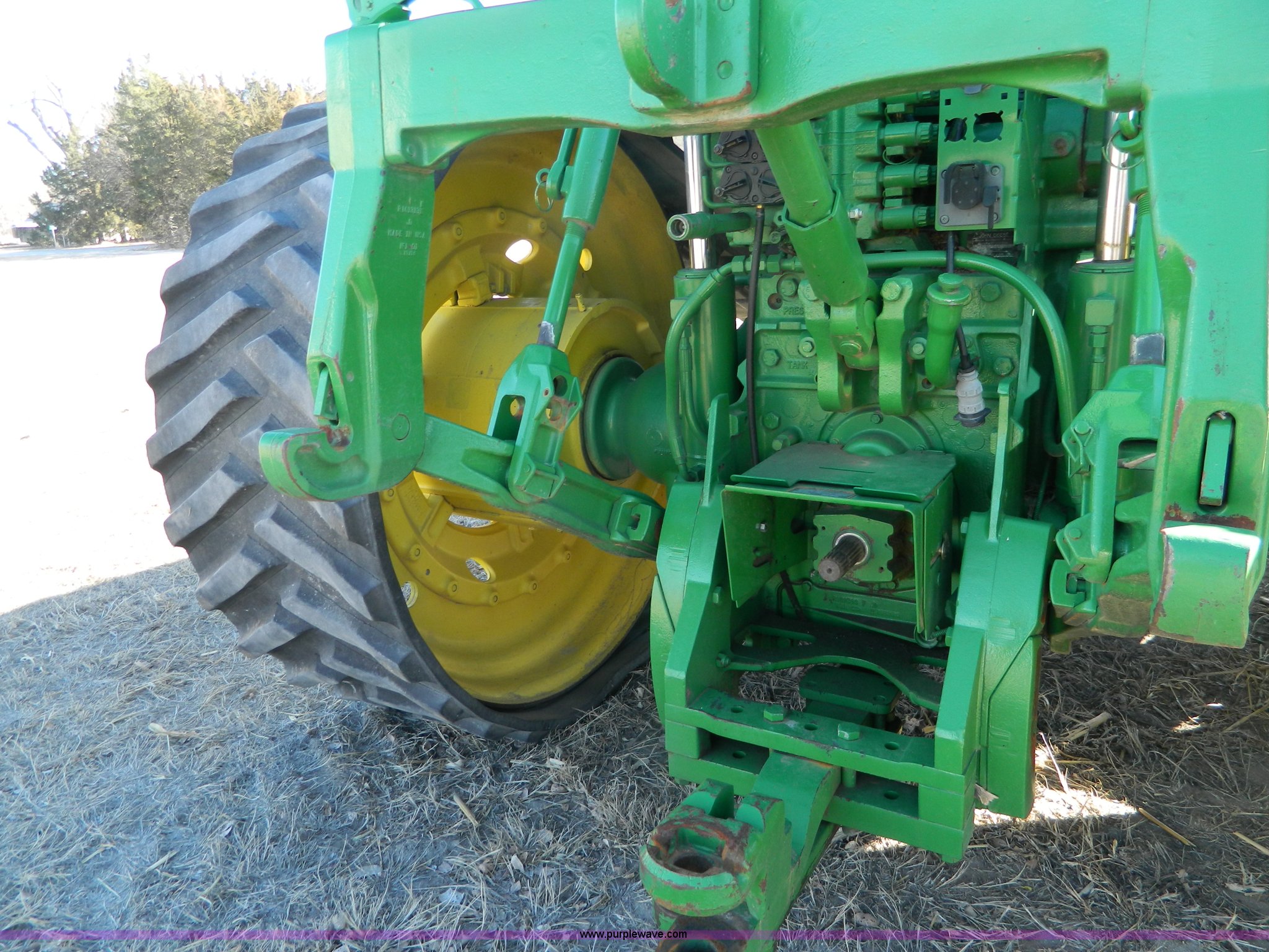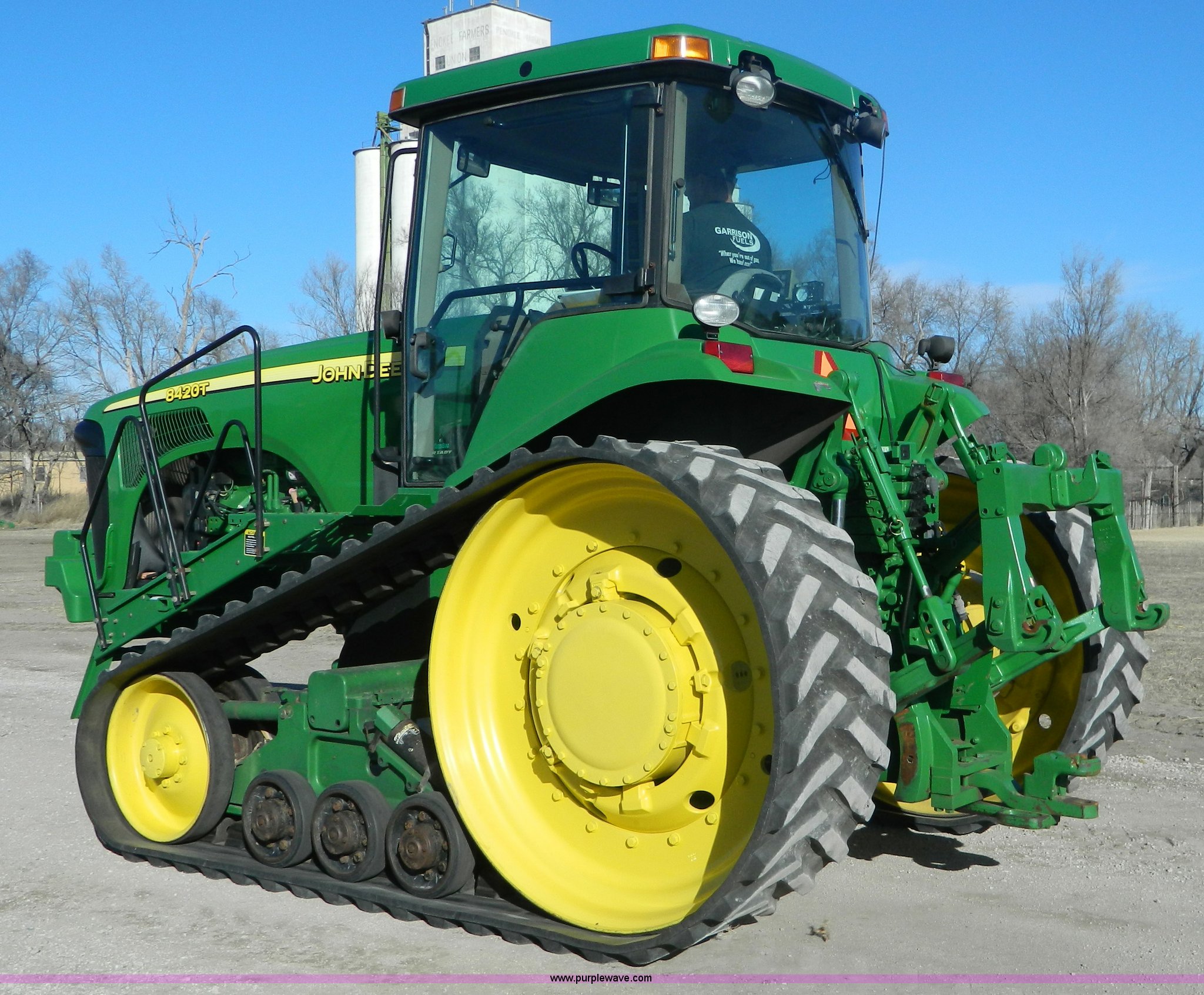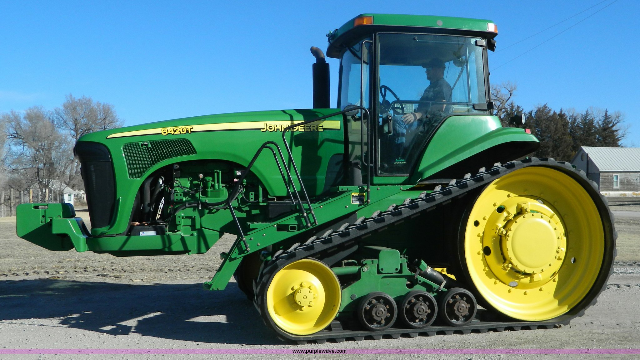 Purple Wave is selling a used Tractor in Kansas. This item is a 2004 John Deere 8420T tractor with the following: 4,775 hours on meter, John Deere 8.1L six cylinder turbo diesel engien, 270 HP, Serial RG6081H233610, Powershift transmission, 16F-4R gears, AC and heat, Tilt steering wheel, AM/FM, Air suspension seat, Shade, Block heater, Three point, Top link, Quick attach, Seven pin outlet, ISO electrical outlet, Rear hydraulic remote sets, (8) suitcase weights, 25"W tracks, Monitors not included, Serial RW8420T903026