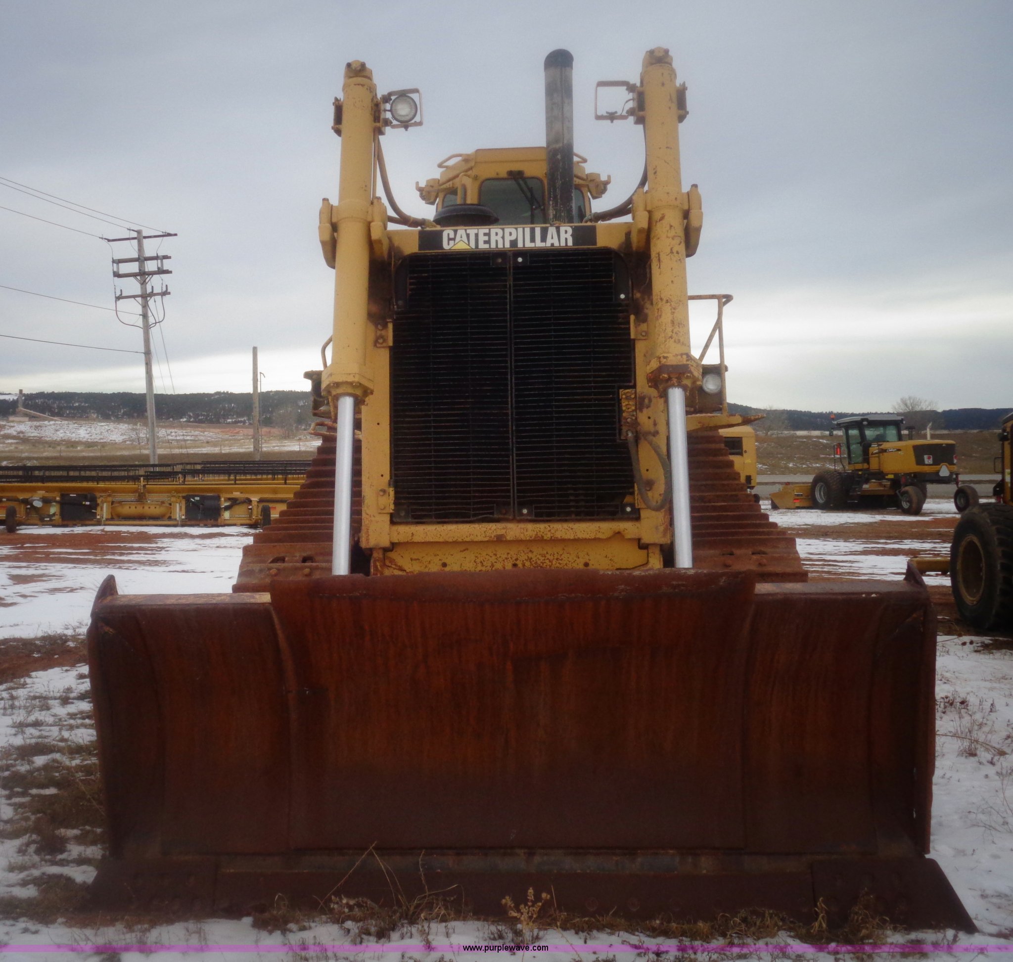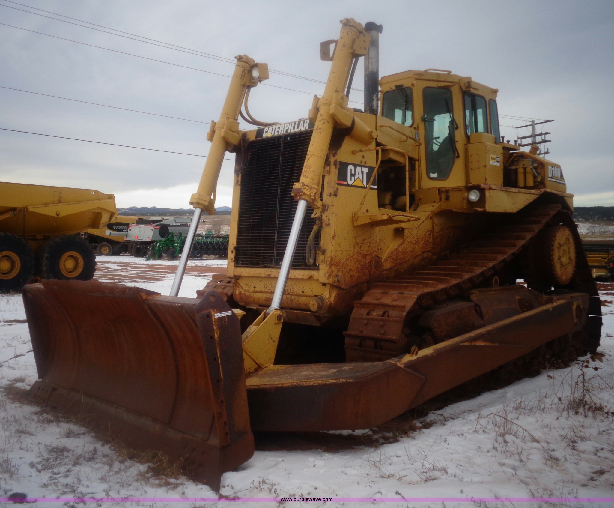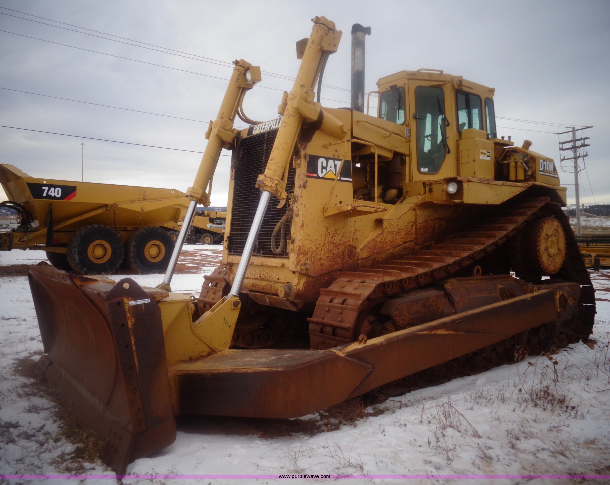 Purple Wave is selling a used Crawler Dozer in South Dakota. This item is a 1993 Caterpillar D10N dozer with the following: 37,750 hours on meter, Caterpillar 3412 diesel engine, 520 HP, Powershift transmission, 3F-3R gears, AC and heat, Clutch brake steering, Bull Dozer 90 straight dozer blade, Dozer cushion blade, Serial 4562296, CAT U shaped tilt blade, Model 10 SU, 15'2"W x 90"H, Added reinforcement steel, Serial 1RH01299, Ripper, One shank, 24"W tracks, 132,605 lbs. base operating weight, (2) lights missing, Rear window cracked, View track inspection, Serial 2YD02500