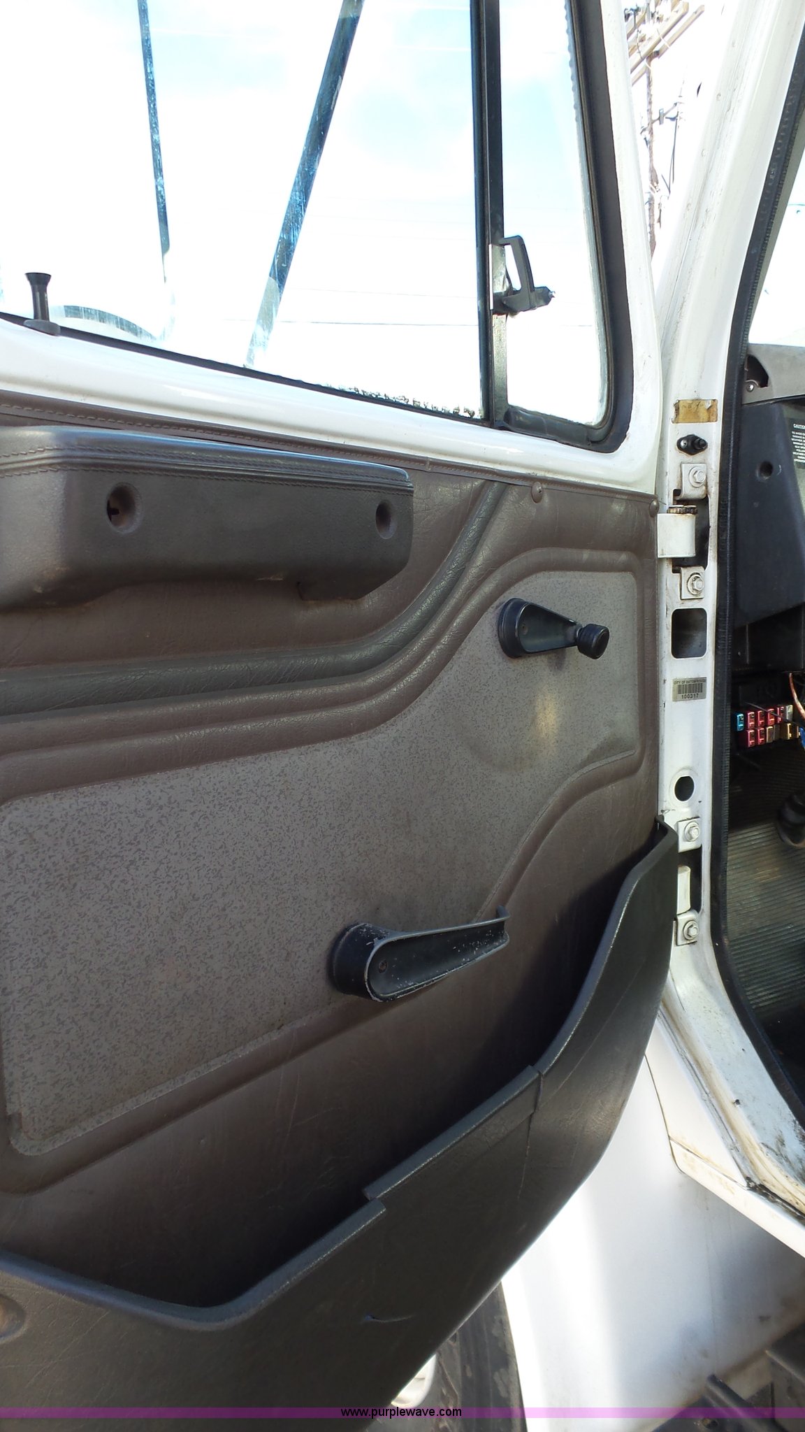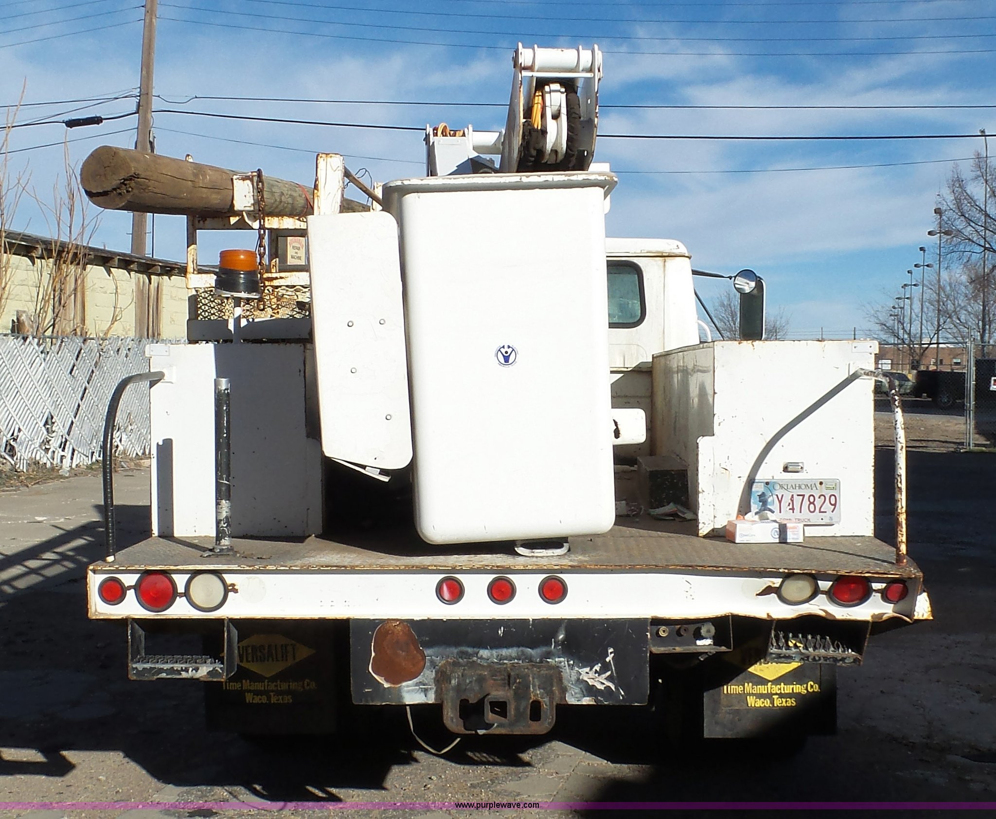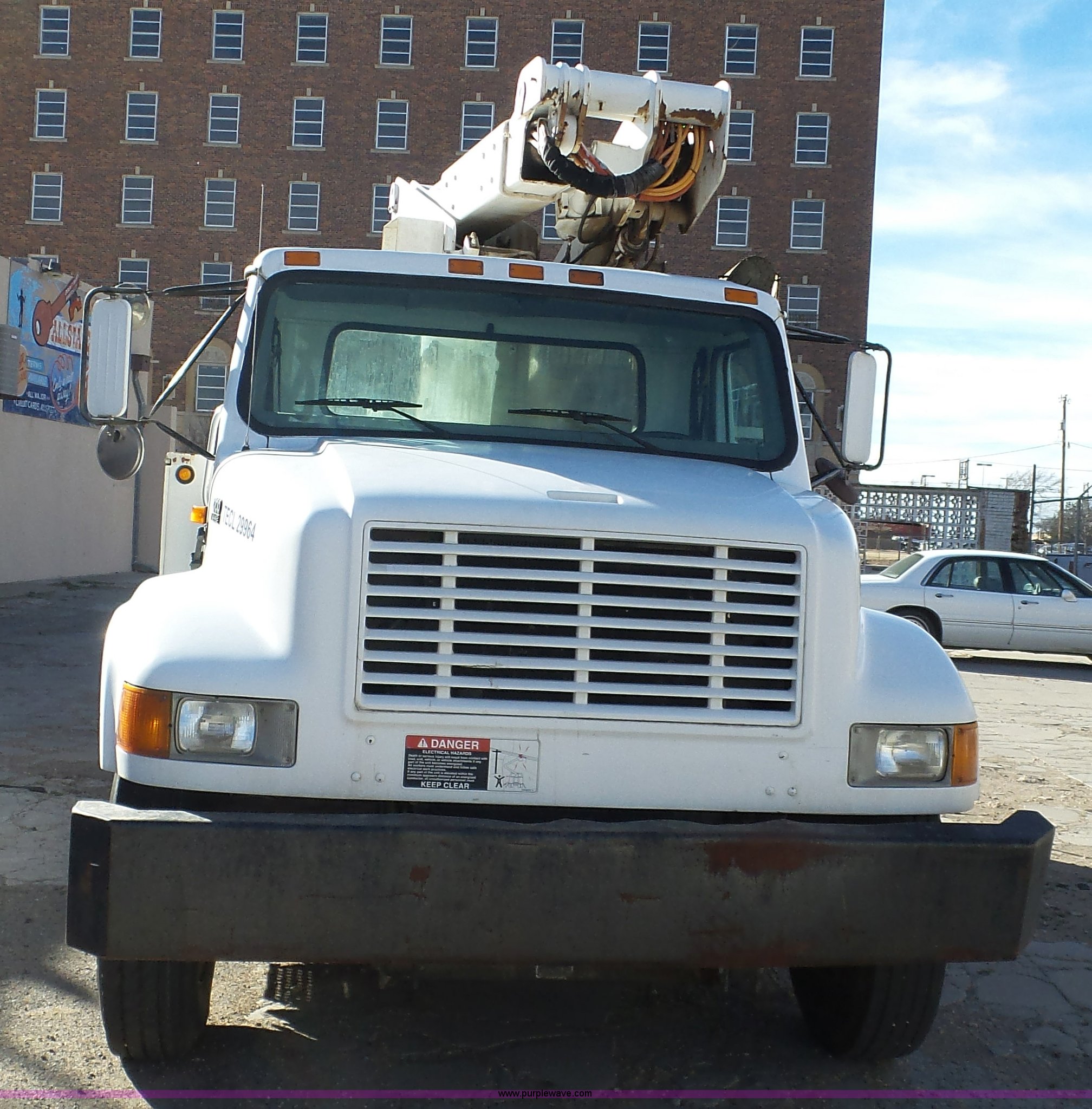 Purple Wave is selling a used Bucket Truck in Texas. This item is a 2001 International 4700 bucket truck with the following: 147,370 miles on odometer, 12,110 hours on meter, International T444 7.3L V8 turbo diesel engine, Automatic transmission, AC and heat, AM/FM, Spring suspension seat, Service bed, Shelving, Utility rack, Receiver hitch, 2000 Versalift VST236 boom, Serial DC0041, 40' boom length, 350 lbs maximum lift capacity, Man basket, Boom rotation, Pole guide, Articulating boom, Single fuel tank, 152" wheelbase, Spring suspension, Air brakes, 10R22.5 tires, GVWR 25,500 lbs